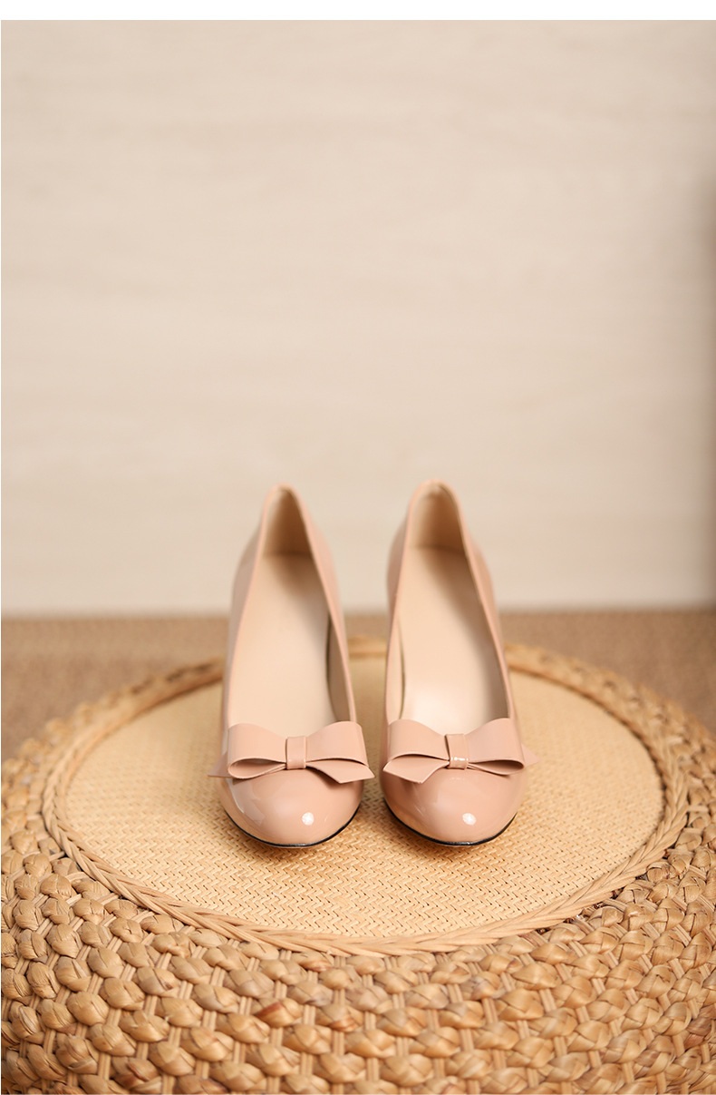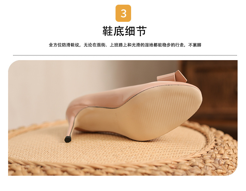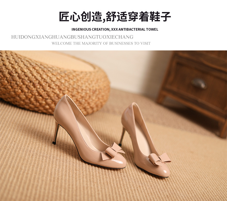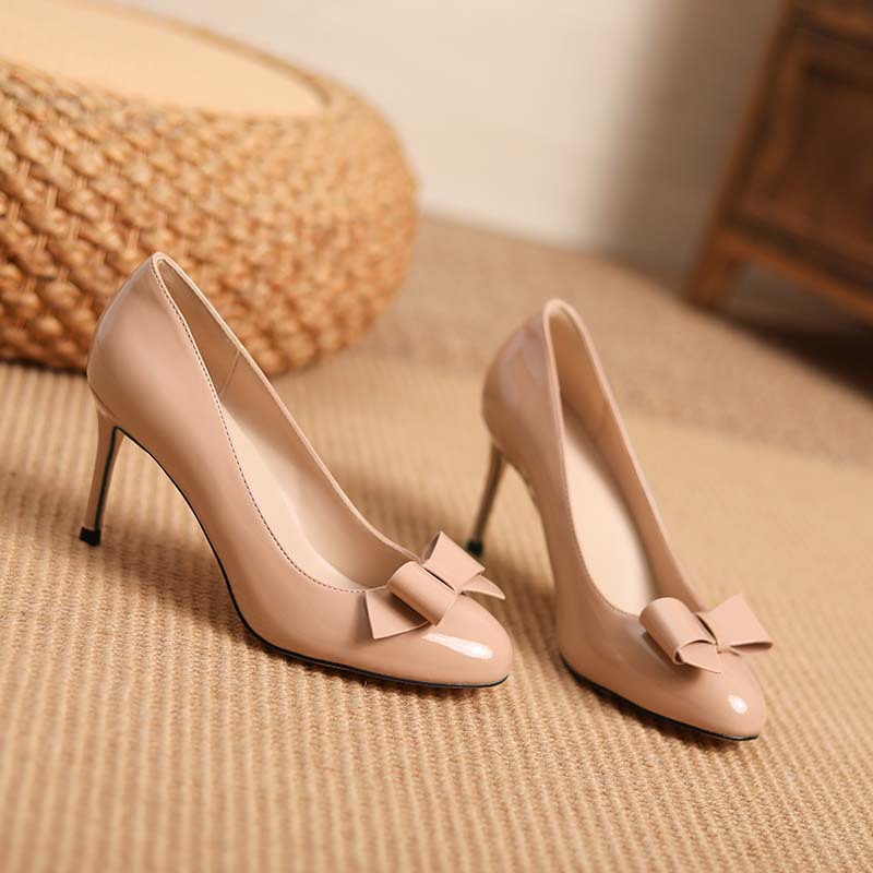 누드 컬러 특허 가죽 하이힐 여름 스틸레토 힐 여성 신발 피곤하지 않은 발 기질 사교계 얕은 활 라운드 발가락 신발 여성스토어 가기