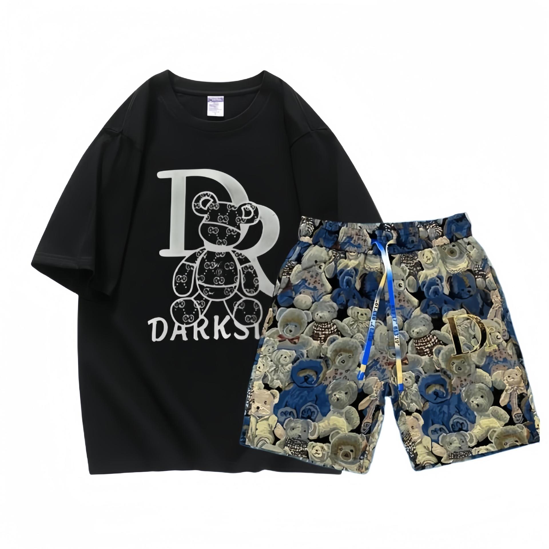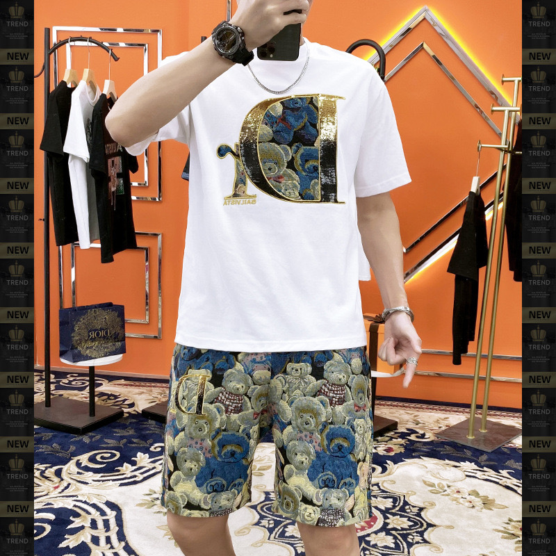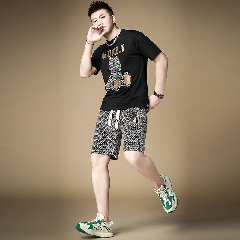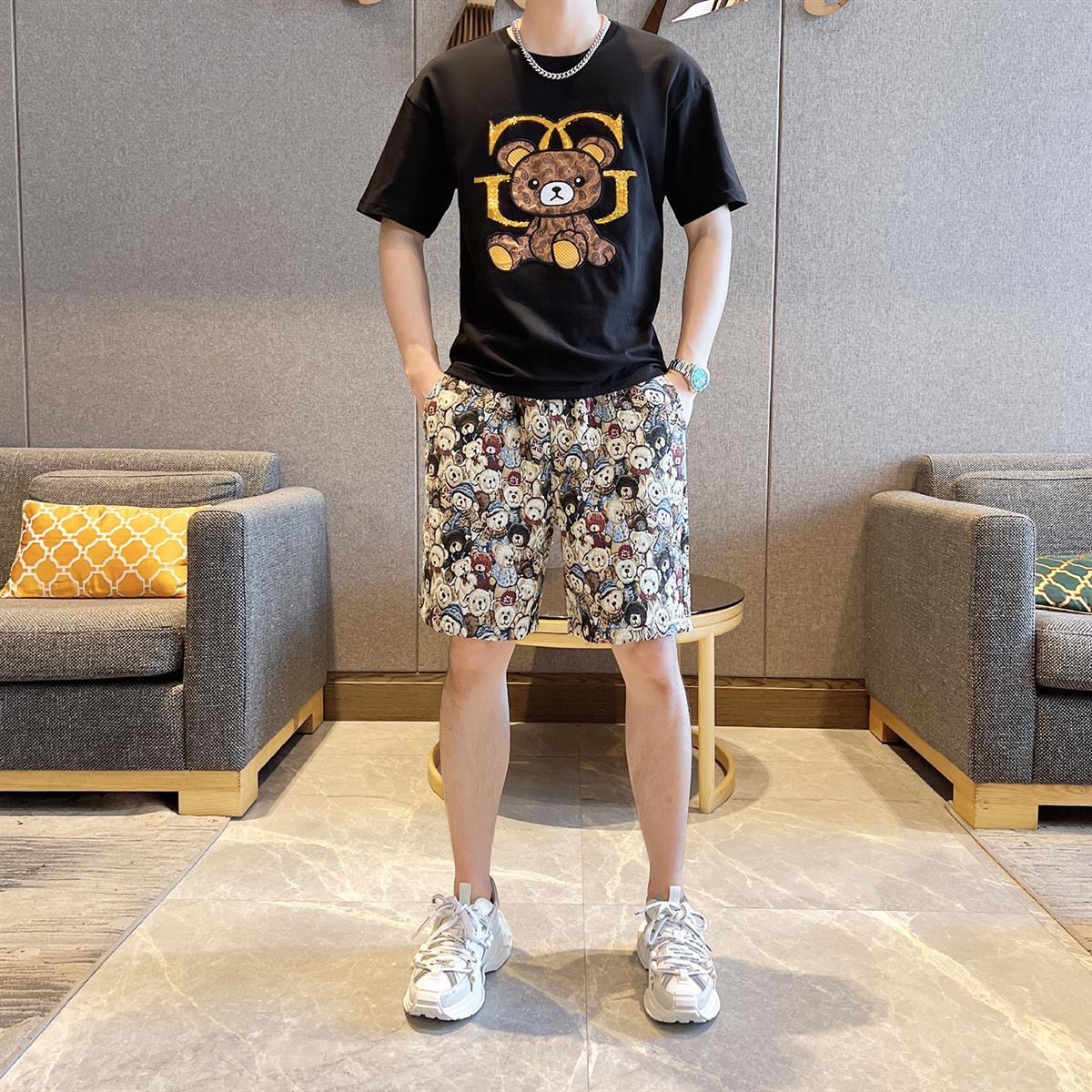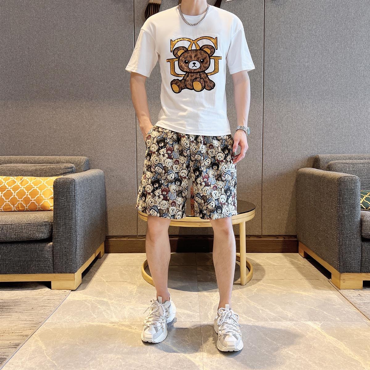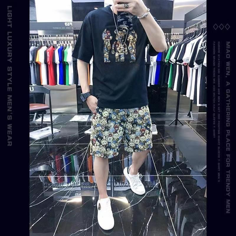 대외 무역 여름 남성 패션 트렌드 정장 맞춤형 곰 티셔츠 반바지 라운드 넥 느슨한 영국 투피스 세트
