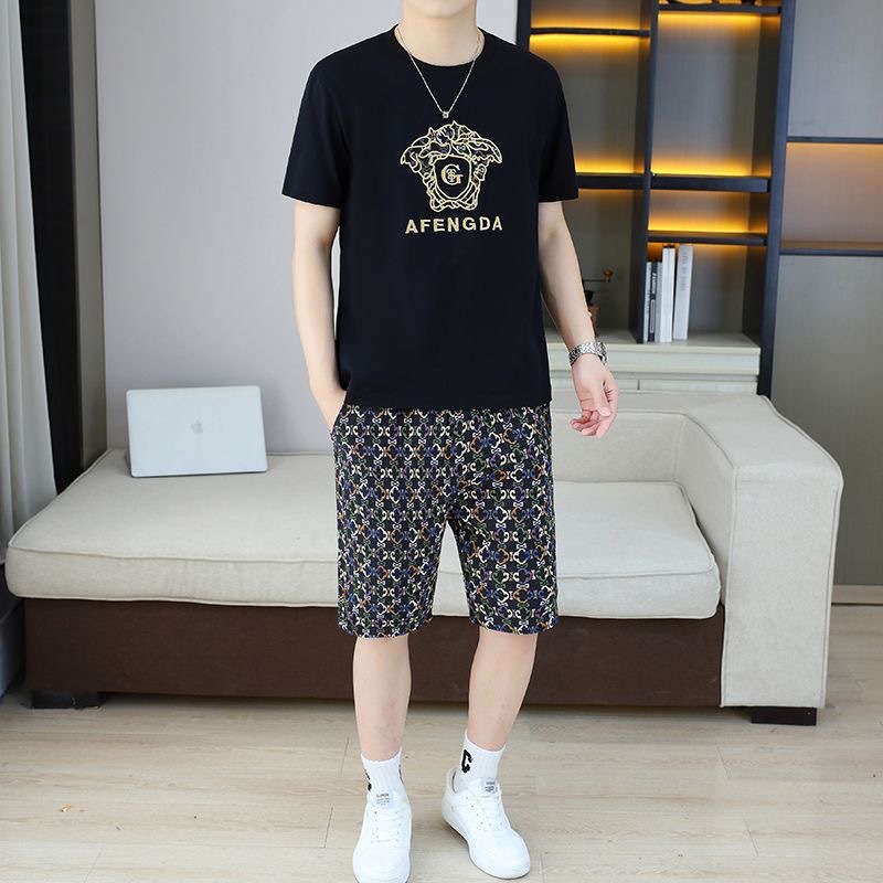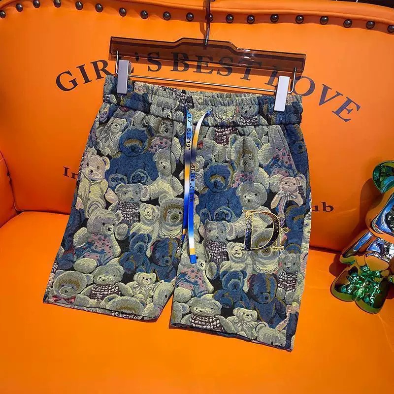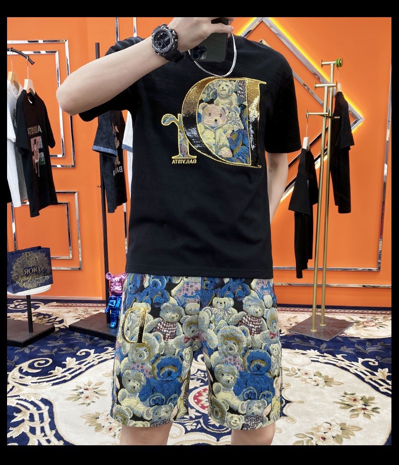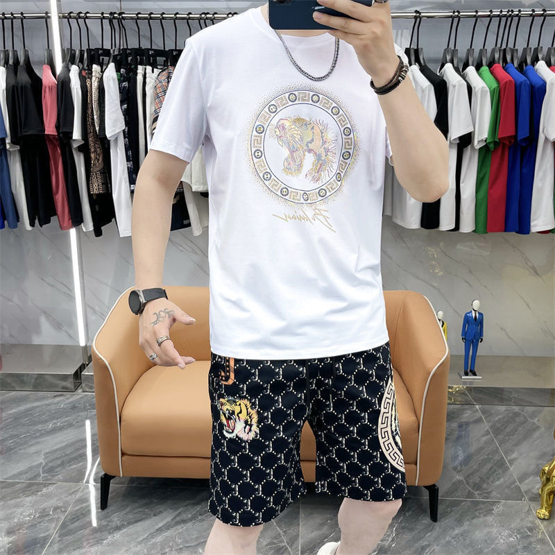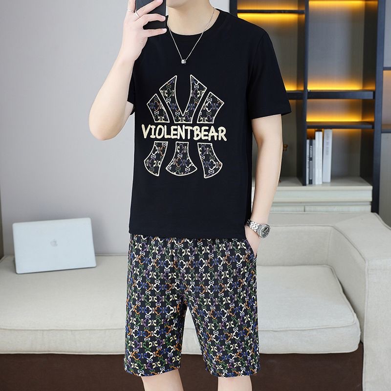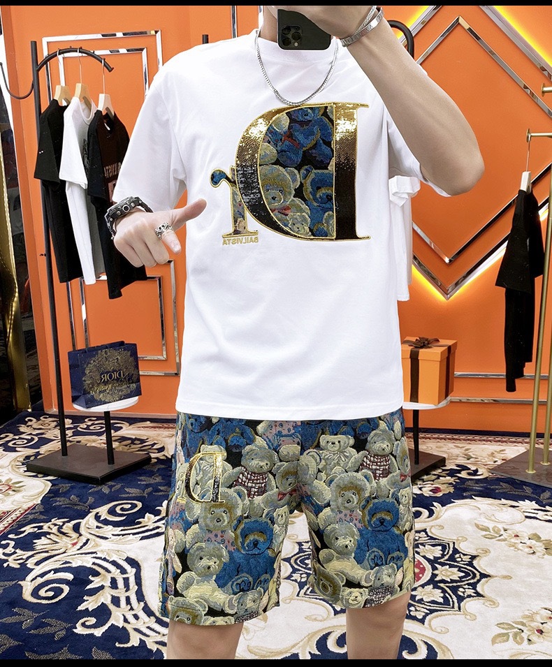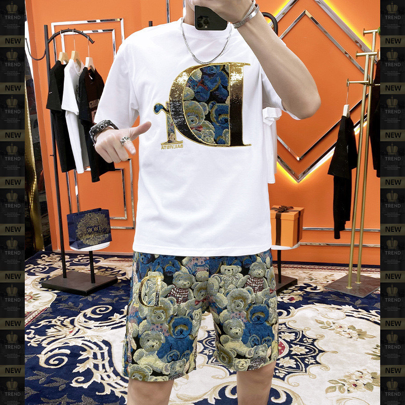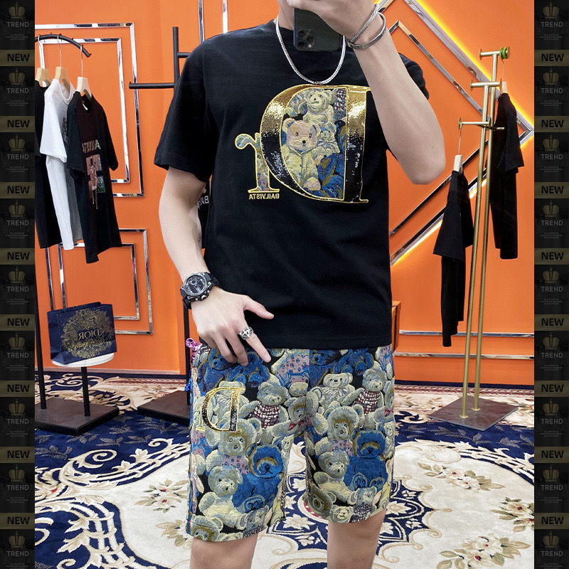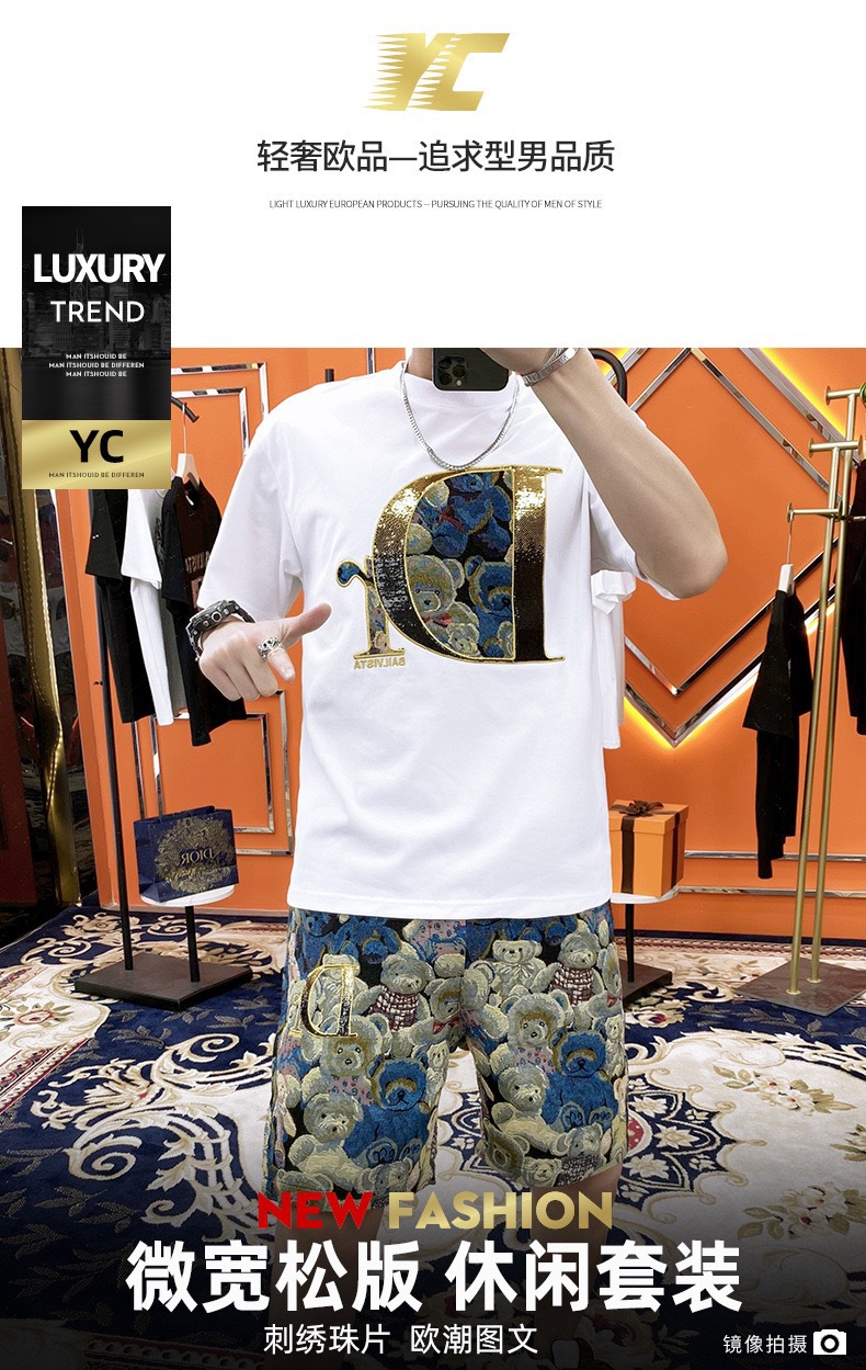 대외 무역 여름 남성 패션 트렌드 정장 맞춤형 곰 티셔츠 반바지 라운드 넥 느슨한 영국 투피스 세트