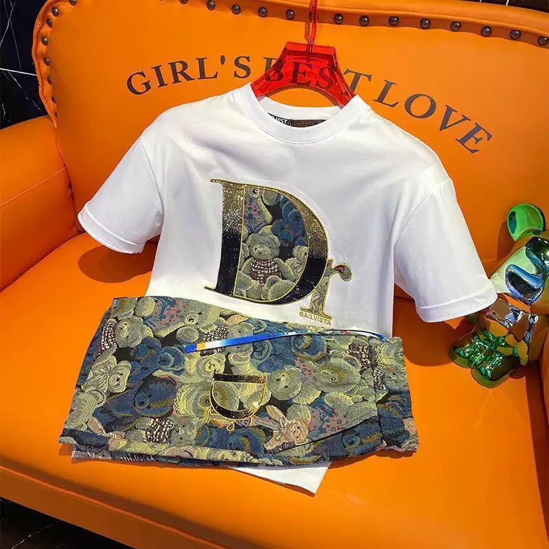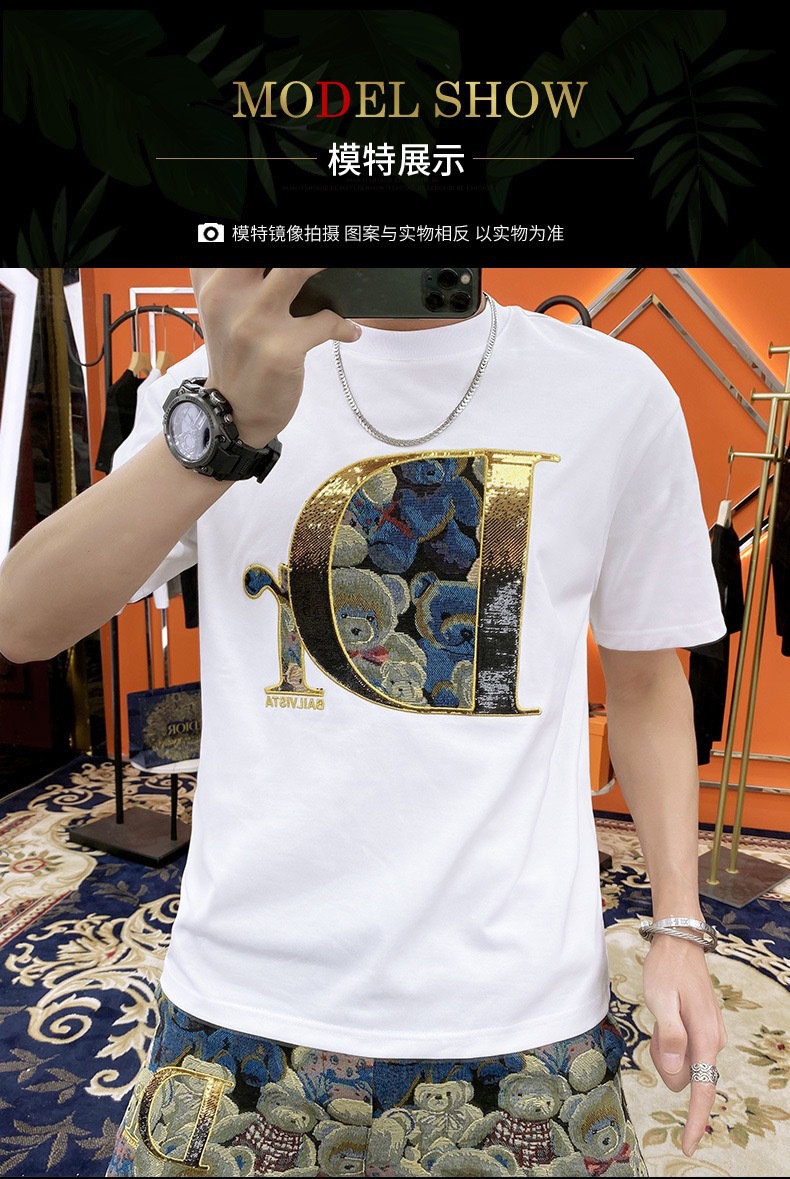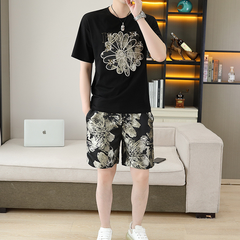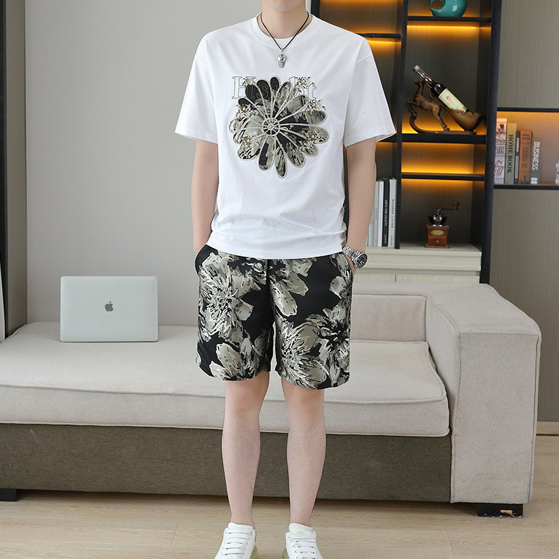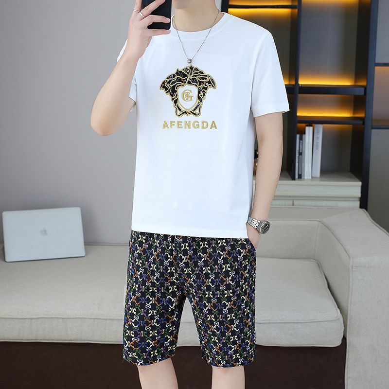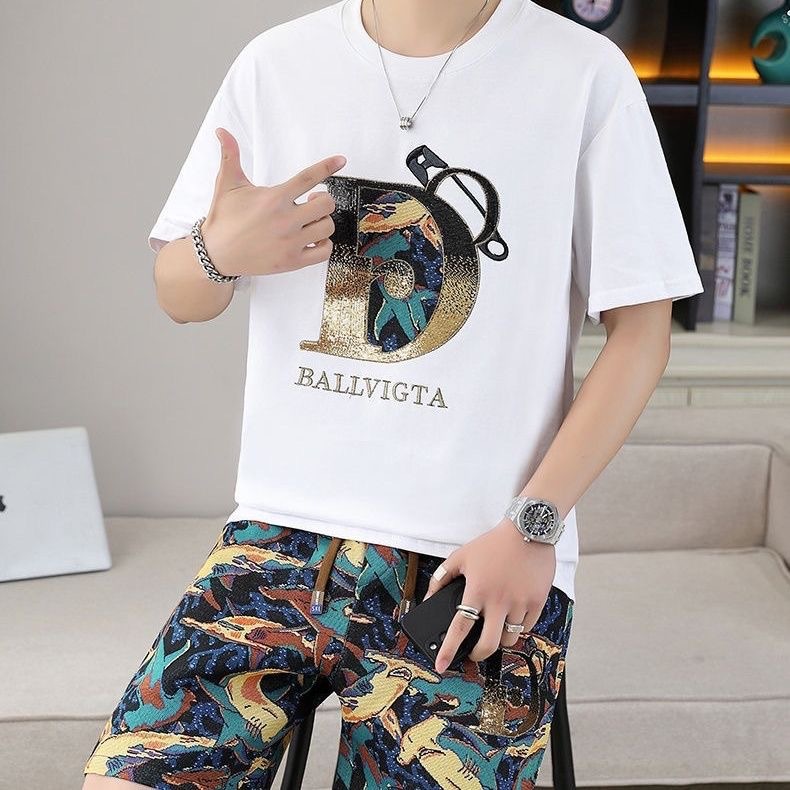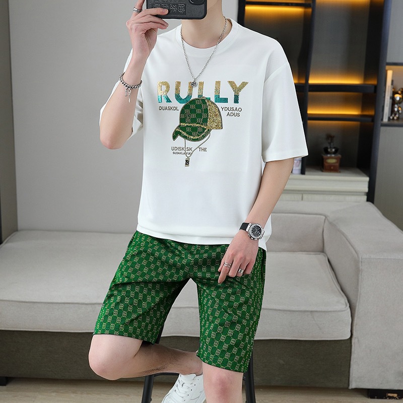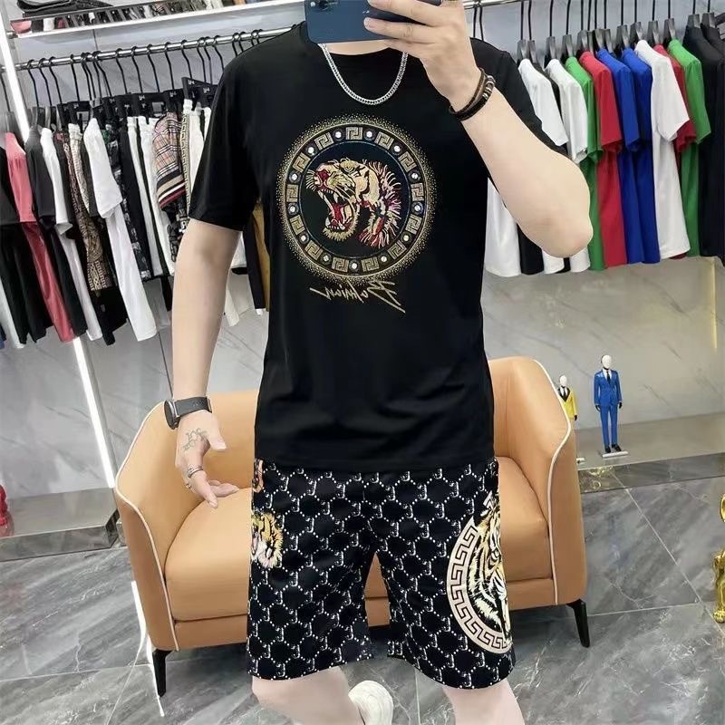 대외 무역 여름 남성 패션 트렌드 정장 맞춤형 곰 티셔츠 반바지 라운드 넥 느슨한 영국 투피스 세트