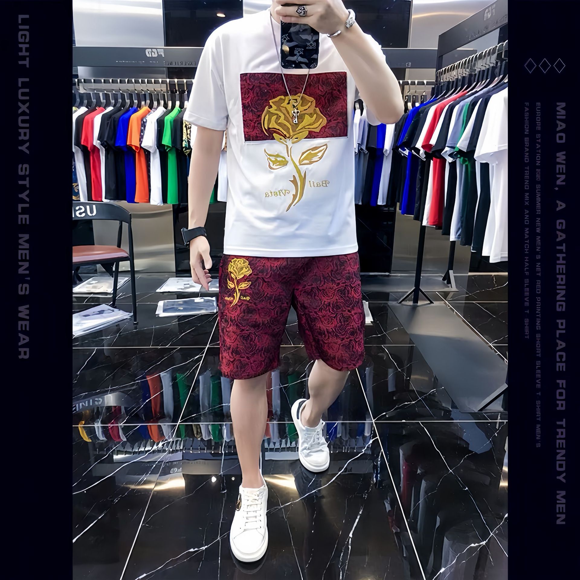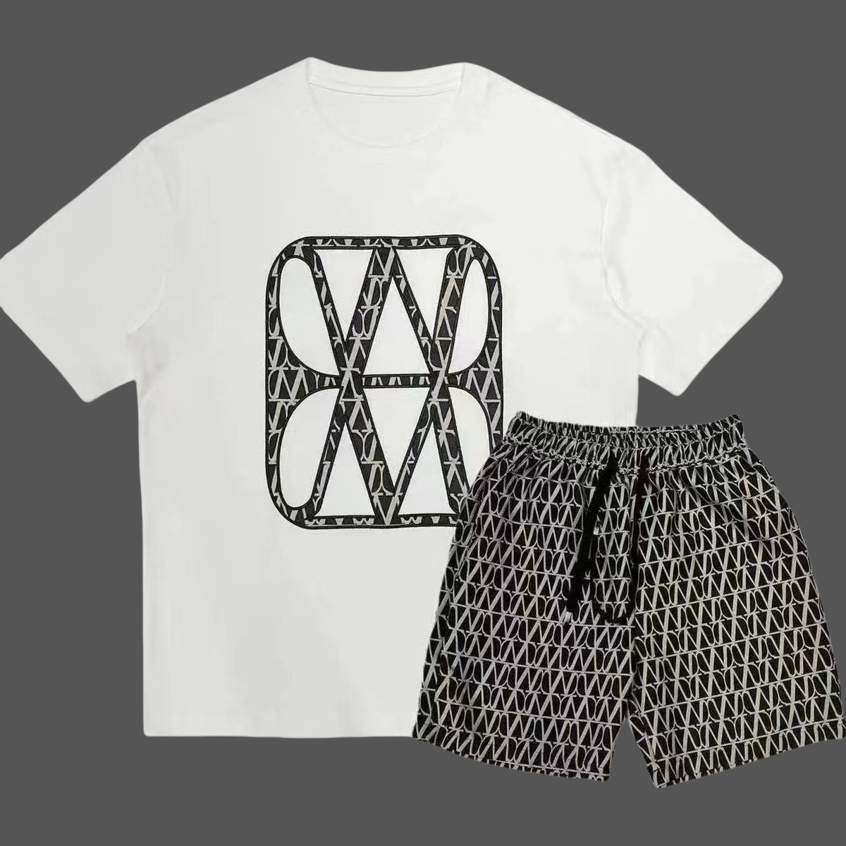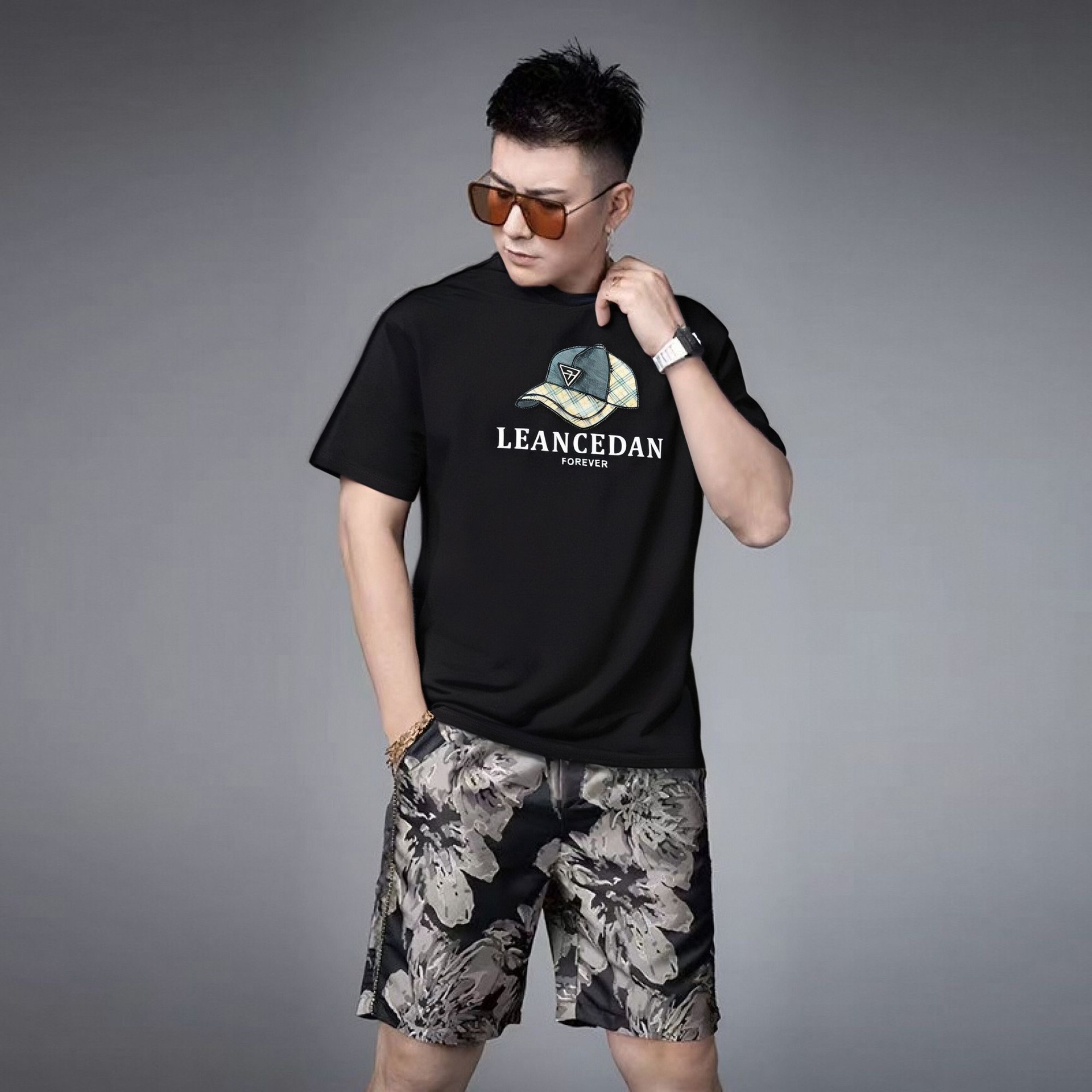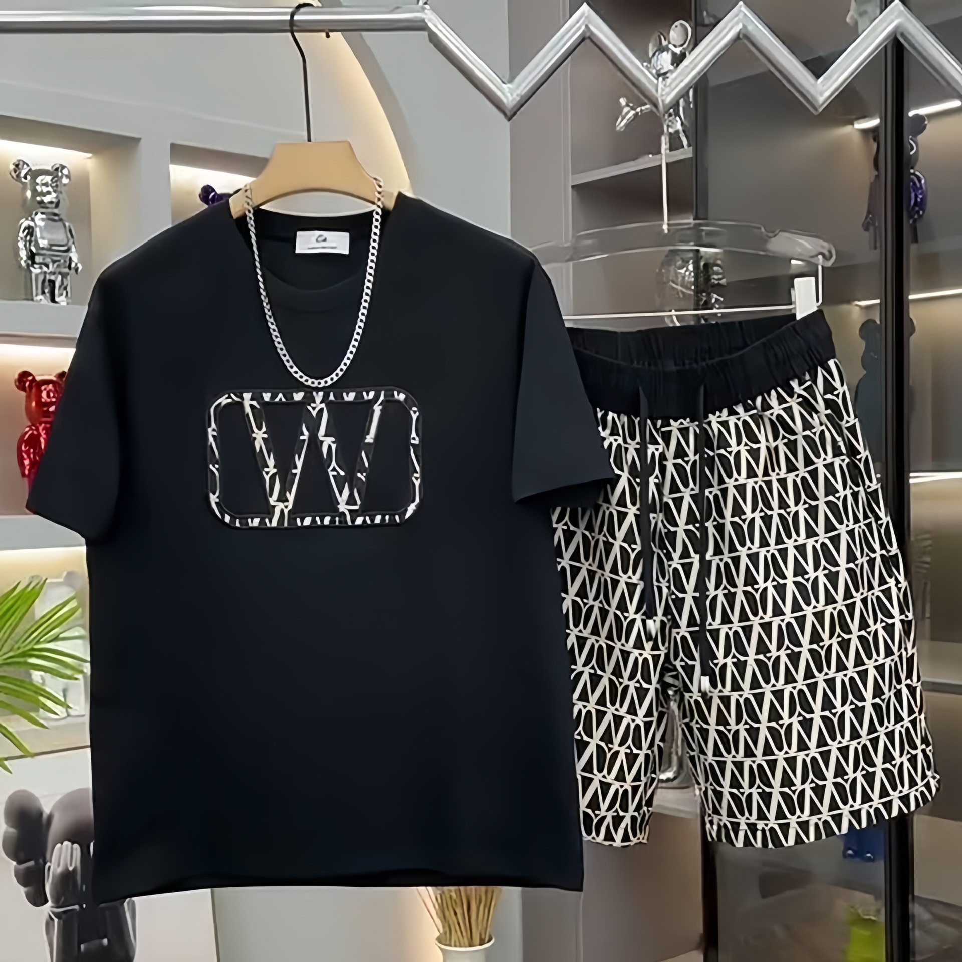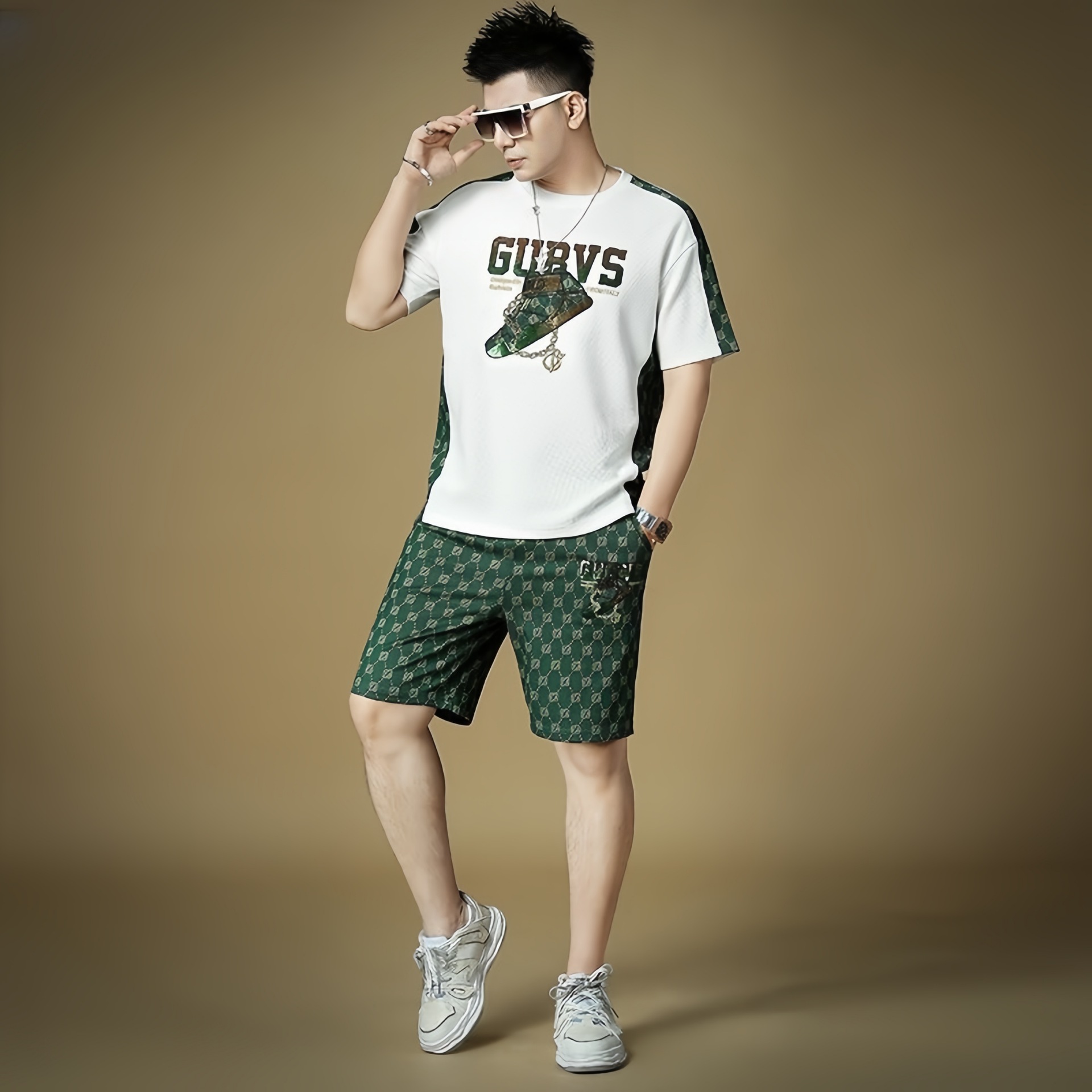 대외 무역 여름 남성 패션 트렌드 정장 맞춤형 곰 티셔츠 반바지 라운드 넥 느슨한 영국 투피스 세트