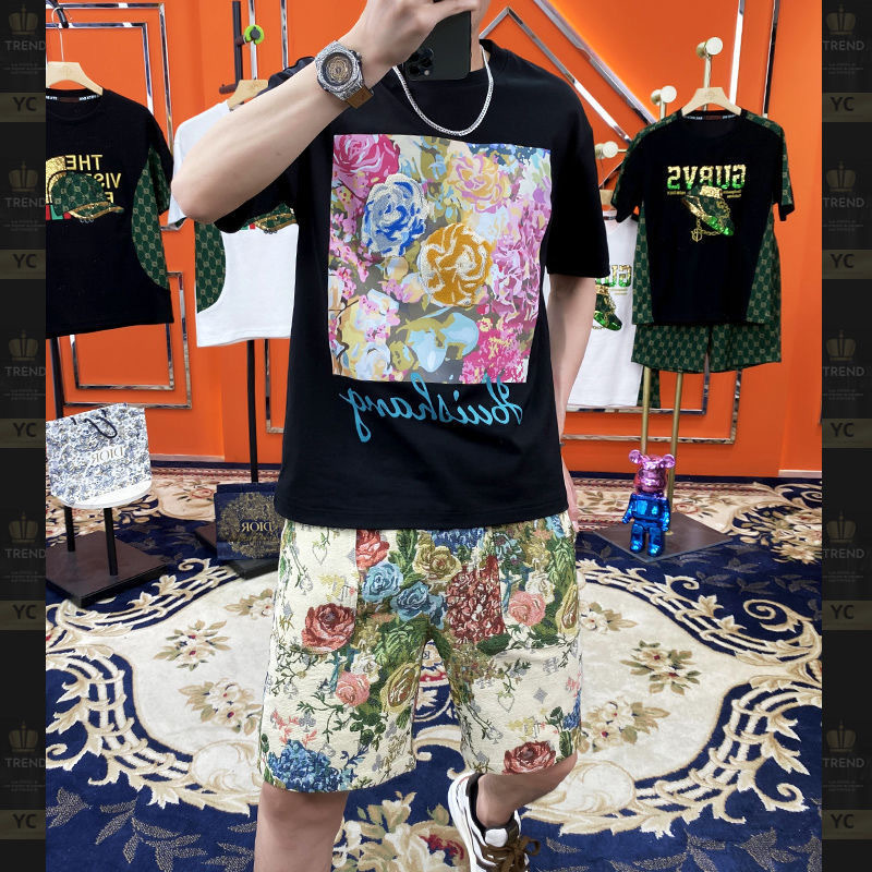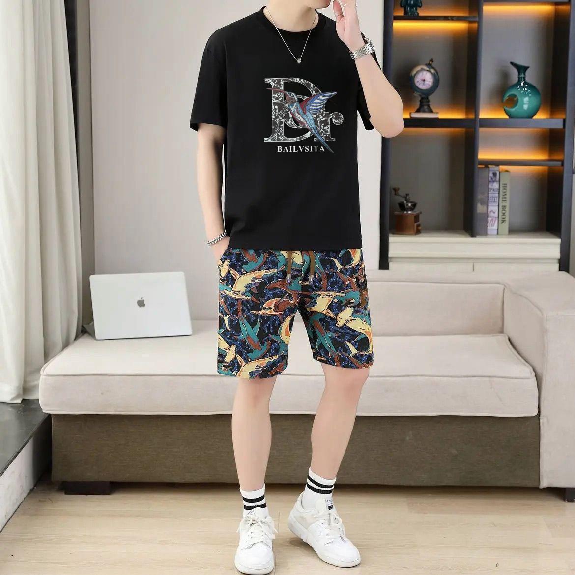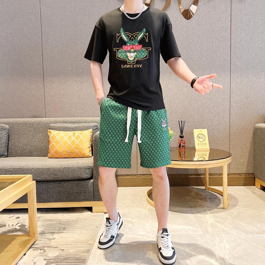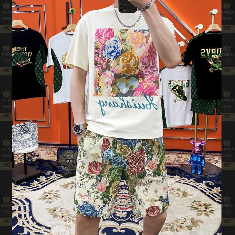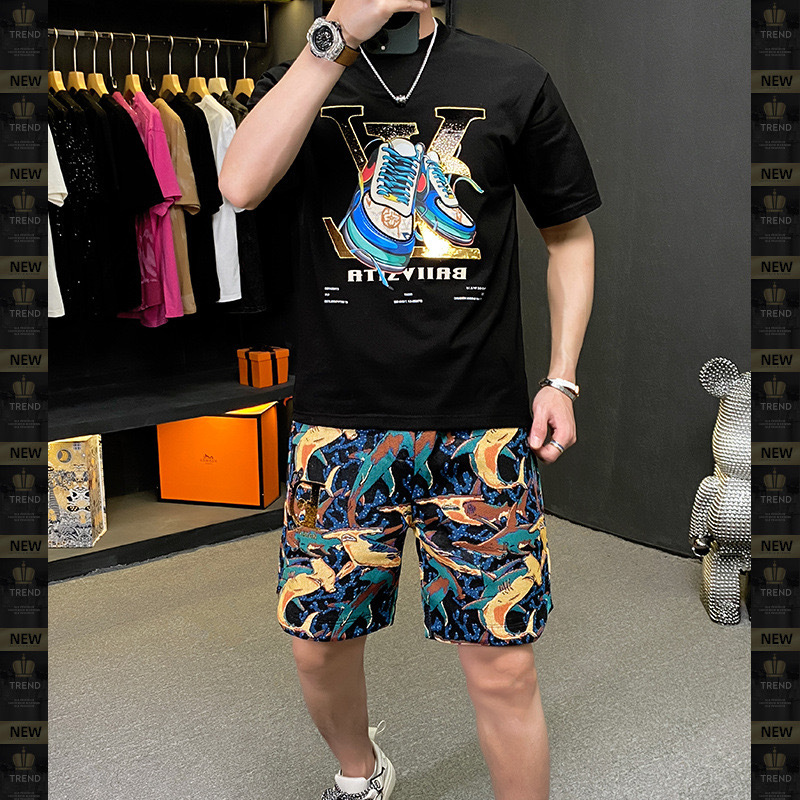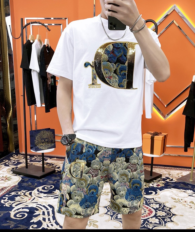 대외 무역 여름 남성 패션 트렌드 정장 맞춤형 곰 티셔츠 반바지 라운드 넥 느슨한 영국 투피스 세트스토어 가기