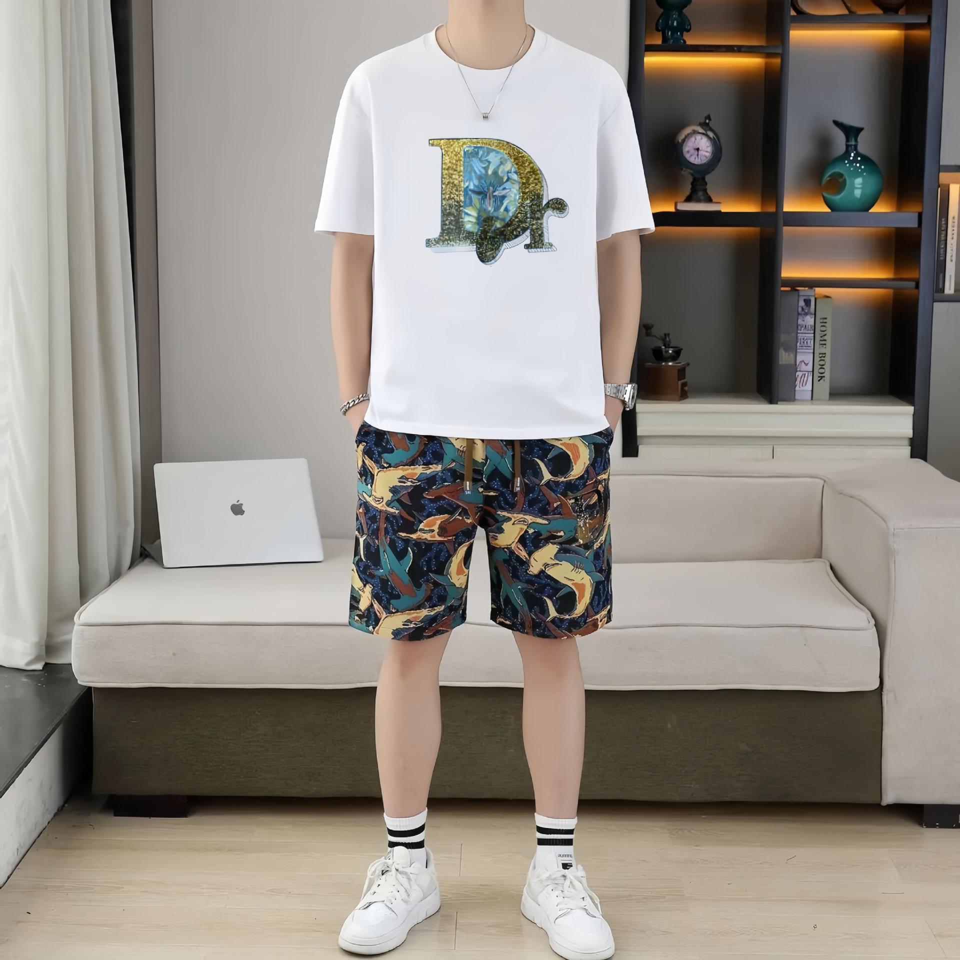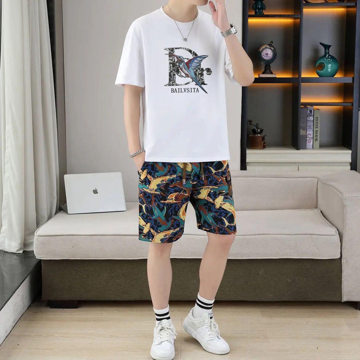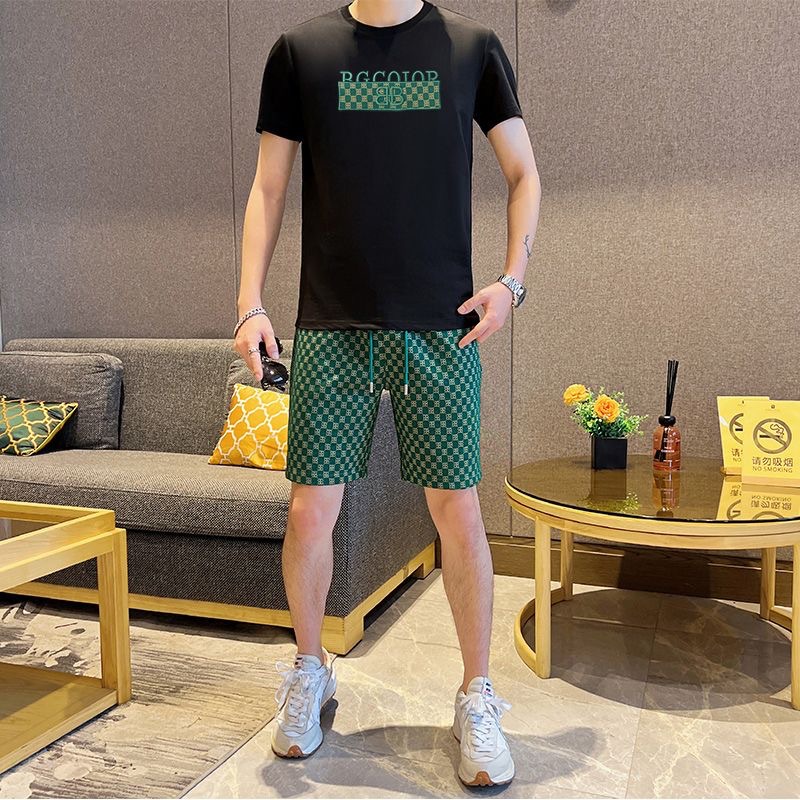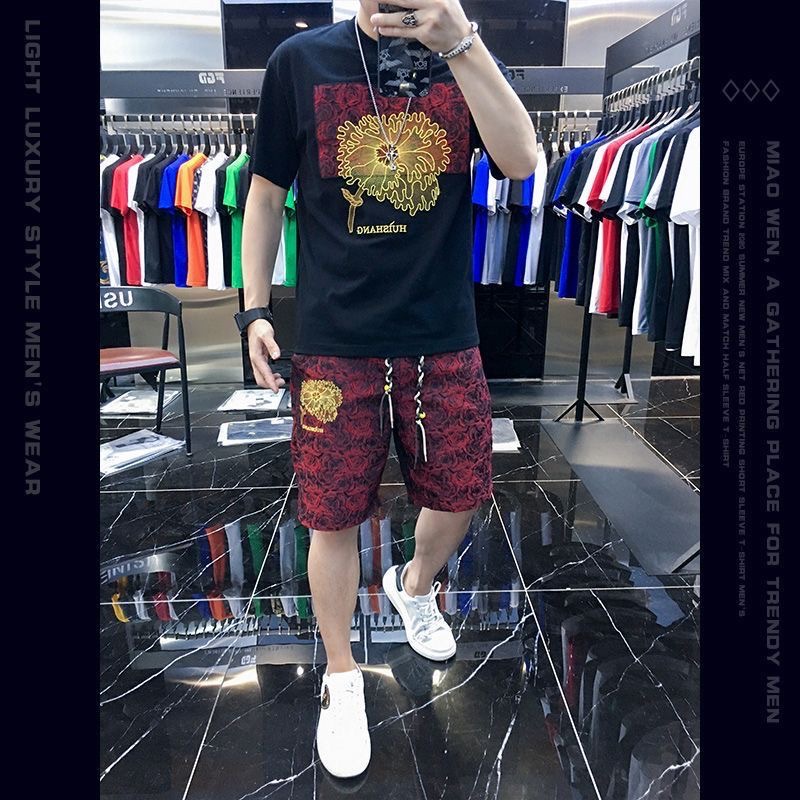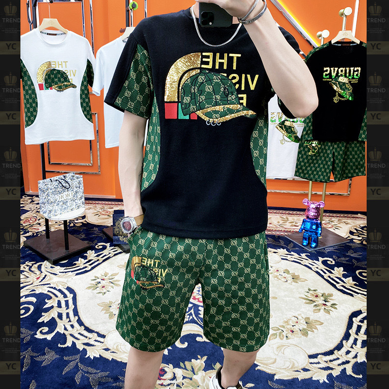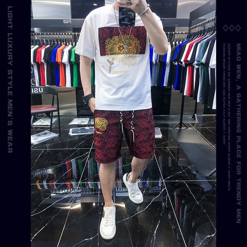 대외 무역 여름 남성 패션 트렌드 정장 맞춤형 곰 티셔츠 반바지 라운드 넥 느슨한 영국 투피스 세트스토어 가기