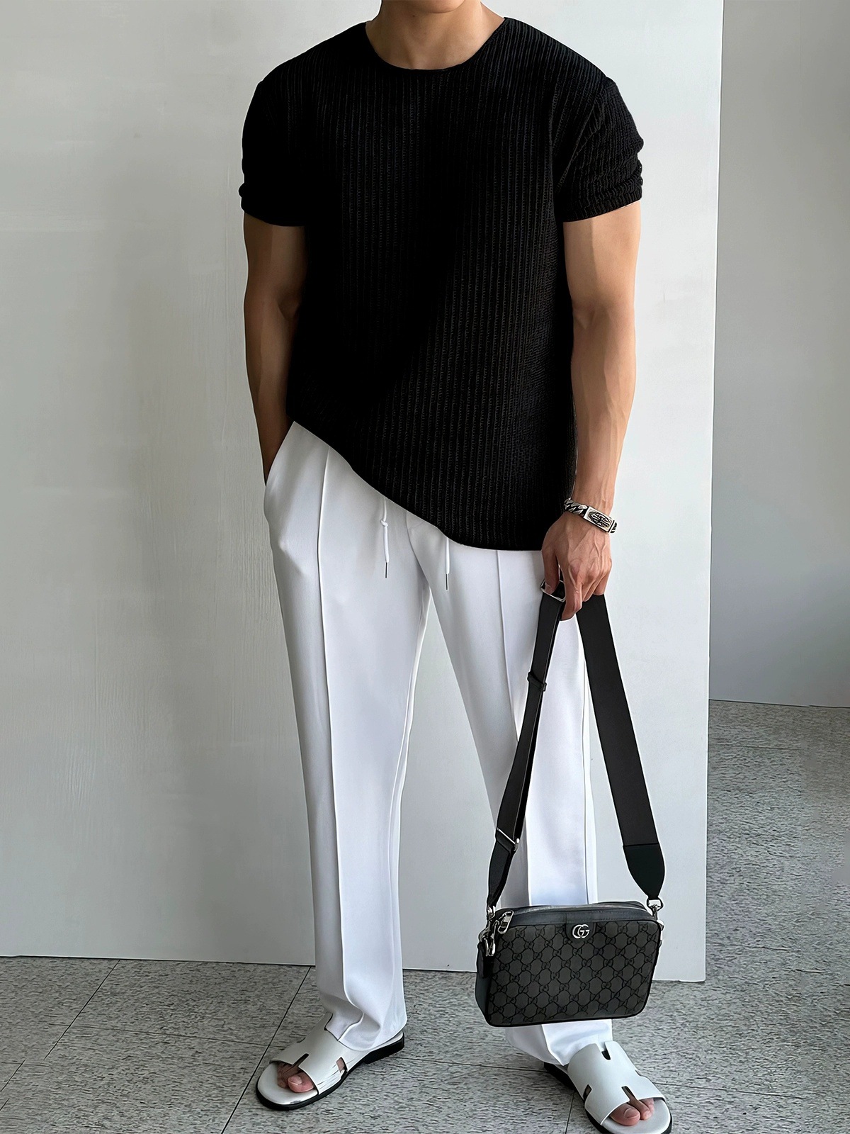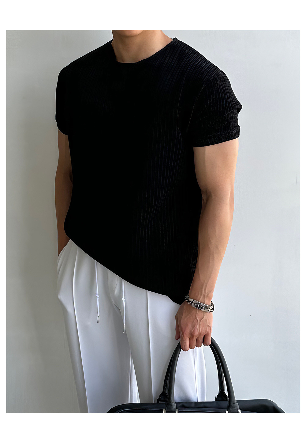 셔닐 통기성 반팔 스웨터 남성용 2025 여름 얇은 미국식 가벼운 성숙한 스타일 텐션 라운드 넥 티셔츠스토어 가기