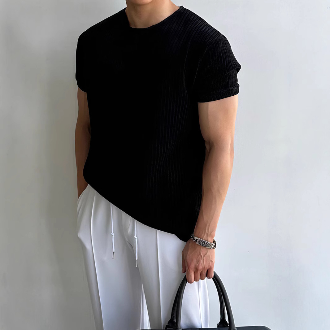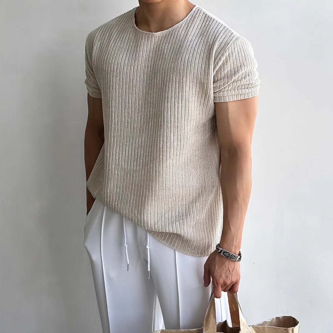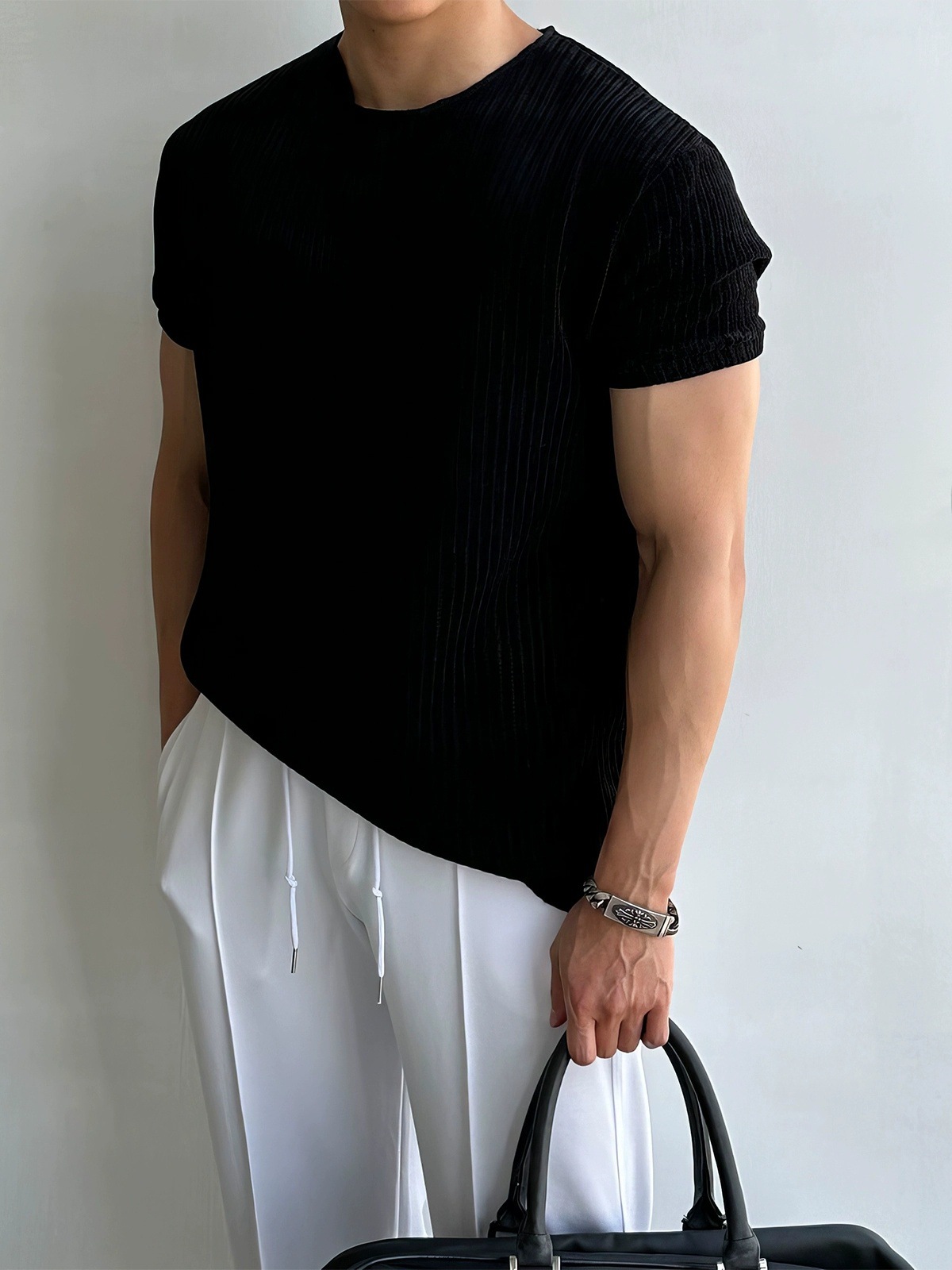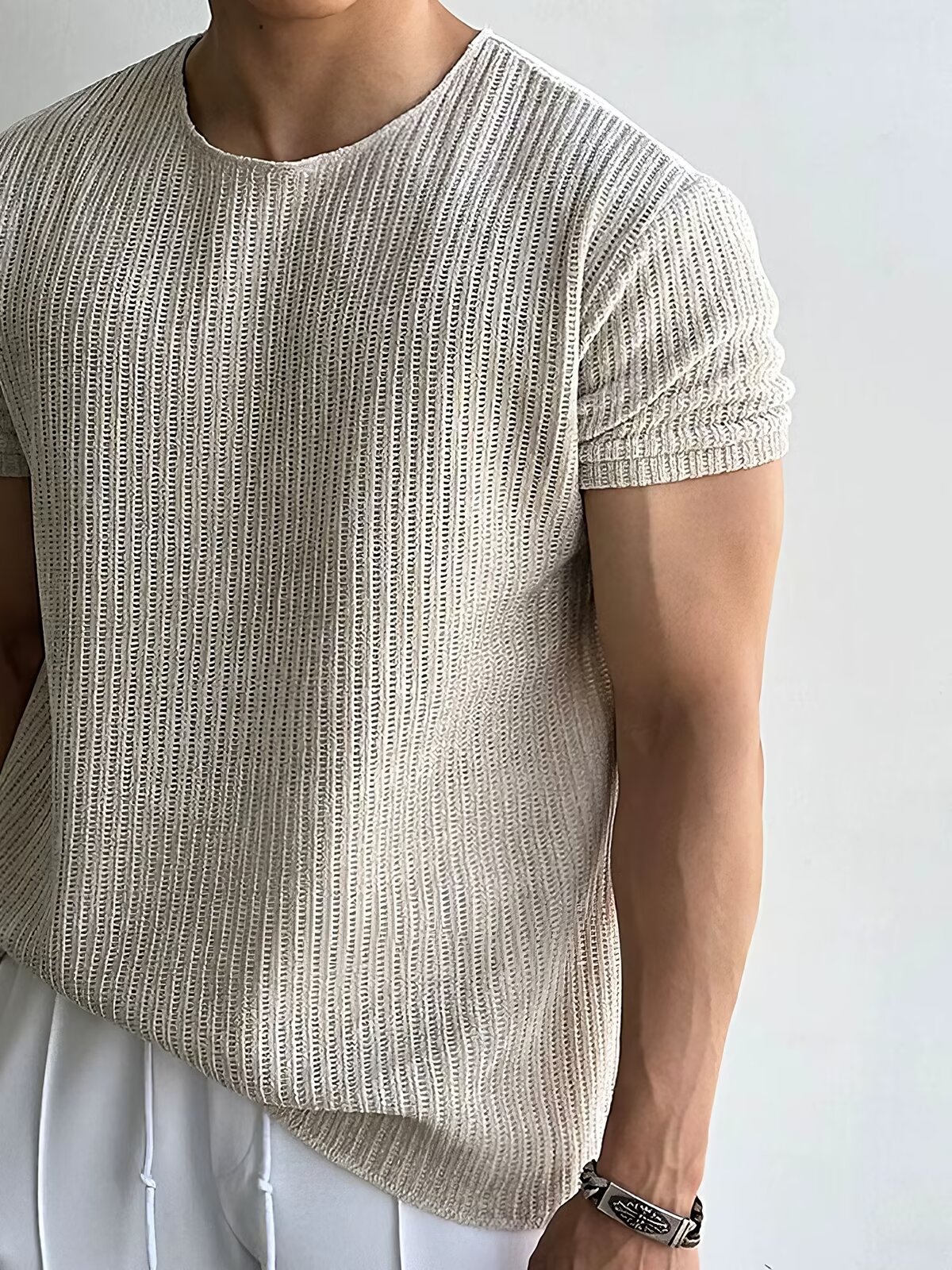 셔닐 통기성 반팔 스웨터 남성용 2025 여름 얇은 미국식 가벼운 성숙한 스타일 텐션 라운드 넥 티셔츠