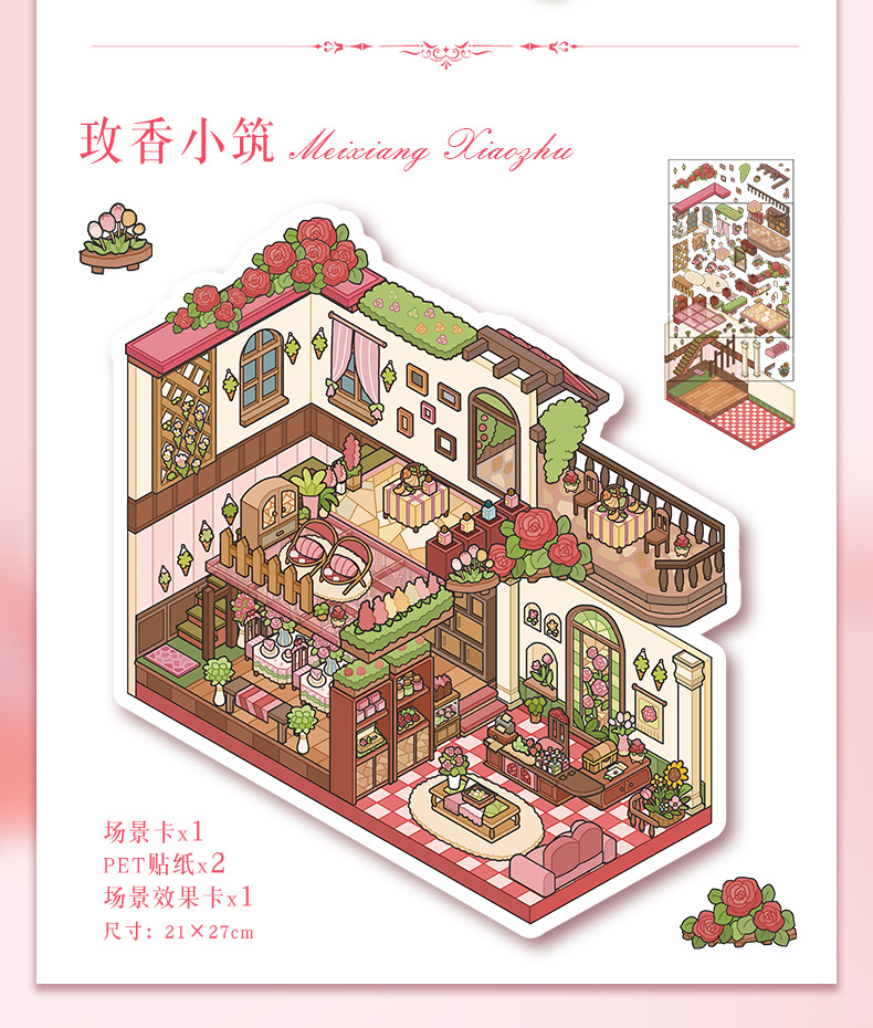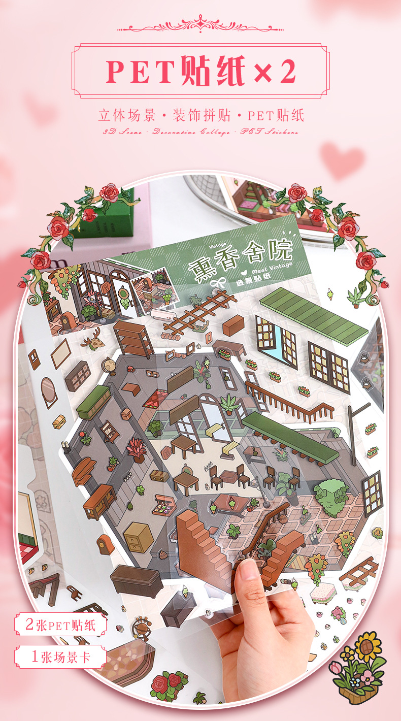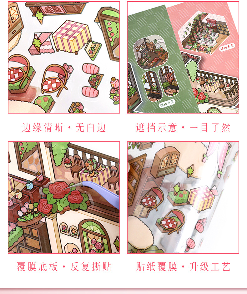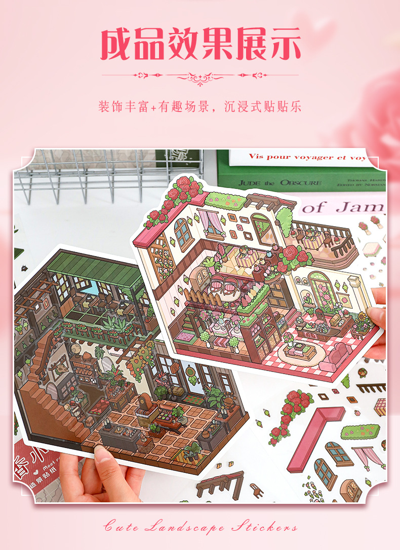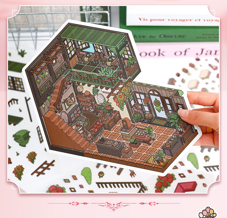 52.0 아트 블루 조경 스티커 대형 3D 3 차원 오두막 장면 콜라주 감압 다이 스택 핸드 계정 스티커스토어 가기