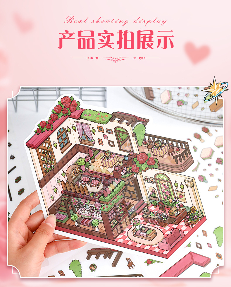 52.0 아트 블루 조경 스티커 대형 3D 3 차원 오두막 장면 콜라주 감압 다이 스택 핸드 계정 스티커