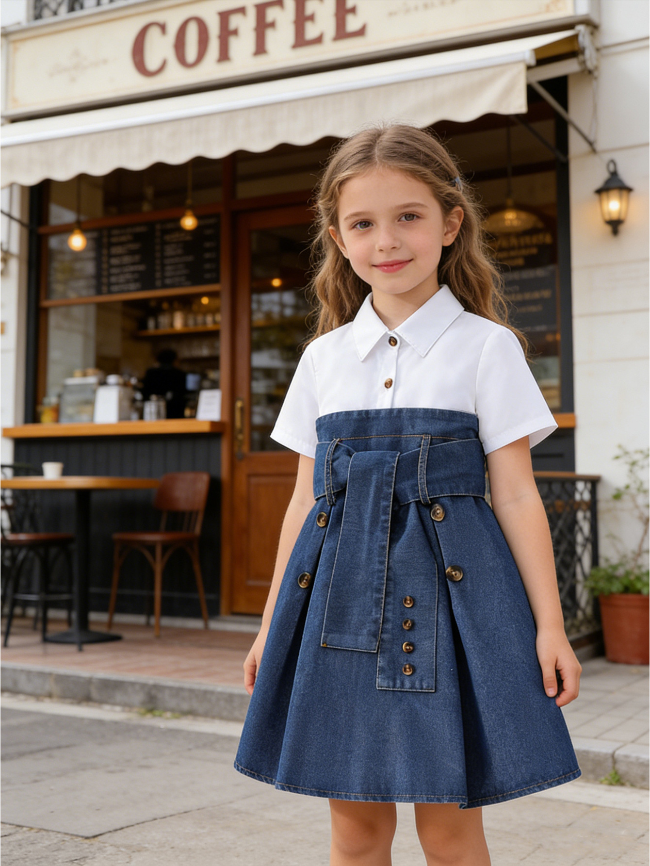 2025 새로운 유럽과 미국 스타일의 크로스보더 소녀의 세련된 드레스 데님 스플라이싱 솔리드 컬러 드레스