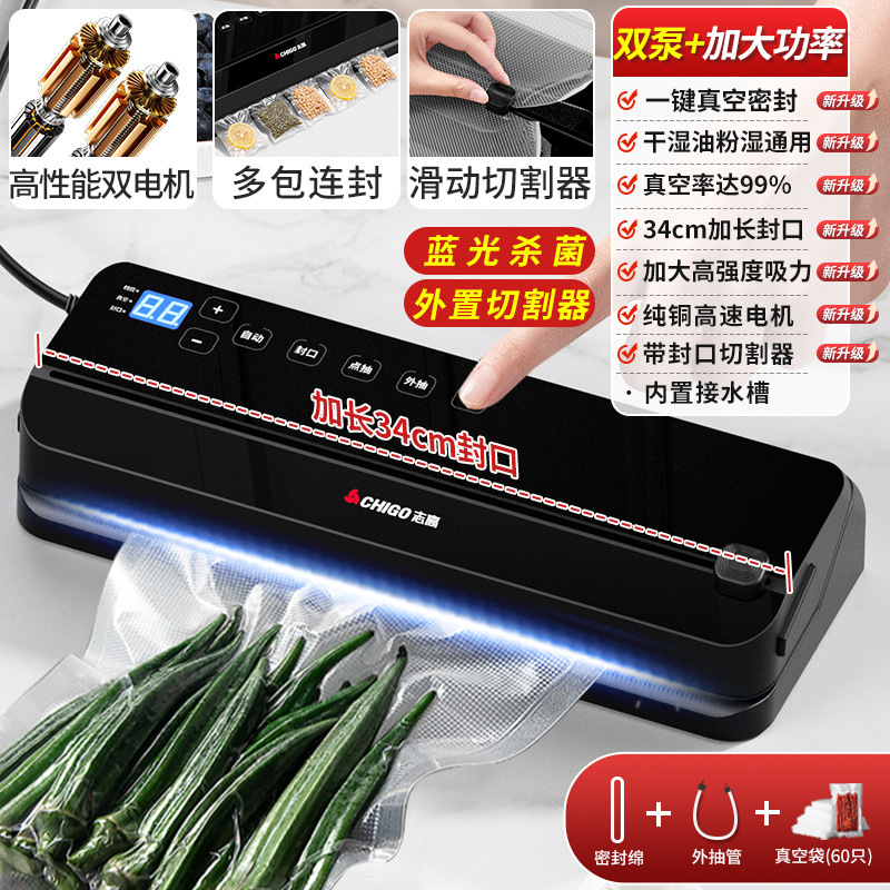 • Chigo 정품 [더블 펌프 + 150W 슈퍼 흡입] 5MM 씰링 스트립 - 34CM 씰링 [블루 라이트 살균 + 온도 조절] 외부 펌핑 튜브 + 60 봉지