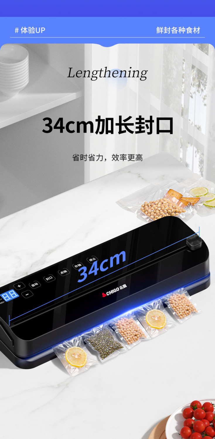 • Chigo 정품 [단일 펌프 + 60Kpa 흡입] 5MM 씰링 스트립 - 34CM 씰링 [블루라이트 살균 + 온도 조절] 외부 펌핑 튜브 + 10 봉지