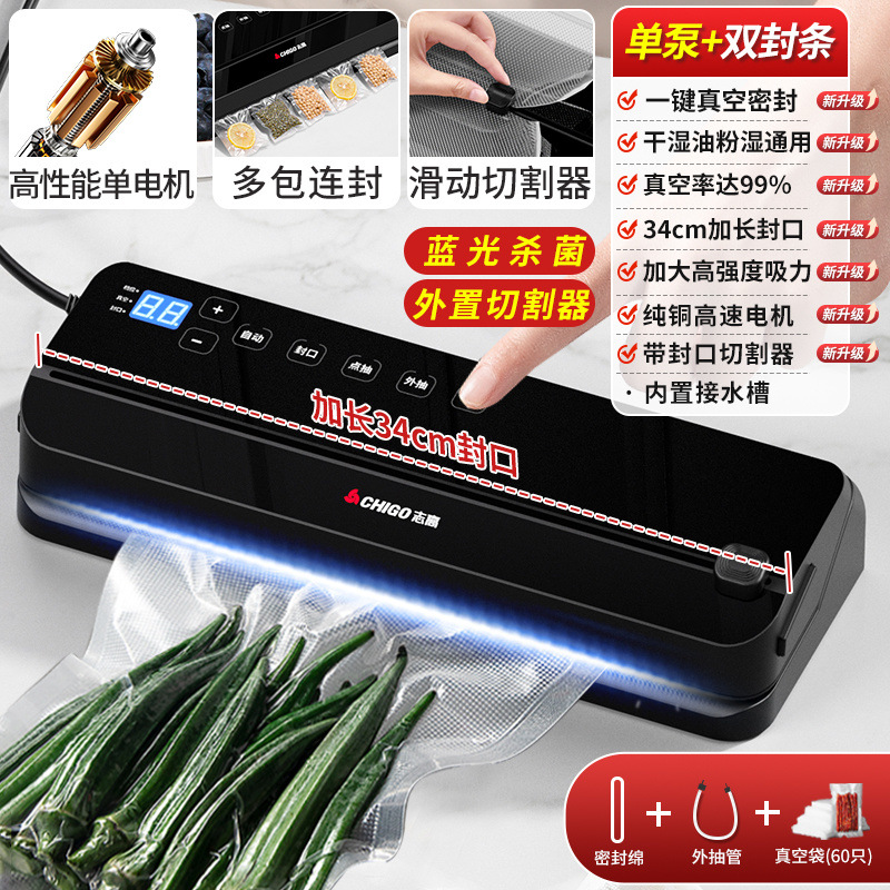 • Chigo 정품 [단일 펌프 + 60Kpa 흡입] 5MM 씰링 스트립 - 34CM 씰링 [블루라이트 살균 + 온도 조절] 외부 펌핑 튜브 + 60 봉지