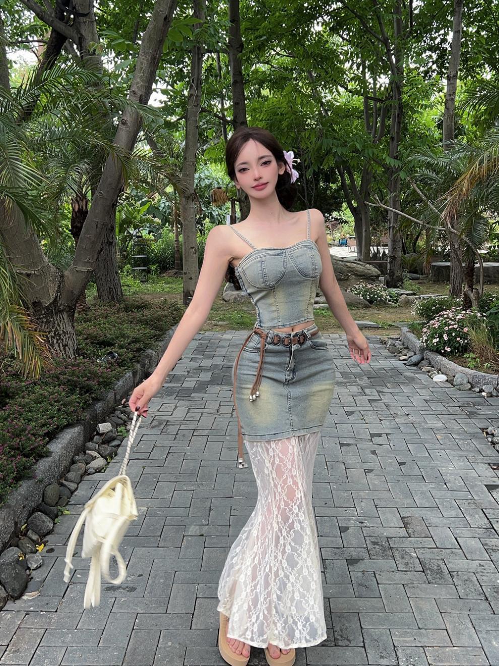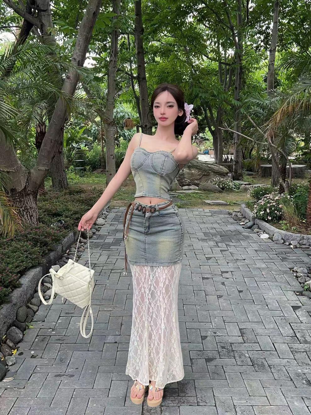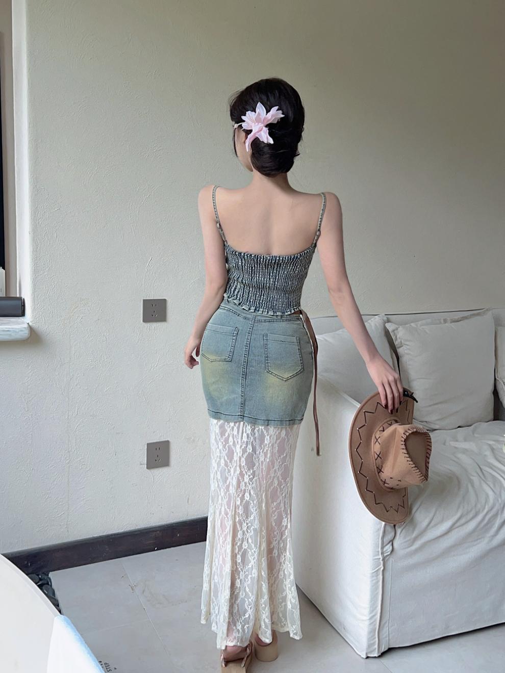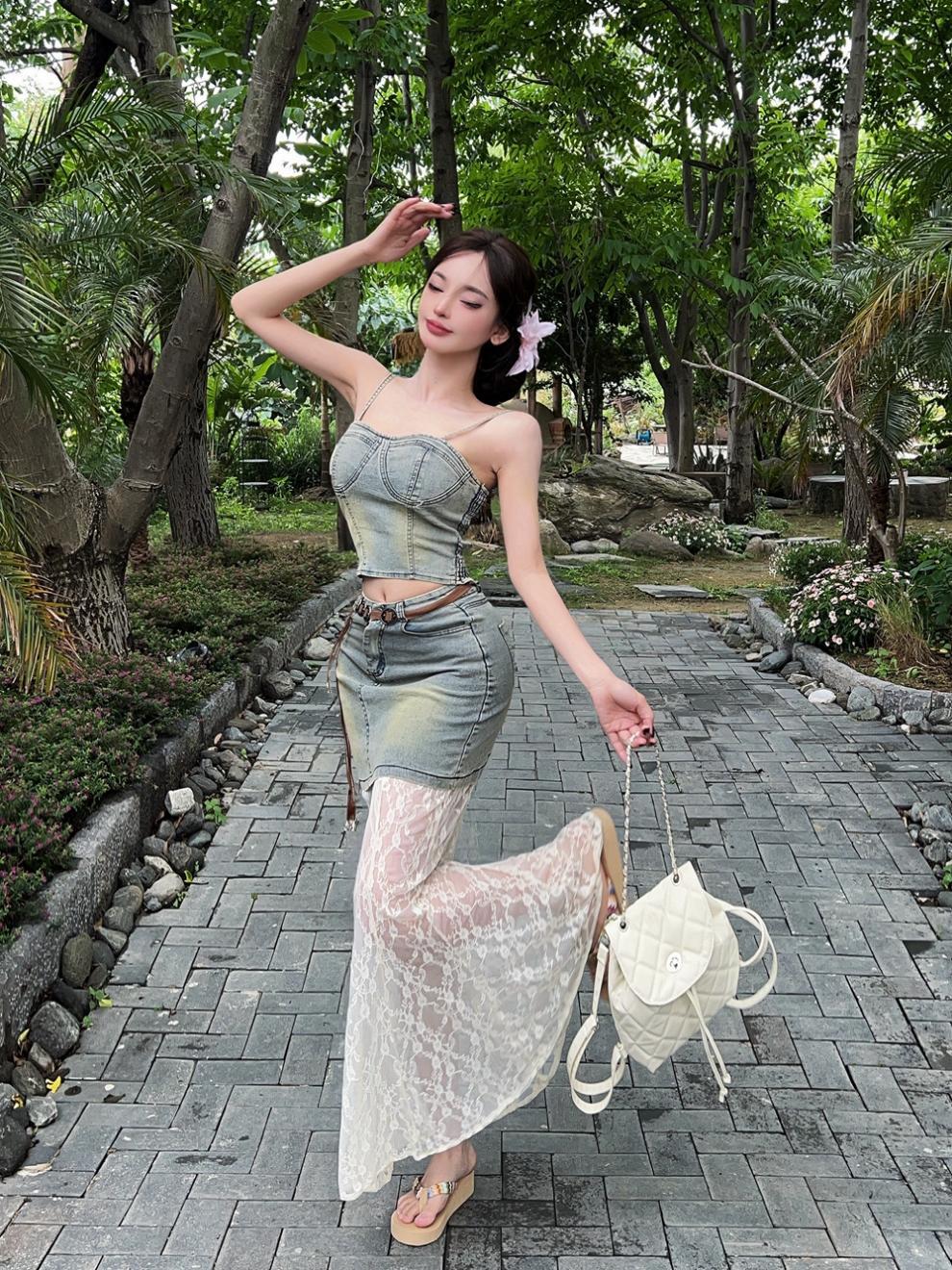 5876 국경 간 대외 무역 여성 의류 도매 동남 아시아 뜨거운 소녀 튜브 탑 스플 라이스 레이스 스커트 정장스토어 가기