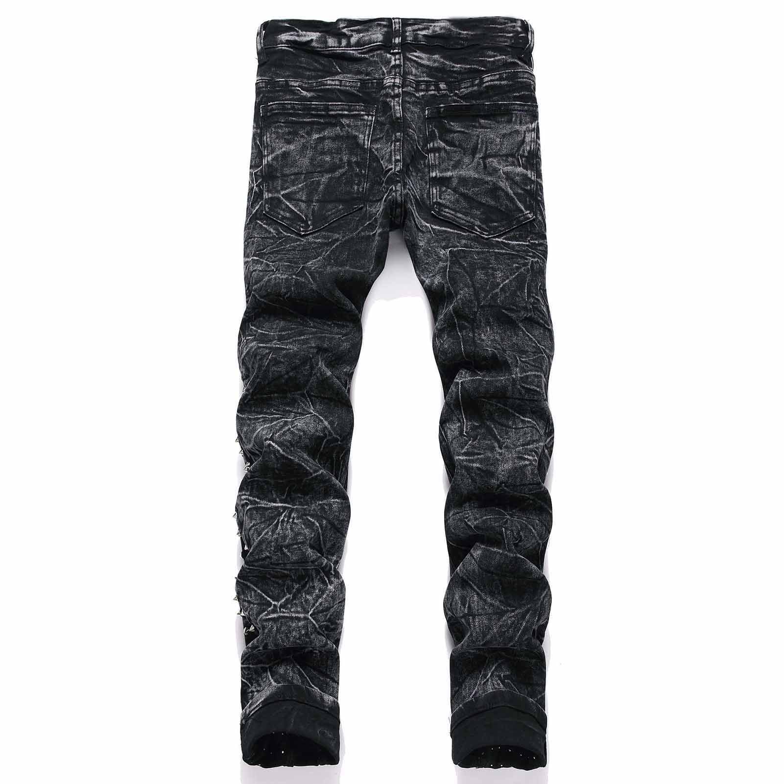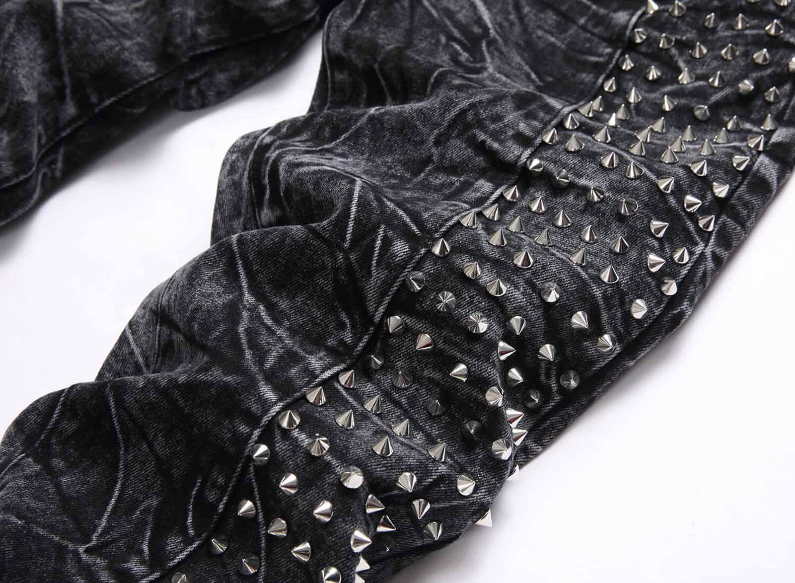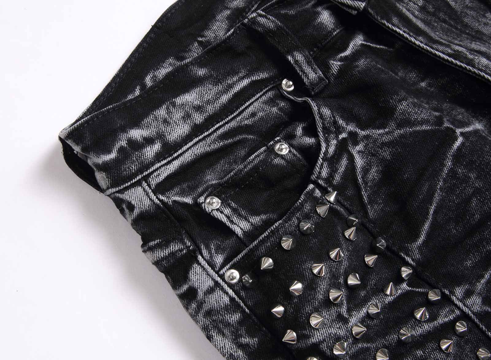 레트로 펑크 하이 스트리트 트렌디 블랙 슬림핏 디스트레스드 리벳 남성 청바지