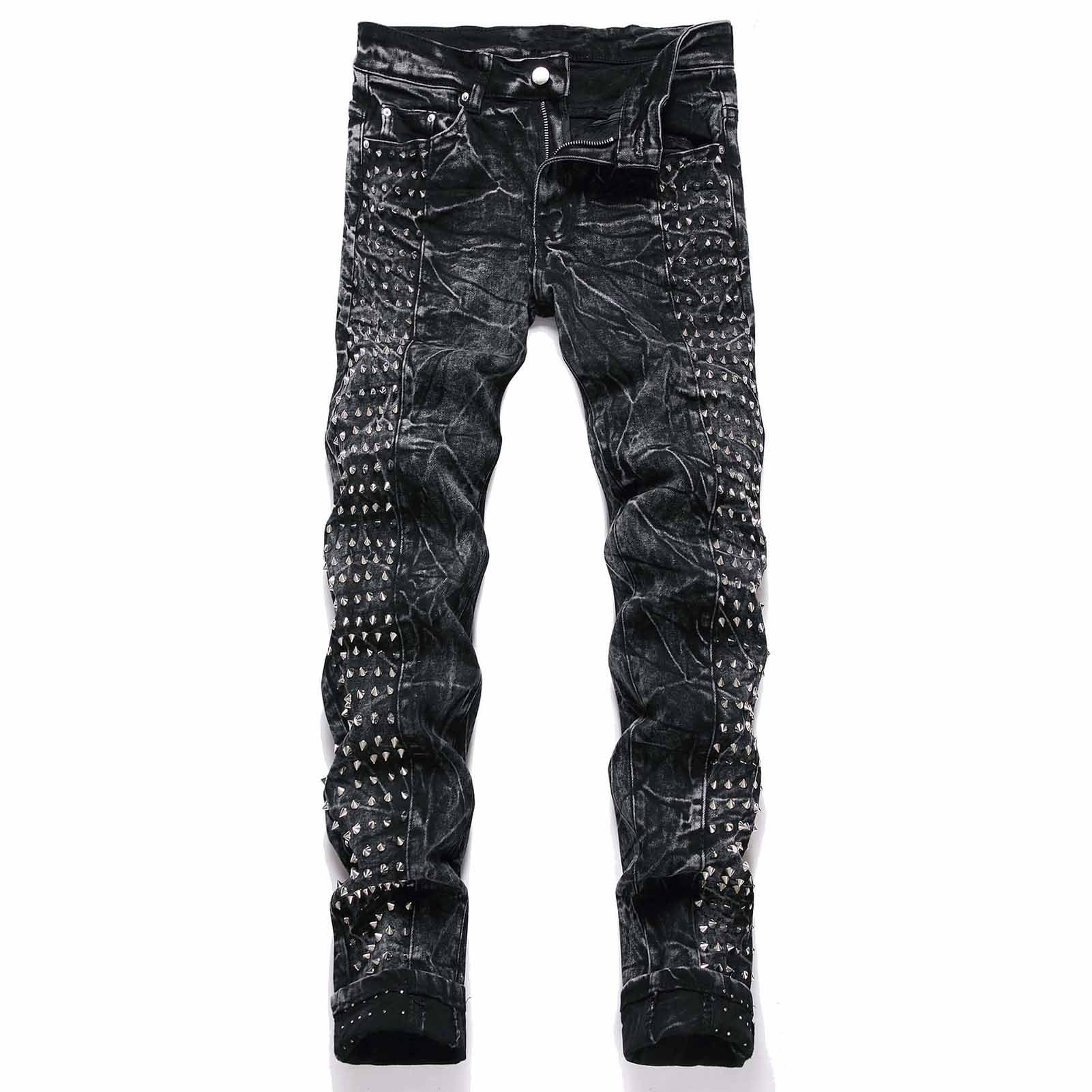 레트로 펑크 하이 스트리트 트렌디 블랙 슬림핏 디스트레스드 리벳 남성 청바지스토어 가기