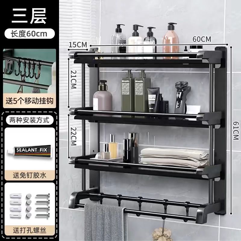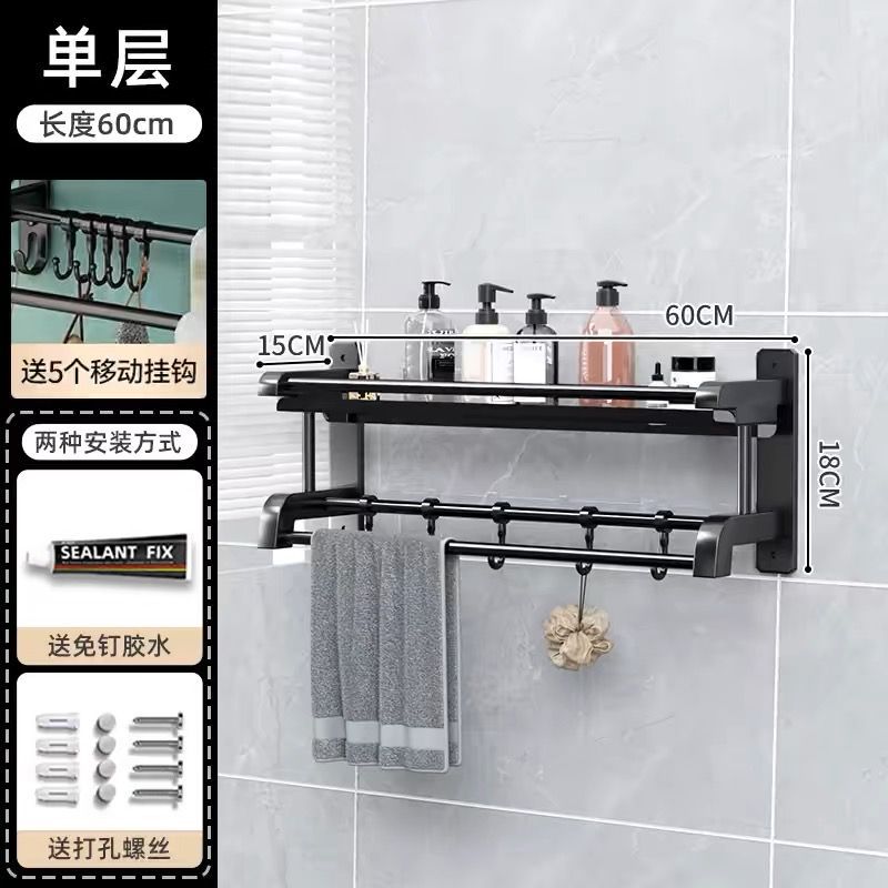 • 설치용 구멍을 뚫을 필요가 없습니다 - 검정색 보관 랙 - 60cm 단일 레이어/후크 5개 포함