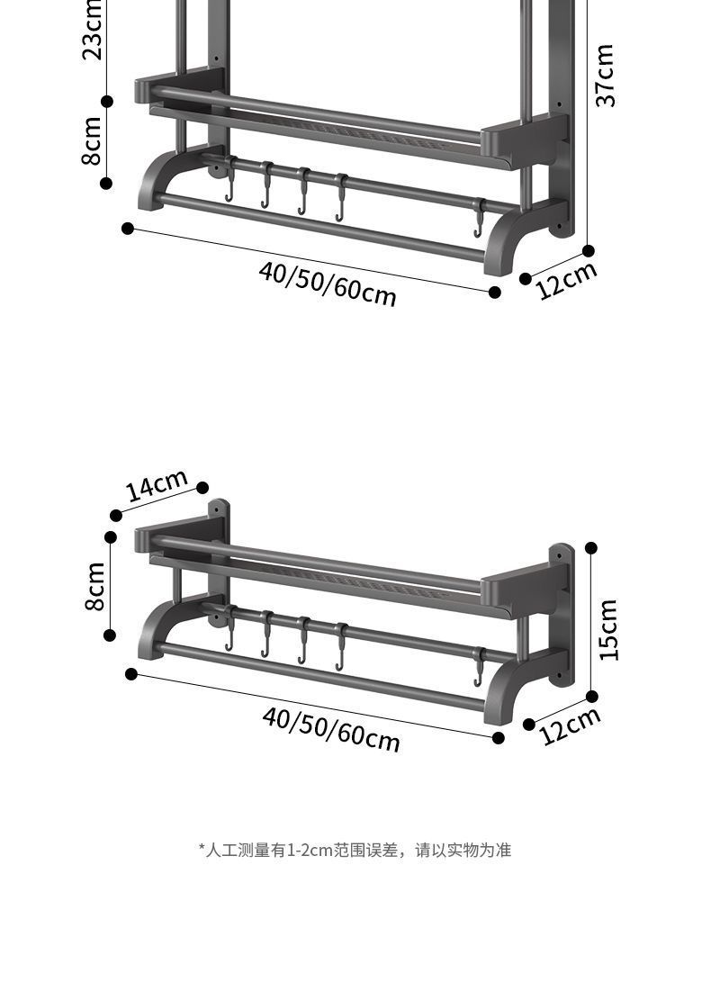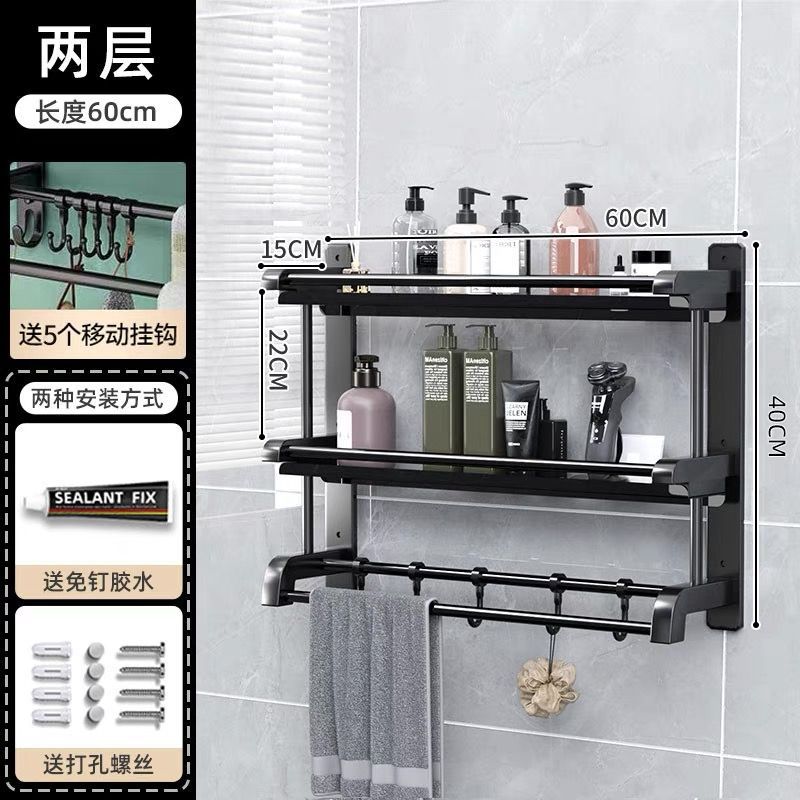 • 설치용 구멍을 뚫을 필요가 없습니다 - 검정색 보관 랙 - 60cm 더블 레이어/후크 5개 포함