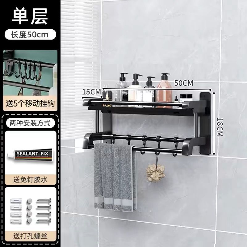 • 설치를 위한 구멍을 뚫을 필요가 없습니다 - 검정색 보관 랙 - 50cm 단일 레이어/후크 5개 포함