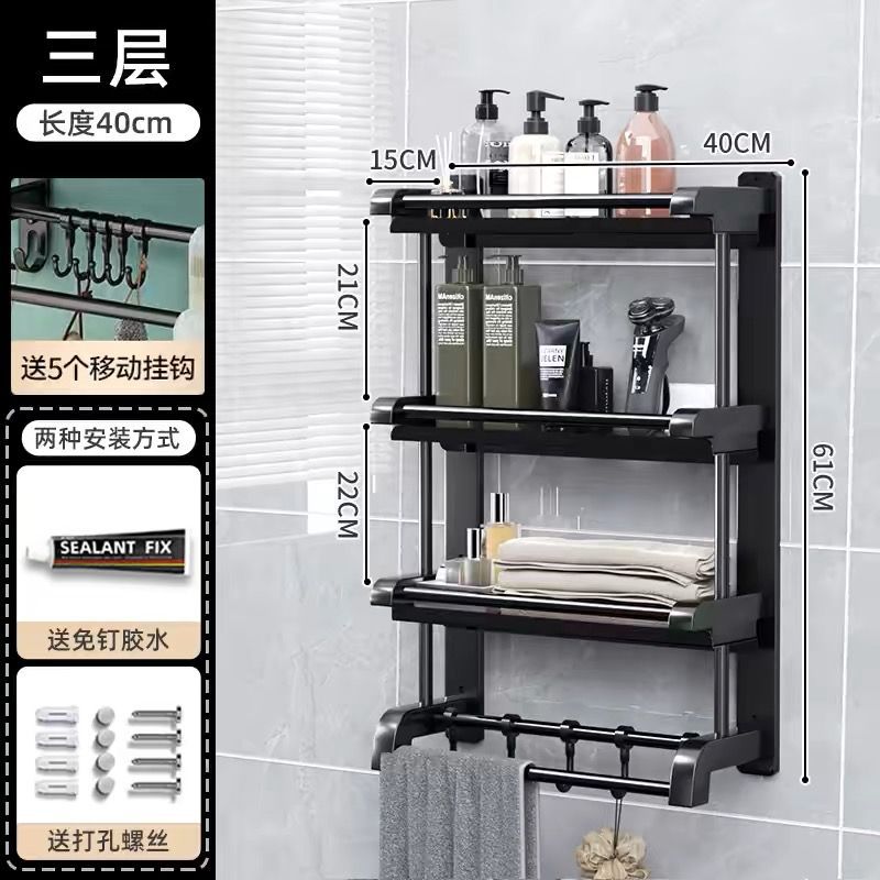• 설치용 구멍을 뚫을 필요가 없습니다 - 검정색 보관 랙 - 40cm 3단/후크 5개 포함