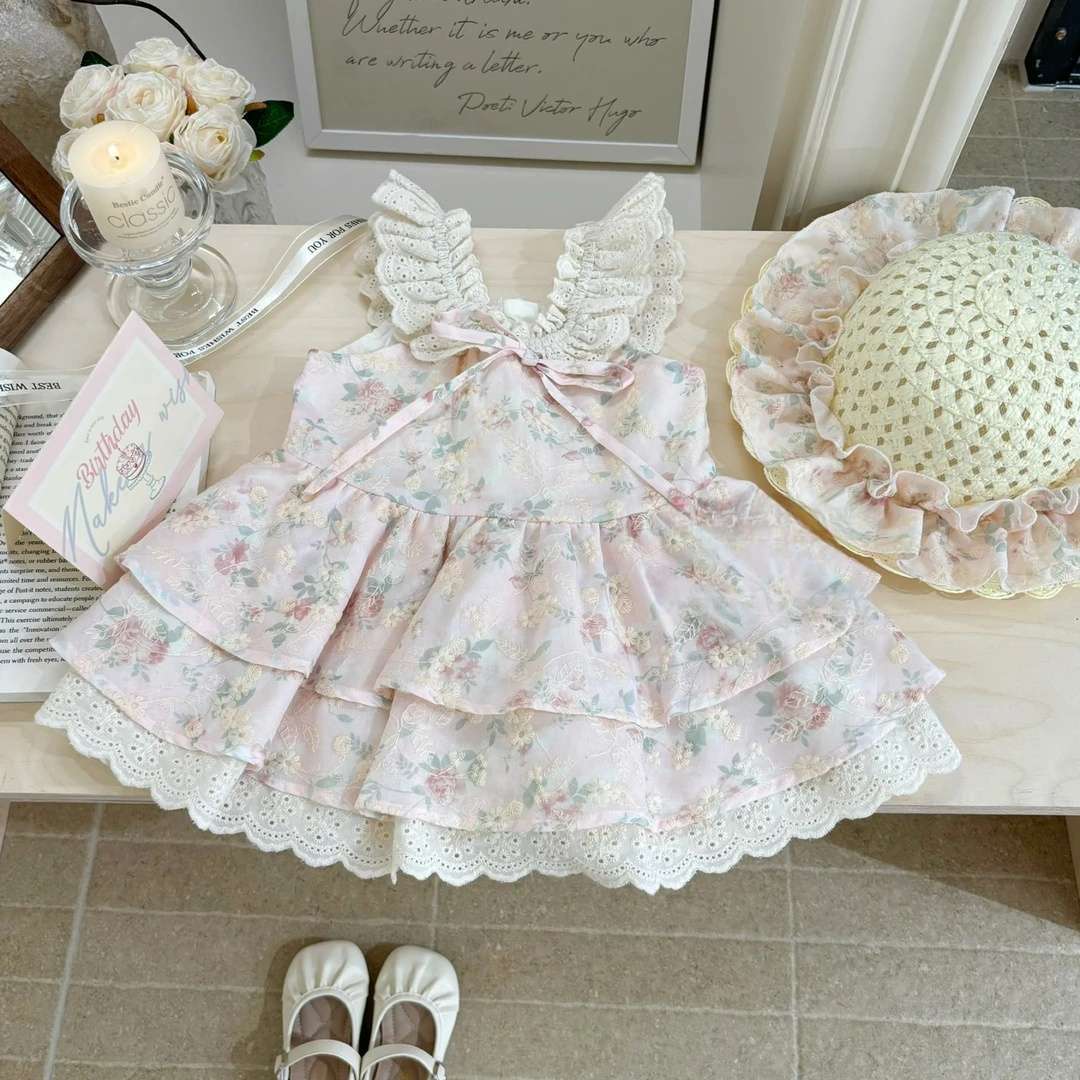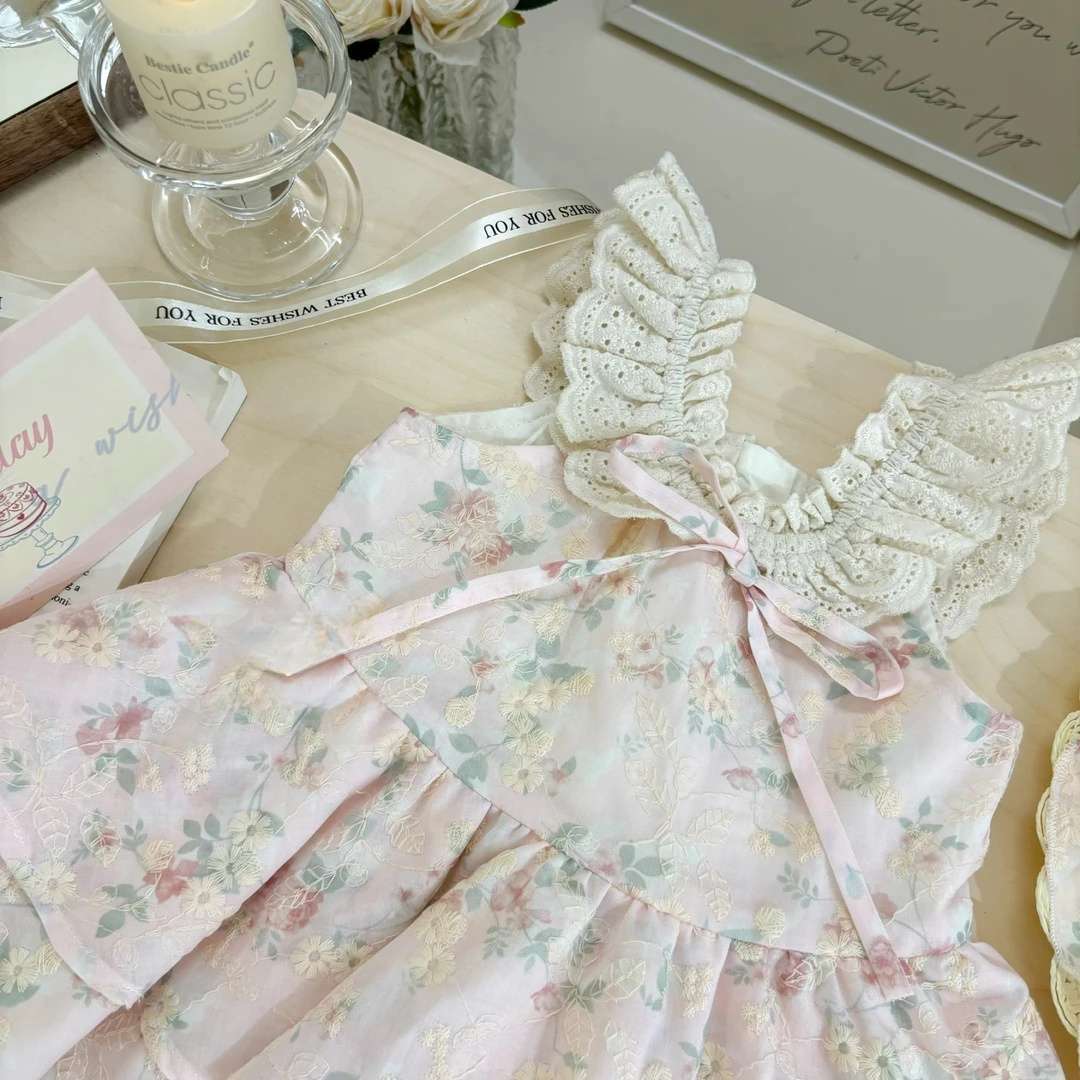 [어린이 스타서클] 새 사쿠라 꽃매기 ~ 여자 여름 달콤한 작은 비행 부드러운 소매 꽃 레이스 원피스