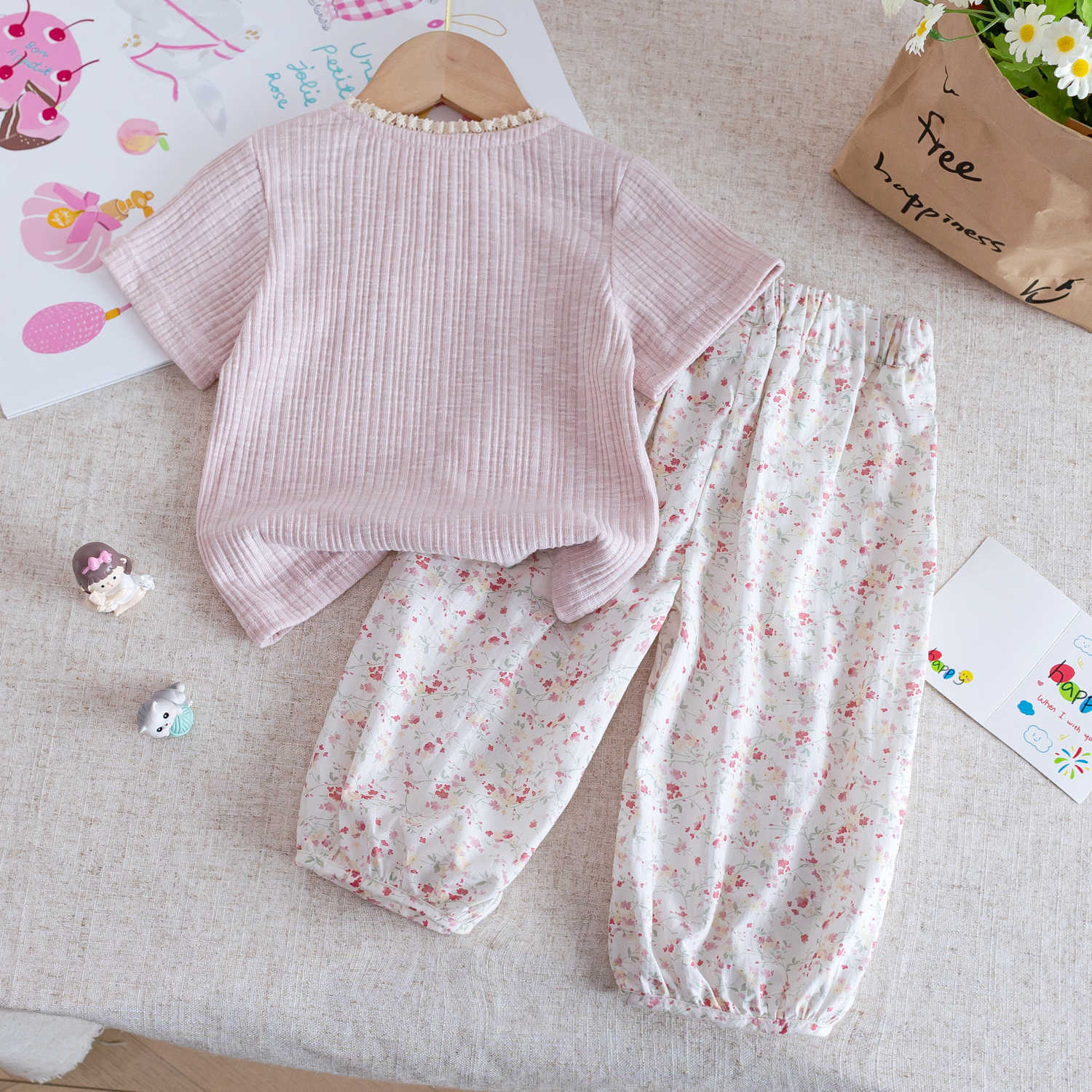 소녀상 세트 2025 년 새 여름 어린이 한식 달콤한 꽃 반팔 티셔츠 아기 여아용 Lair Pants 세트