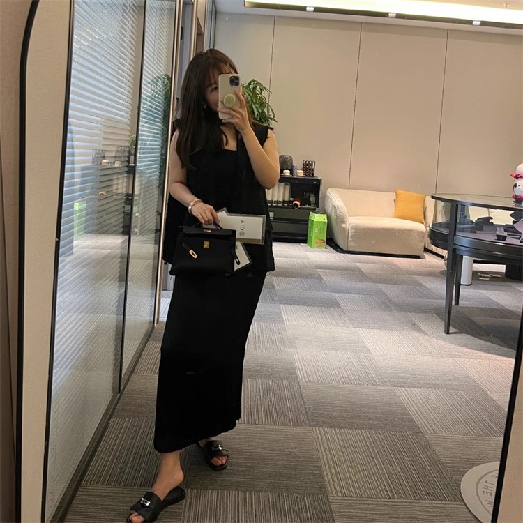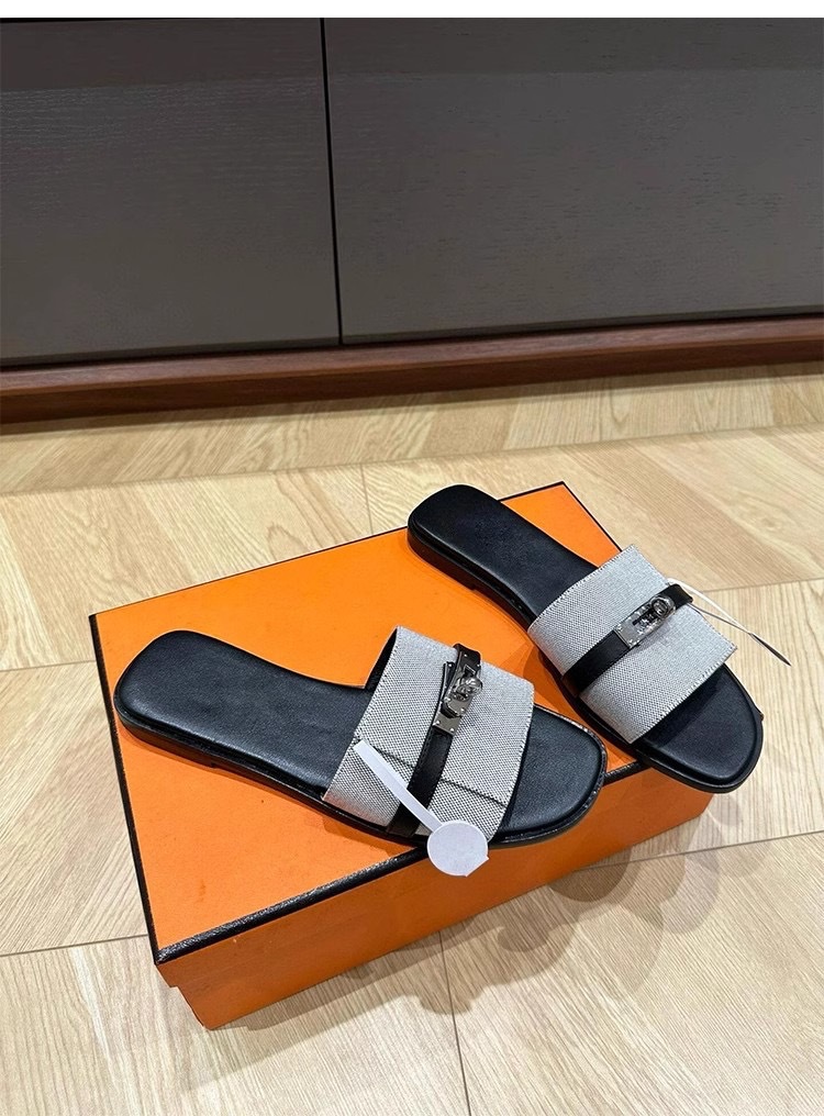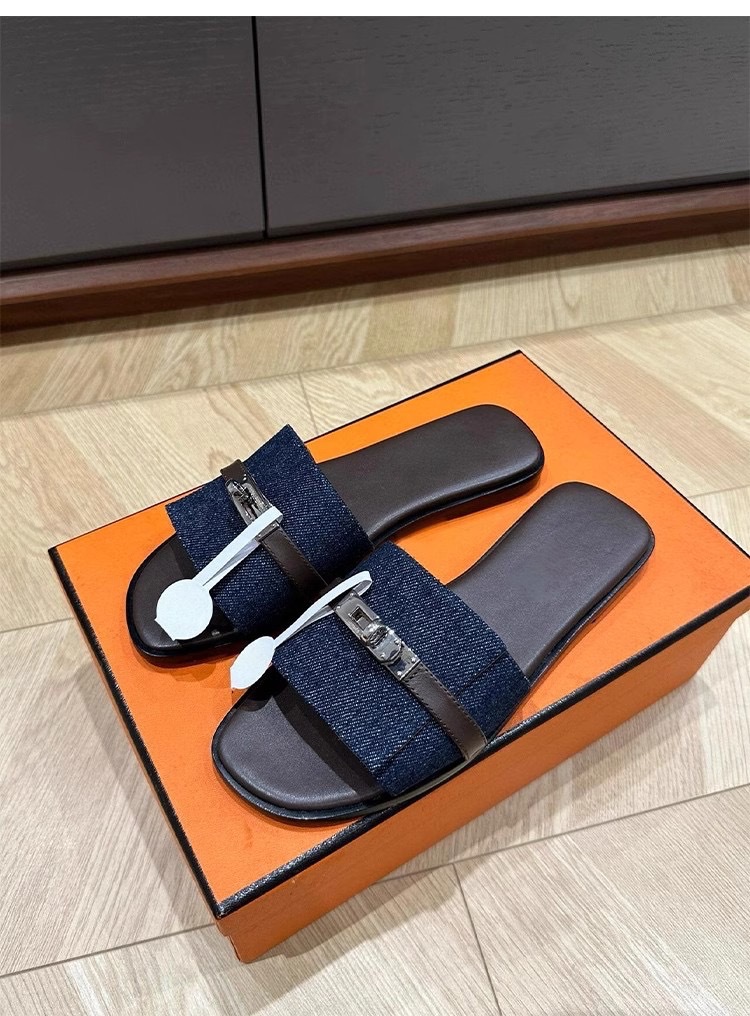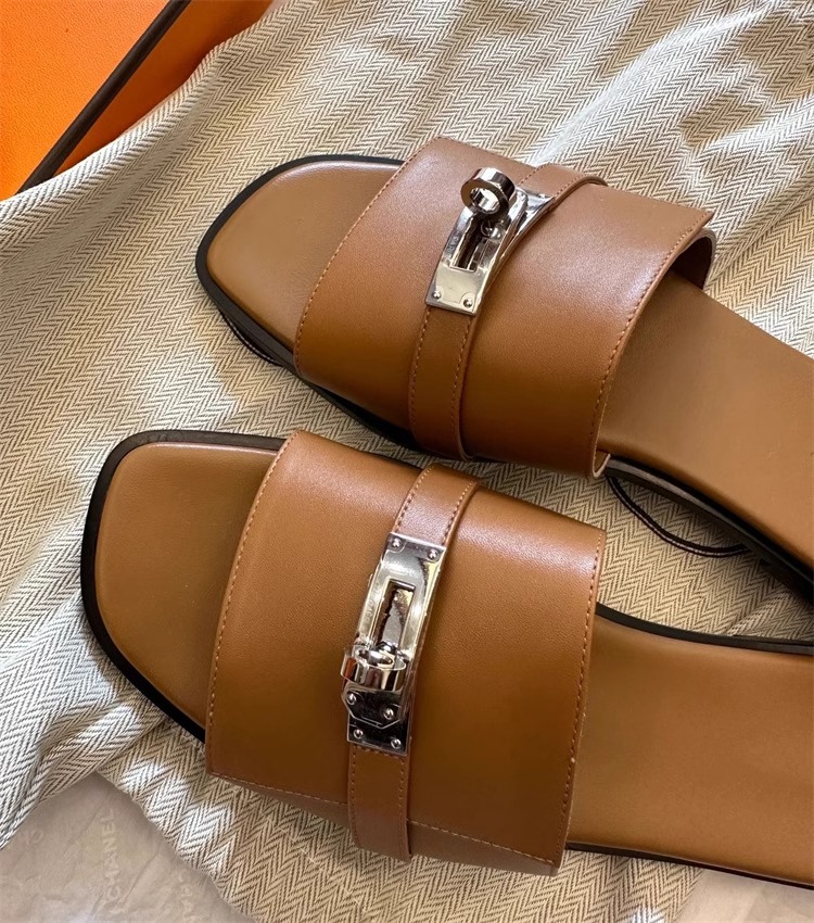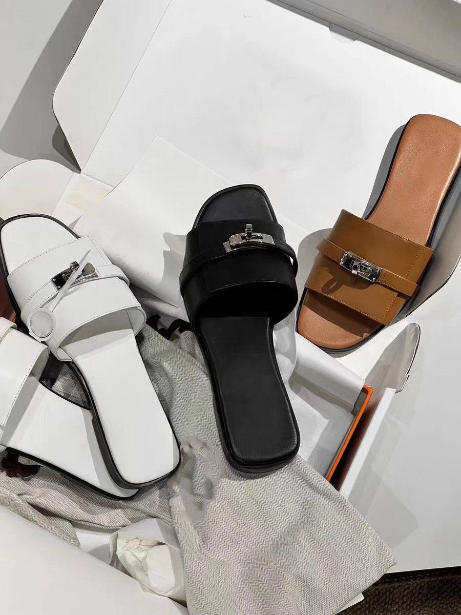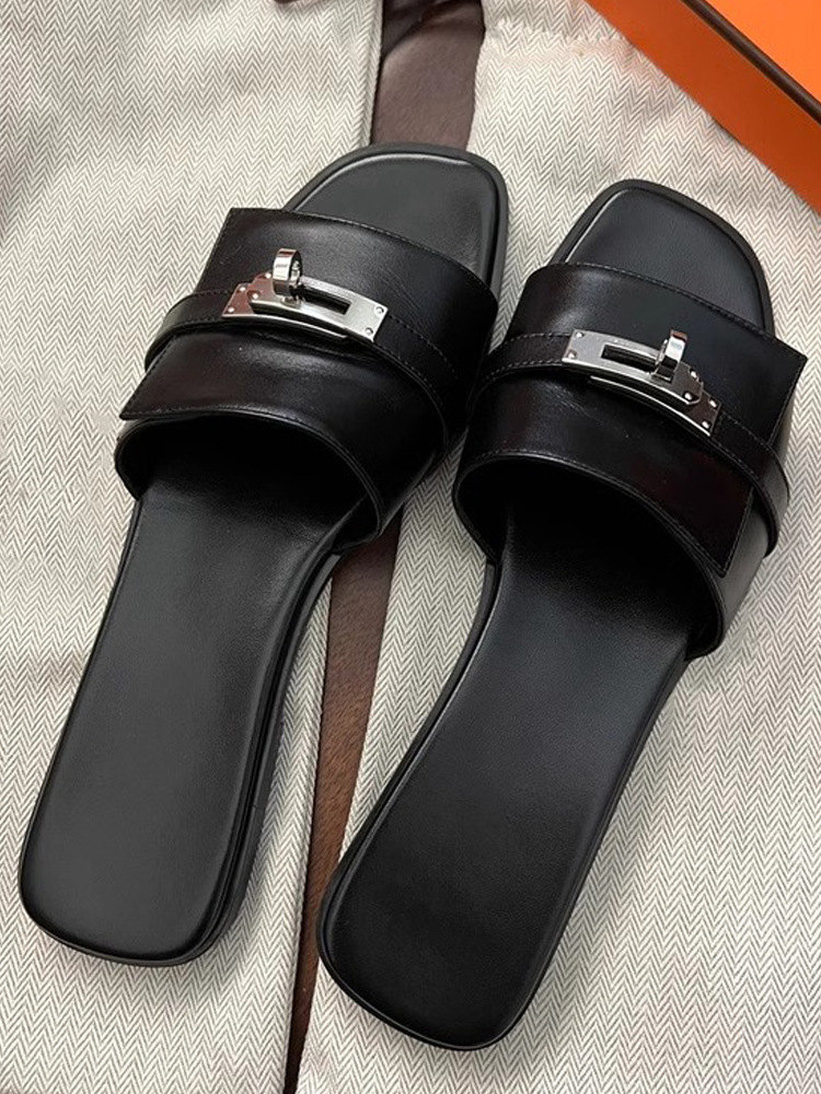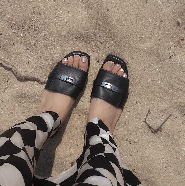 2024 새로운 프랑스 스타일 버클 금속 정품 가죽 슬라이드 여성 플랫 샌들 및 슬리퍼 사이버 인기 반 슬리퍼 여성 아우터웨어스토어 가기
