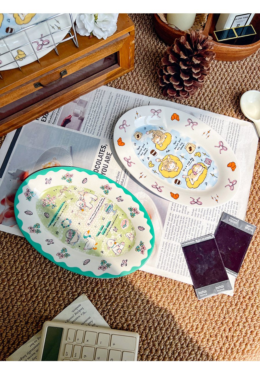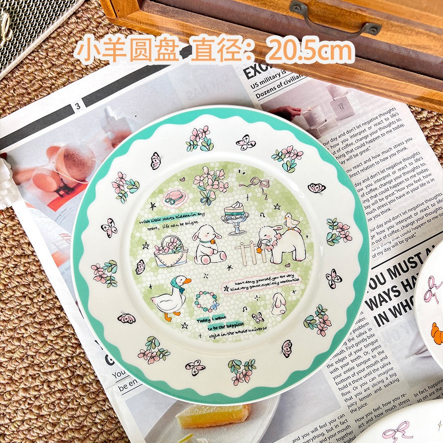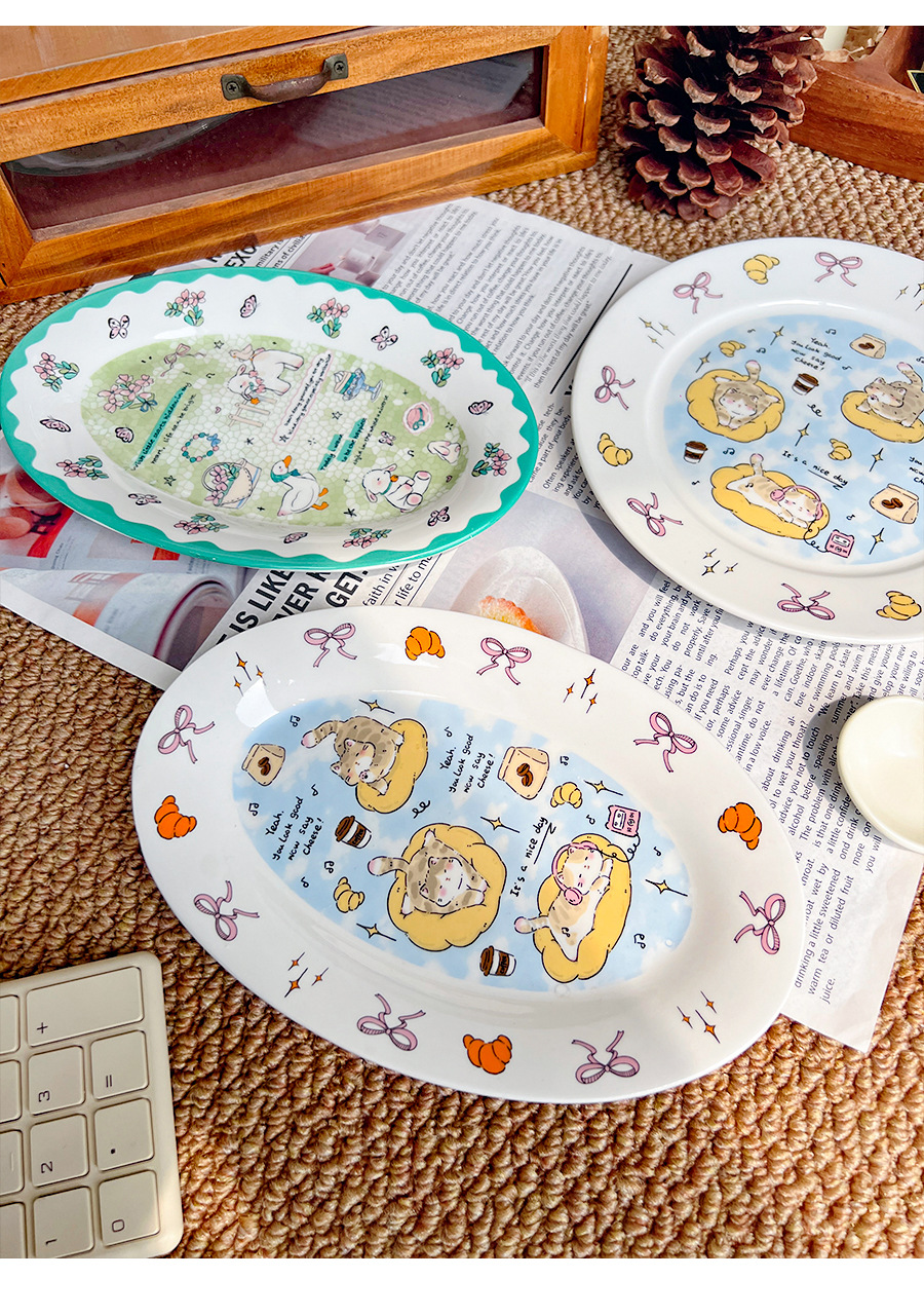 귀엽고 어린애 같은 힐링 스타일의 양과 고양이 일러스트 세라믹 디너 플레이트 과일 아침 식사 플레이트 타원형 플레이트 아름다운 플레이트스토어 가기