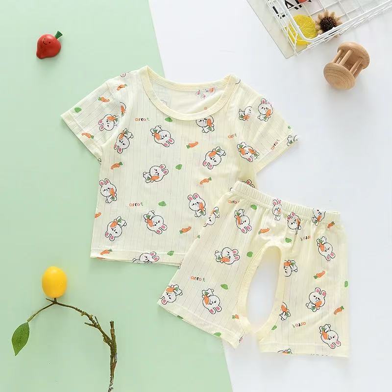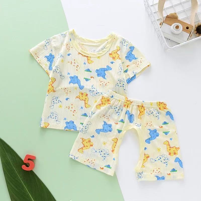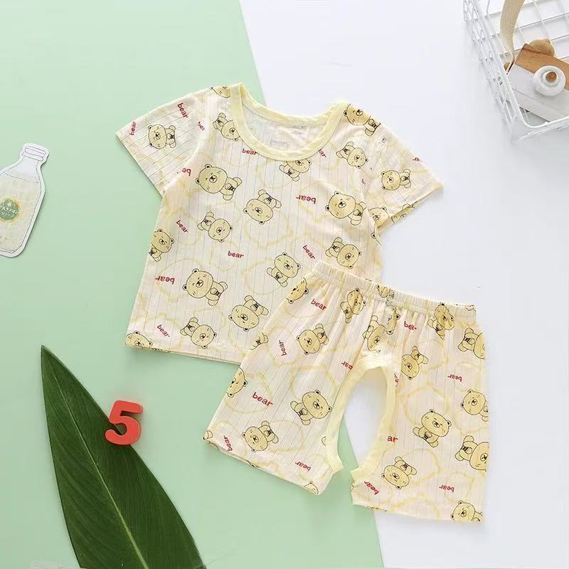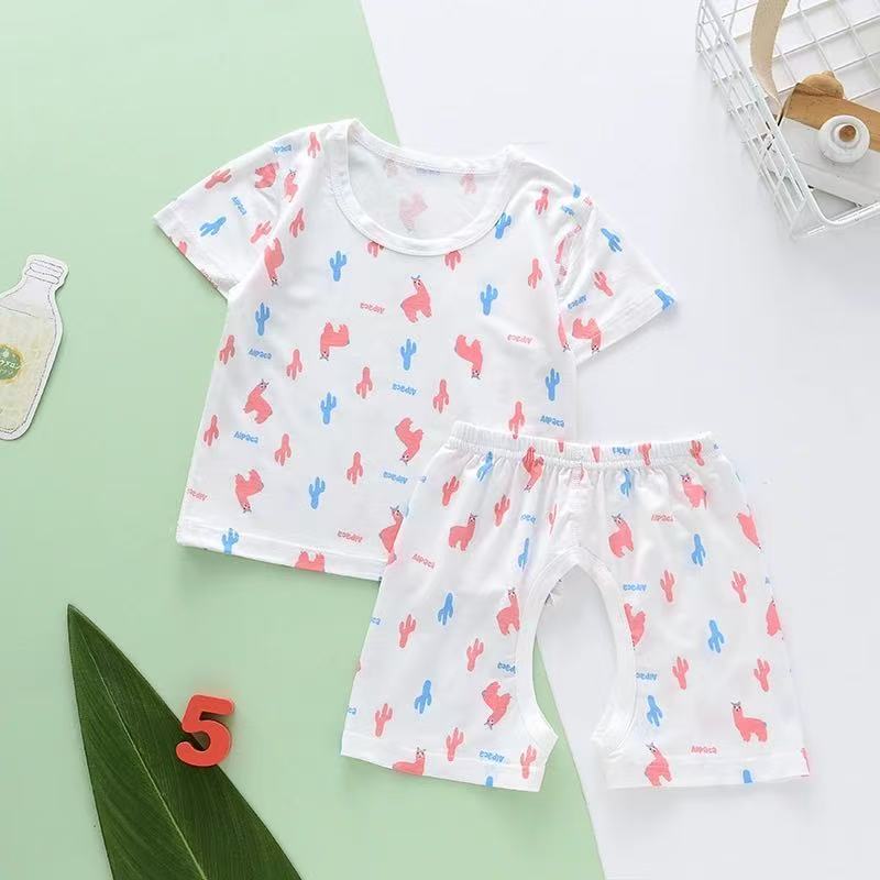 어린이 세트 여름 홈 얇은 모달 반팔 티셔츠 오픈 백 바지 세트 소년 소녀를위한 투피스 에어컨 세트