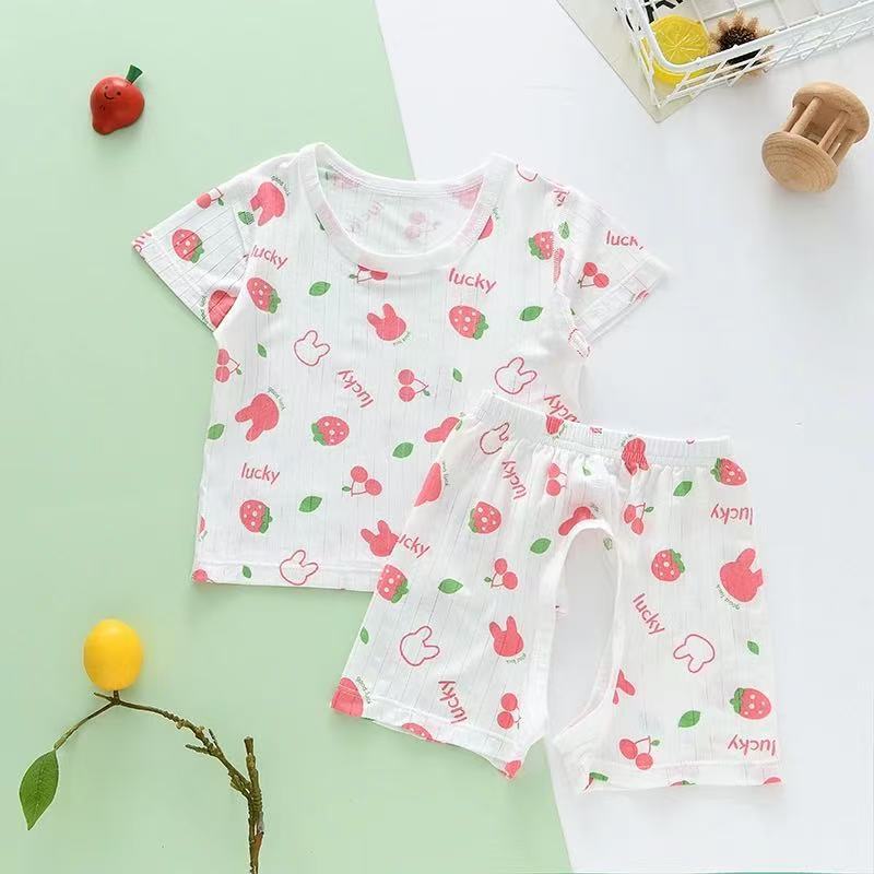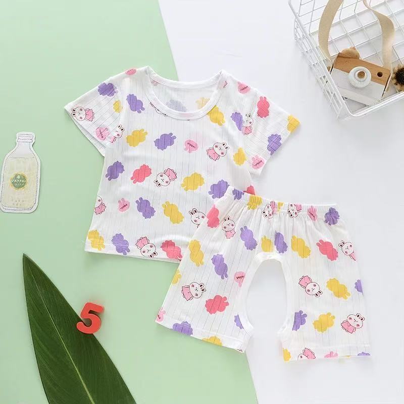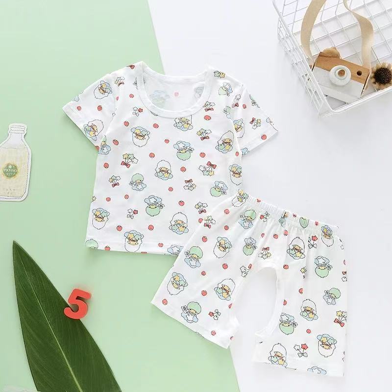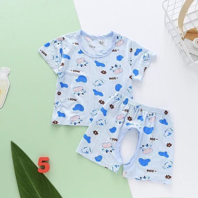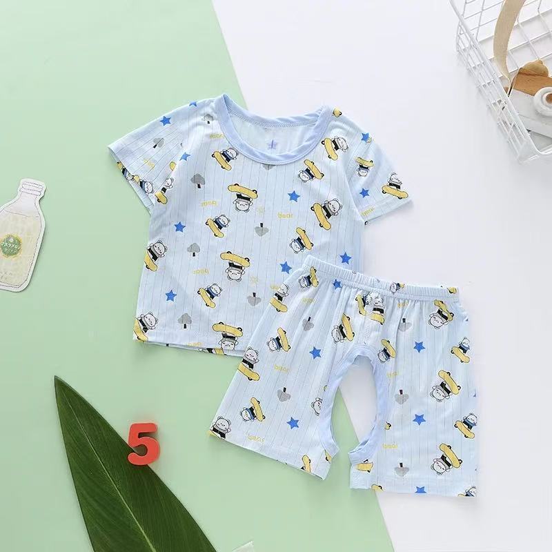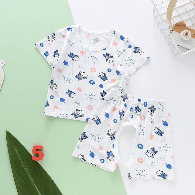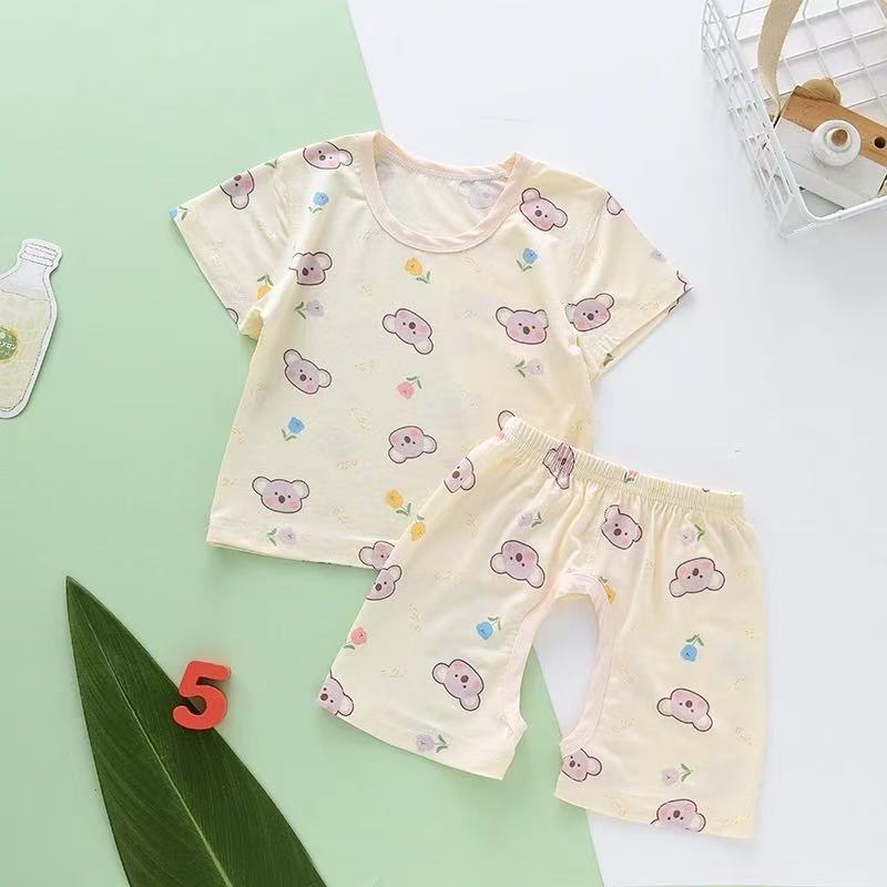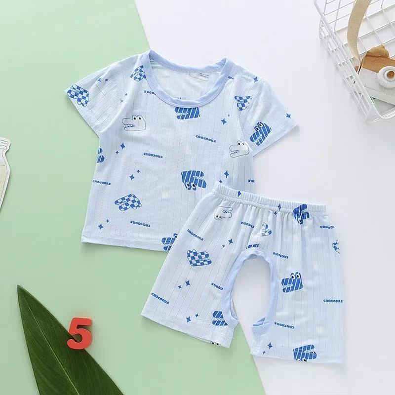 어린이 세트 여름 홈 얇은 모달 반팔 티셔츠 오픈 백 바지 세트 소년 소녀를위한 투피스 에어컨 세트스토어 가기