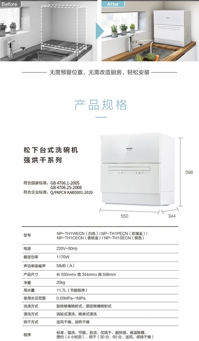 파나소닉 식기세척기 가정용 조리대 독립형 완전 자동 데스크탑 소형 식기세척기 설치 불필요 NP-TH1WECN