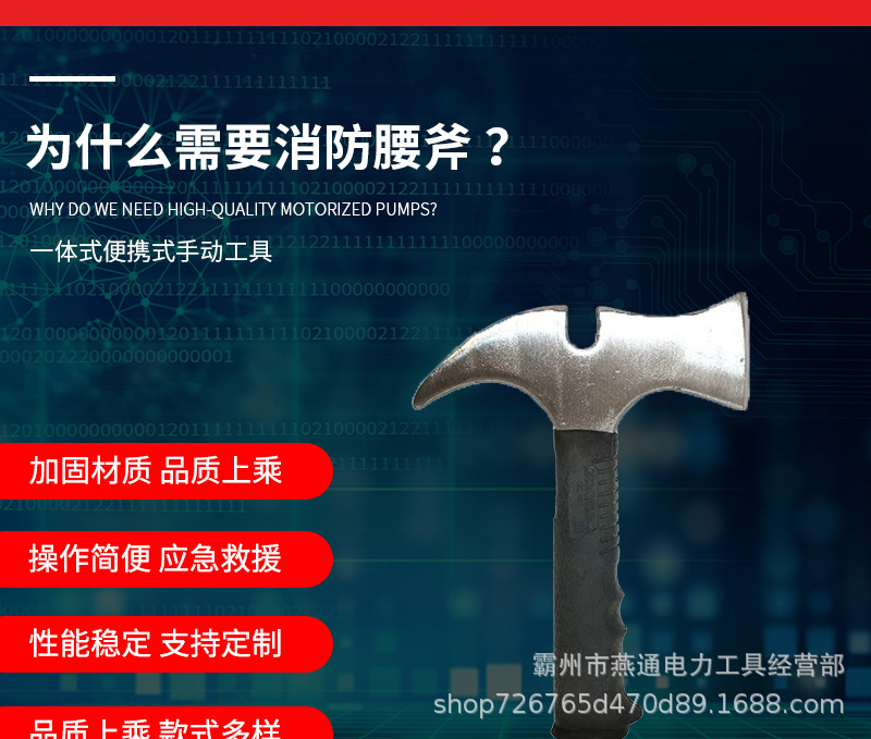 1.2适用于消防员随身佩戴,是集砍、斧、锤、撬、锯等功能为一体的便携式手动工具。并配有与消防腰斧匹配的牛皮腰斧套。
