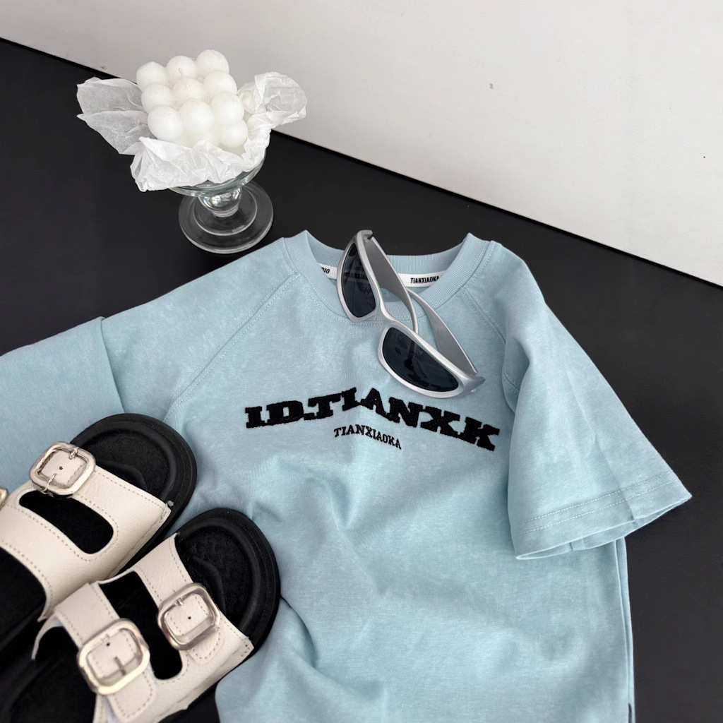 어린이 여름 티셔츠 2025 새로운 소년 자수 고난 눈송이 반팔 티셔츠 레트로 느슨한 소년 잘 생긴 성격