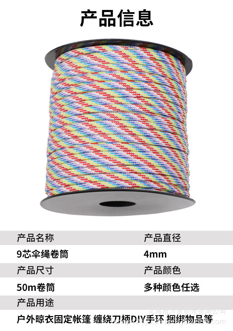 50m 축 장착 9 코어 4mm Paracord 야외 캠핑 비상 생존 로프 텐트 캐노피 당김 로프 방풍 로프스토어 가기