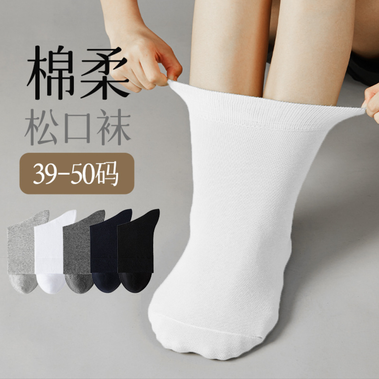 남성용 크로스보더 대형 양말 5켤레, 발을 조이지 않는 헐렁한 남성용 양말, 심플한 단색 종아리 양말, 통기성이 좋은 면 양말스토어 가기
