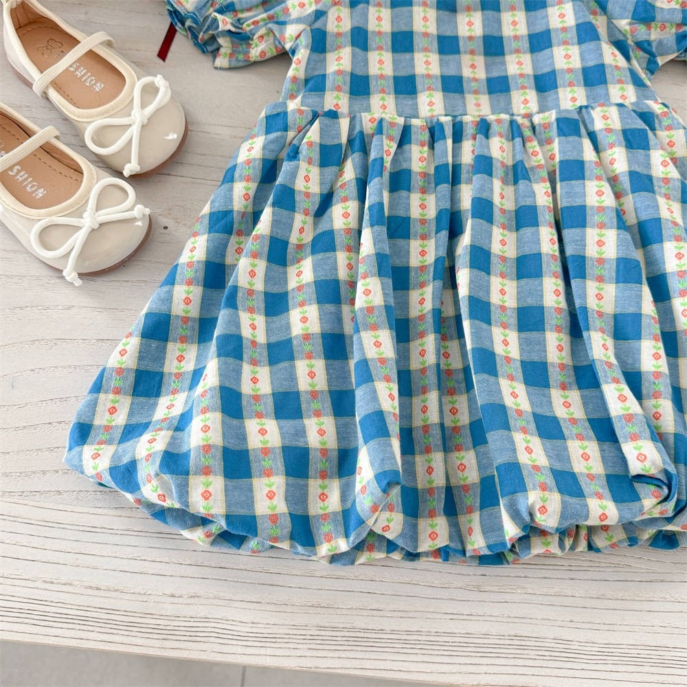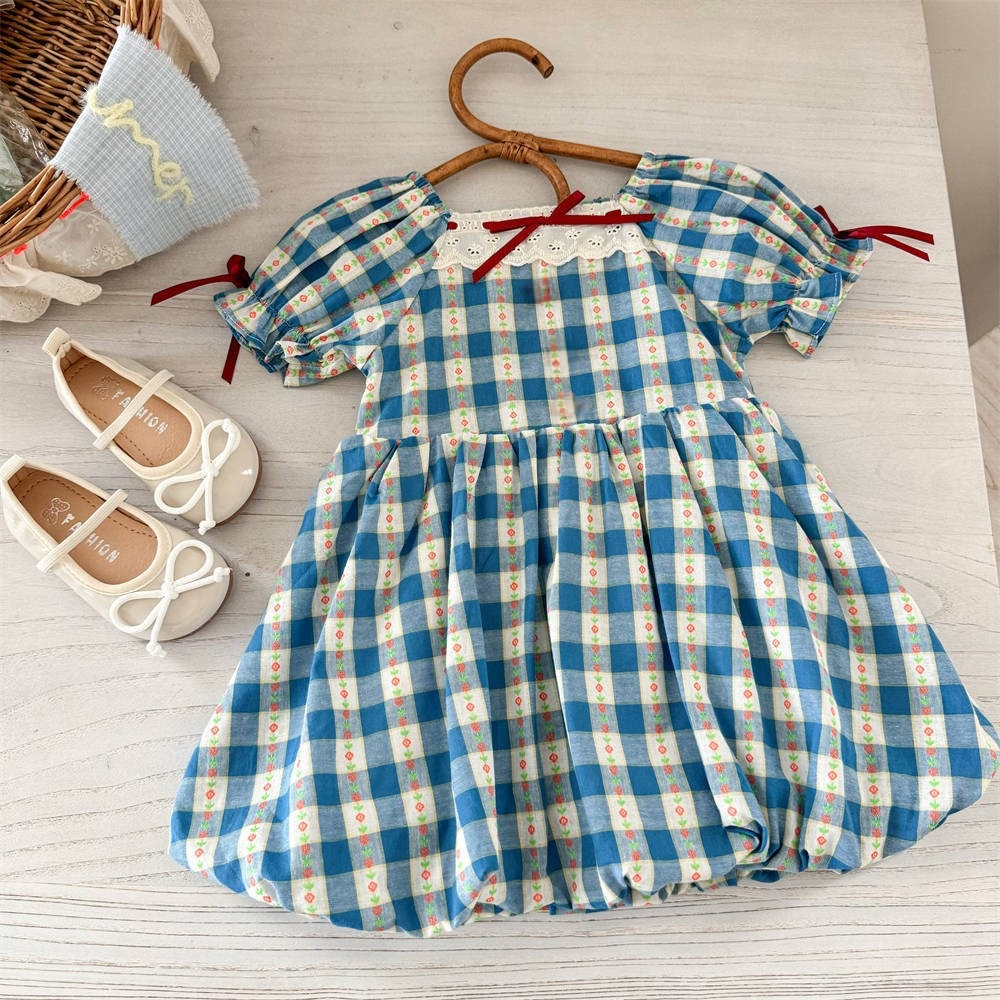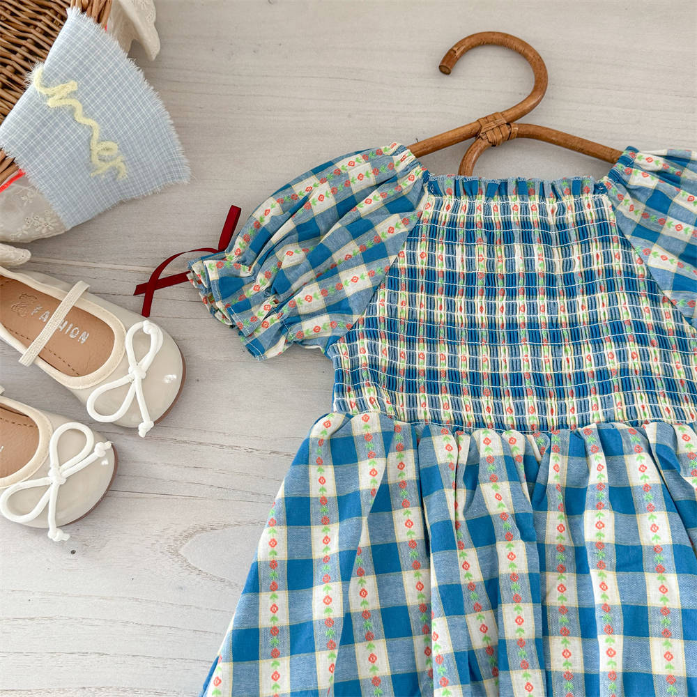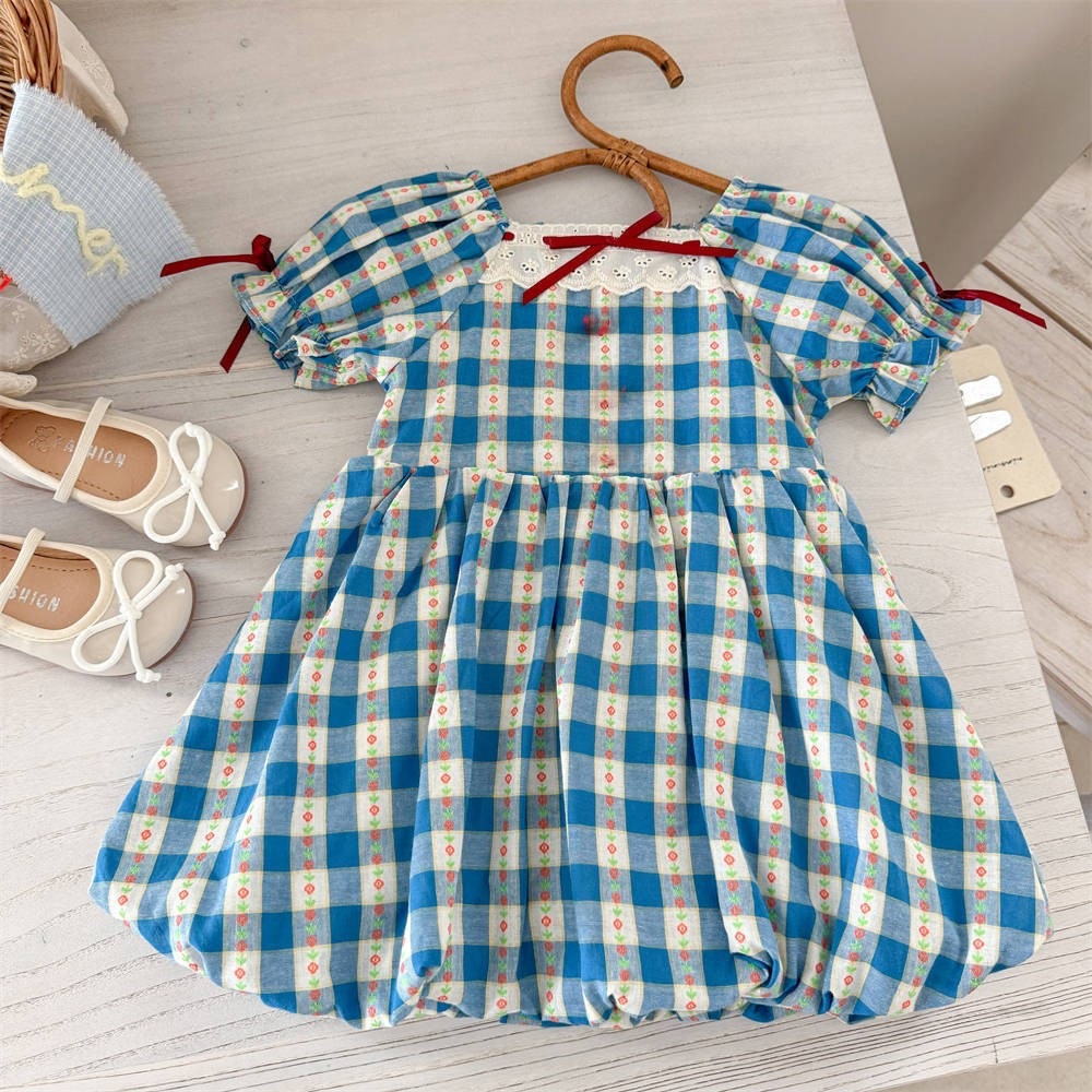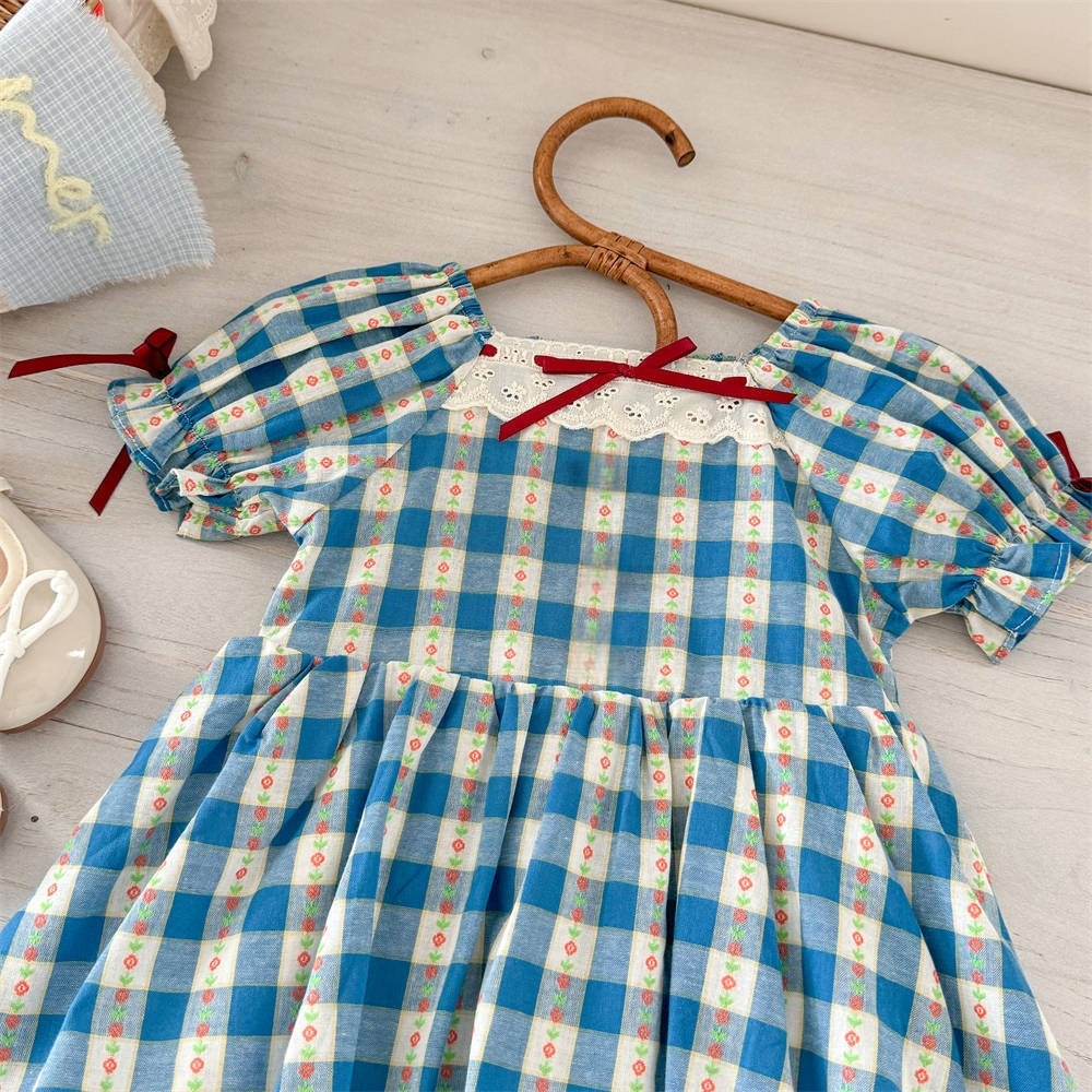 [세븐 리틀 세븐] 여아 원피스 블루 체크무늬 반팔 프렌치 플라워 스커트 여름 신상 달콤하고 스타일리쉬한 공주풍