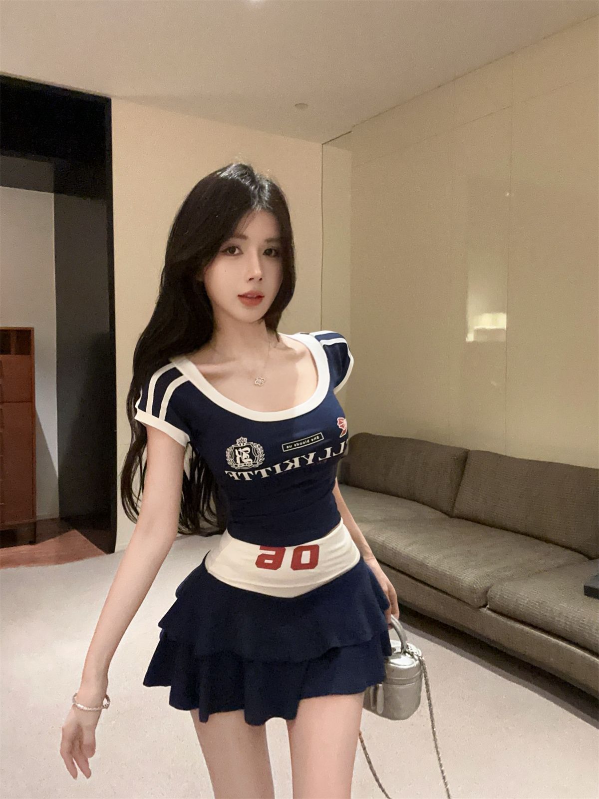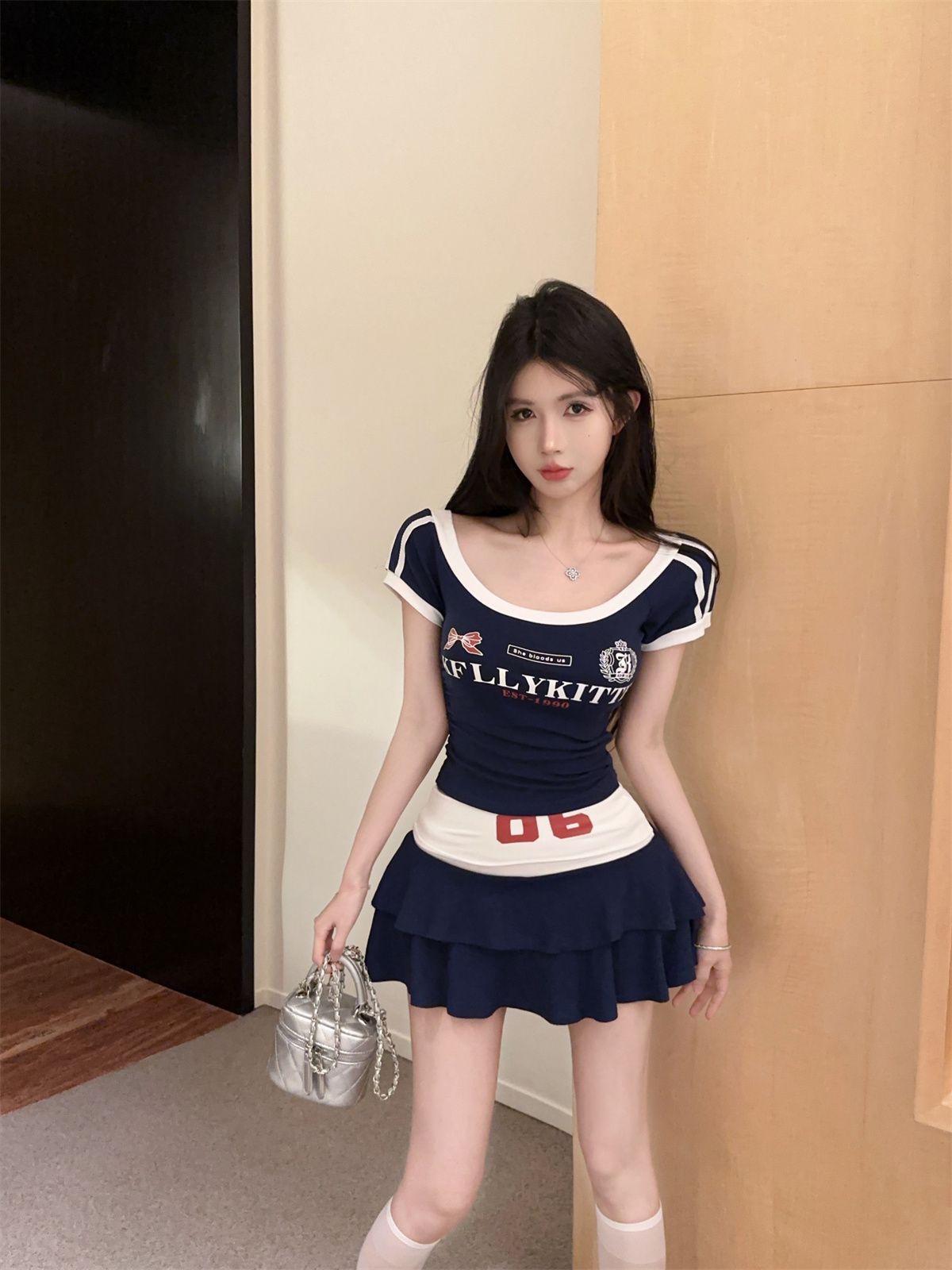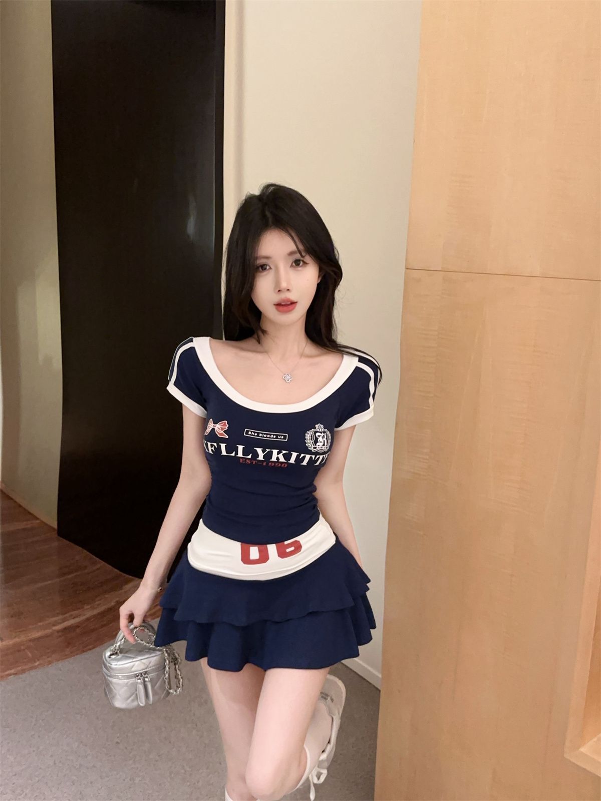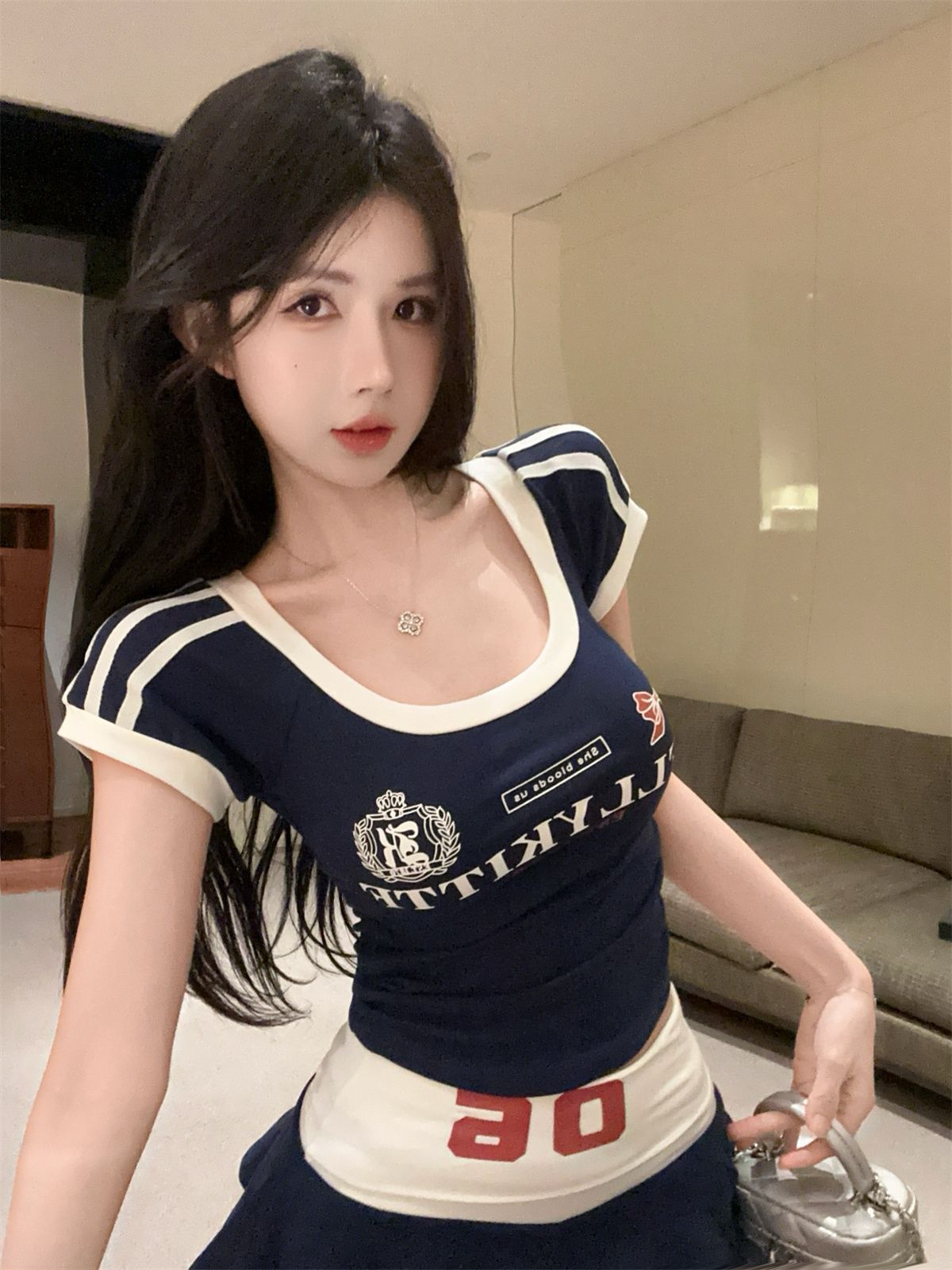 아메리칸 레트로 핫걸 대비 색상 슬리밍 반팔 티셔츠 탑 여성 여름 저지 스타일 섹시한 a 라인 스커트 스포츠 슈트스토어 가기