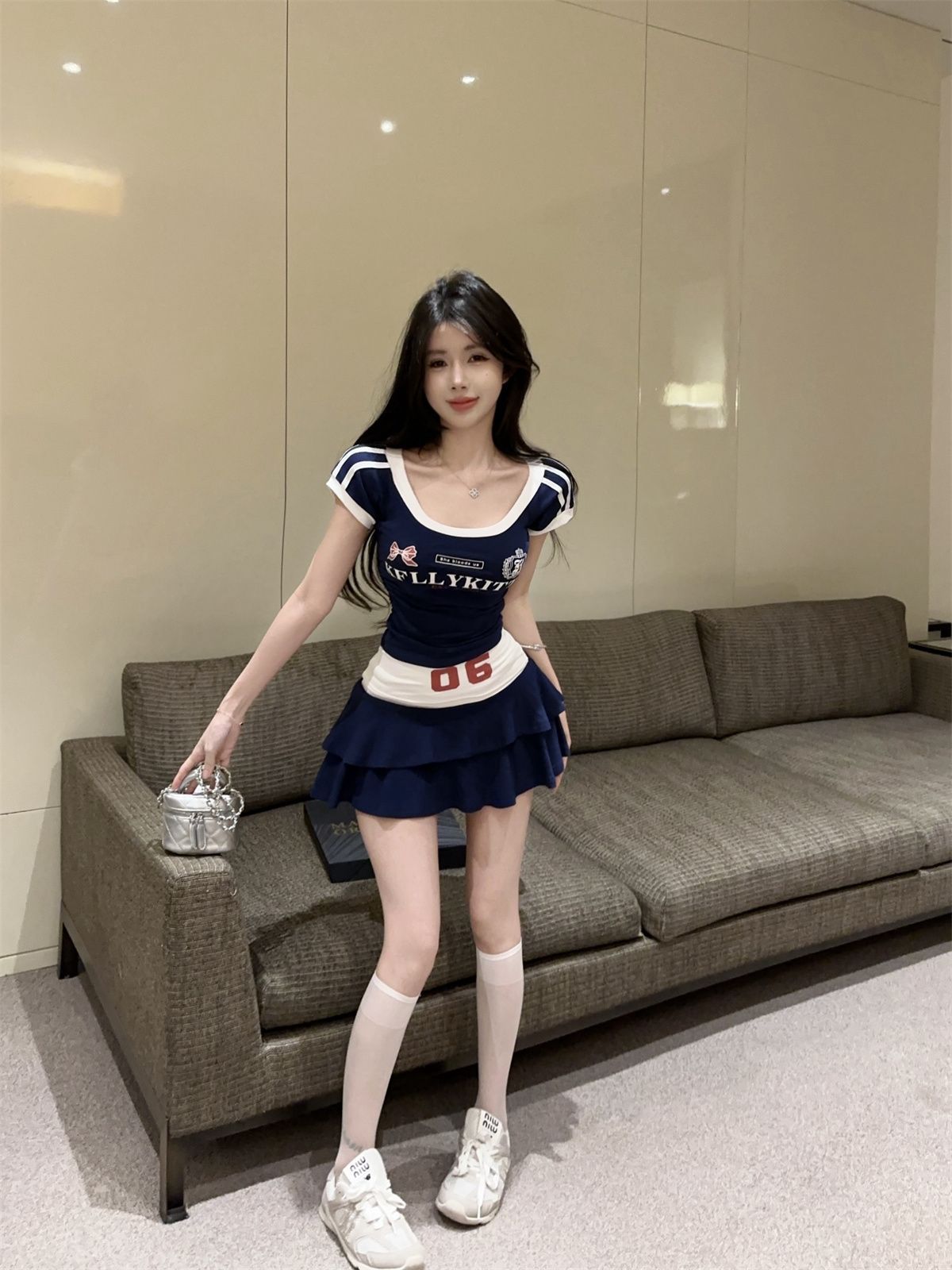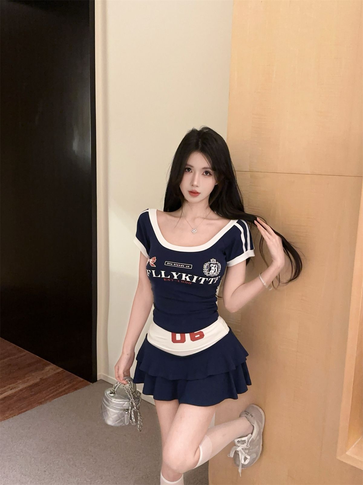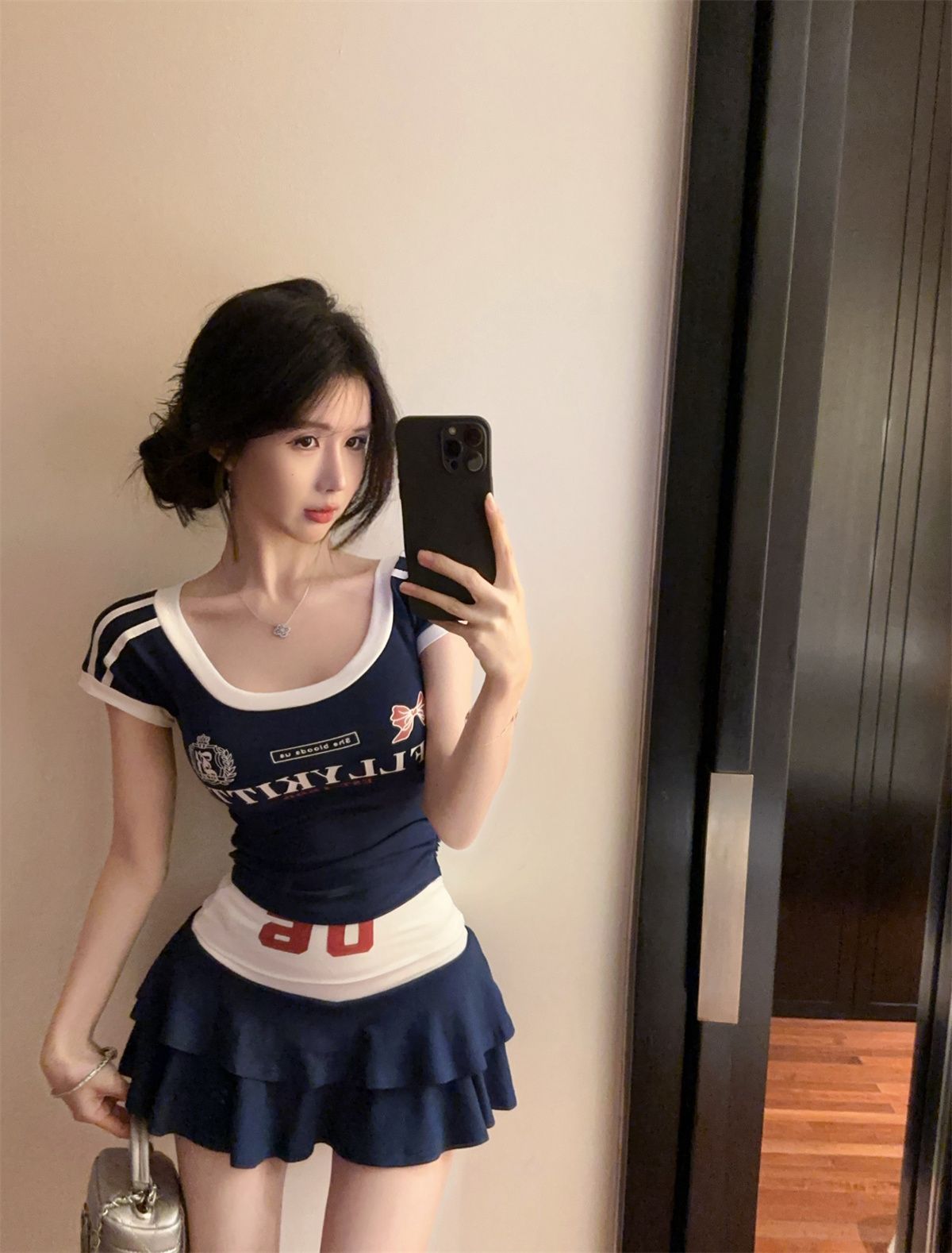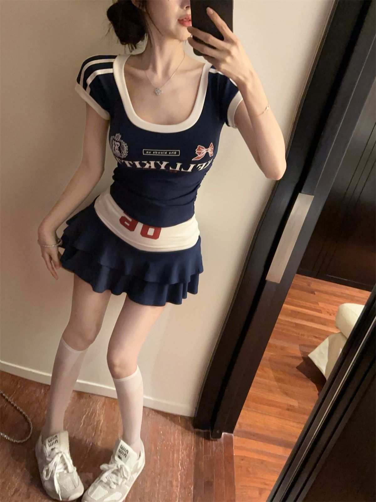 아메리칸 레트로 핫걸 대비 색상 슬리밍 반팔 티셔츠 탑 여성 여름 저지 스타일 섹시한 a 라인 스커트 스포츠 슈트스토어 가기