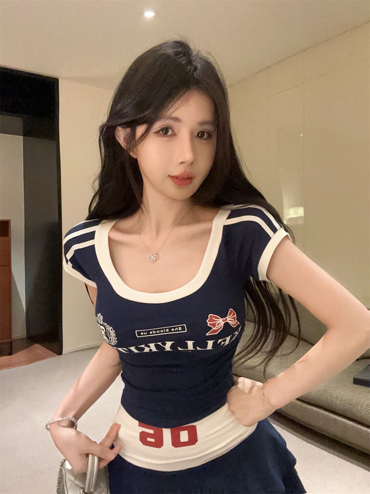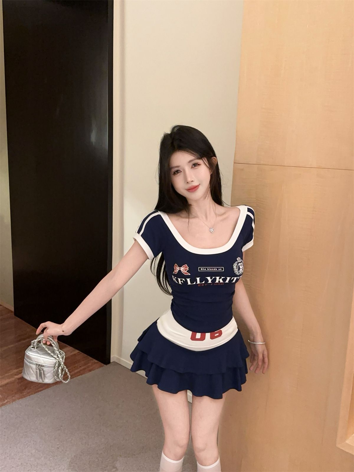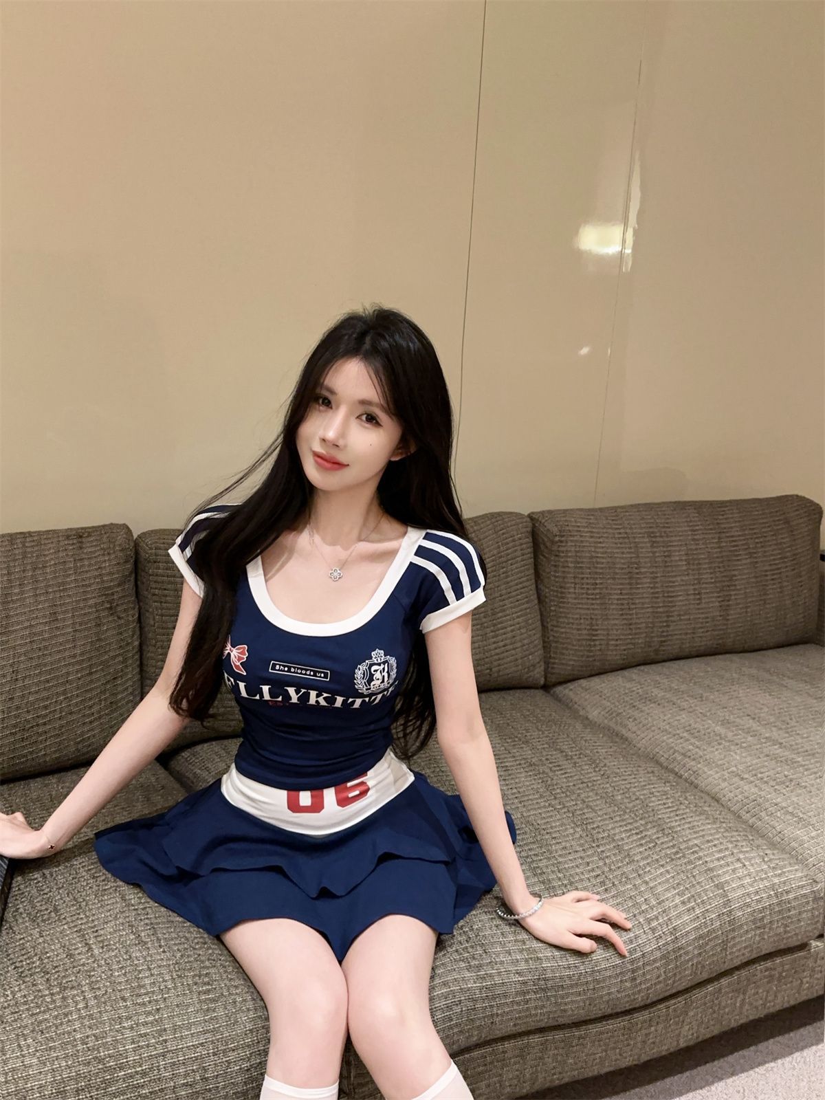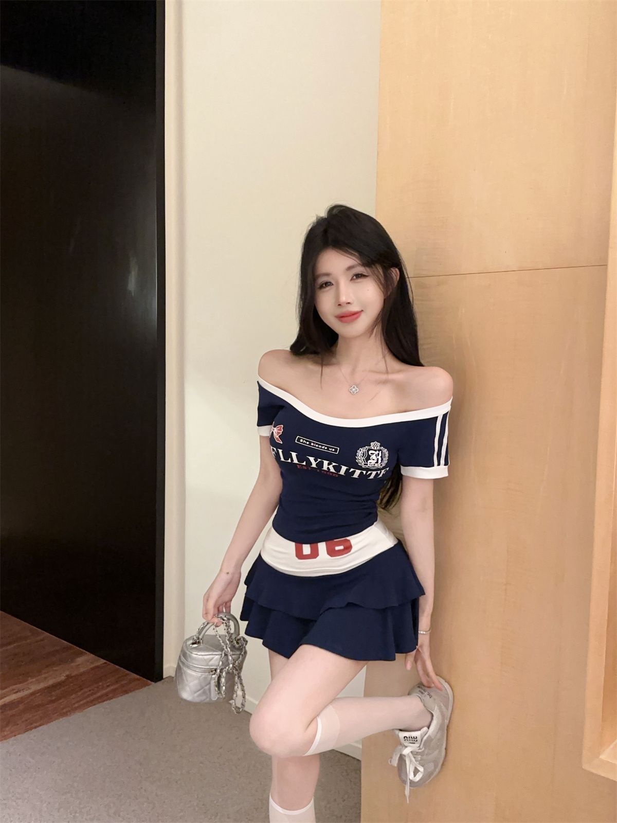 아메리칸 레트로 핫걸 대비 색상 슬리밍 반팔 티셔츠 탑 여성 여름 저지 스타일 섹시한 a 라인 스커트 스포츠 슈트스토어 가기
