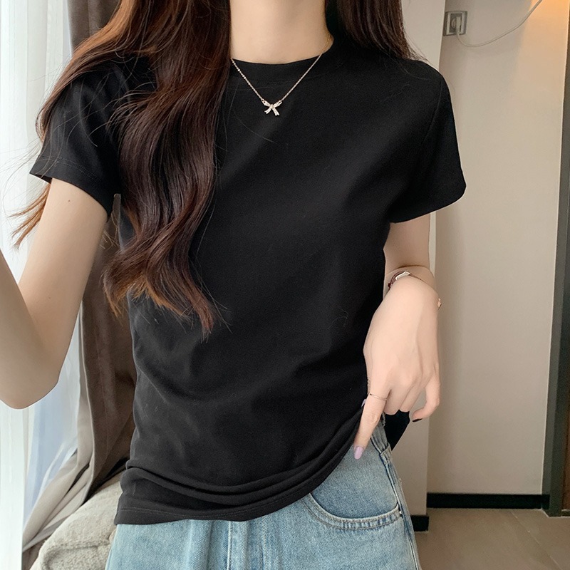 아메리칸 화이트 티셔츠 여성용 오른쪽 어깨 반팔 유럽 제품 2025 새로운 슬림 라운드 넥 퓨어 코튼 레이어드 탑스토어 가기