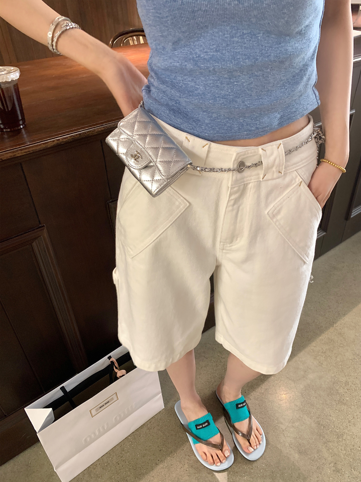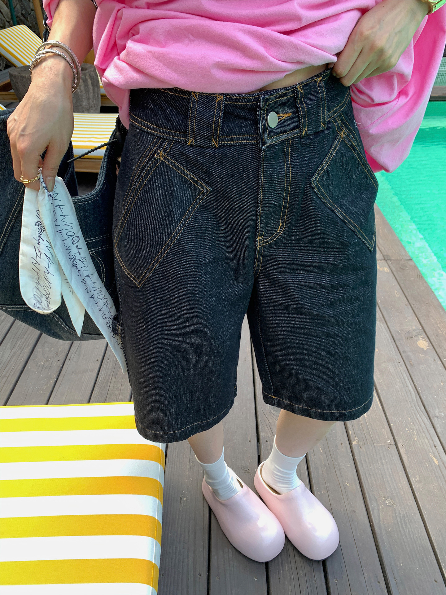 오우양 콘트라스트 컬러 데님 반바지 여성용 여름 얇은 루즈핏 스트레이트 5부 바지 하이웨이스트 슬리밍 레트로 팬츠스토어 가기