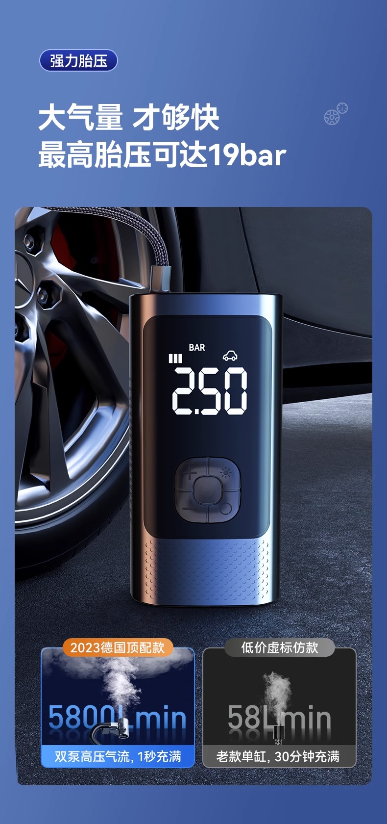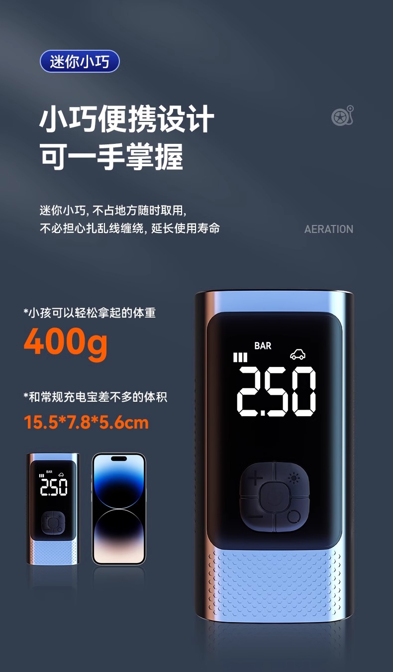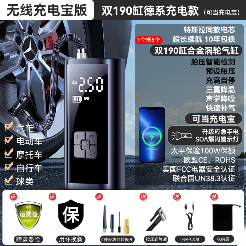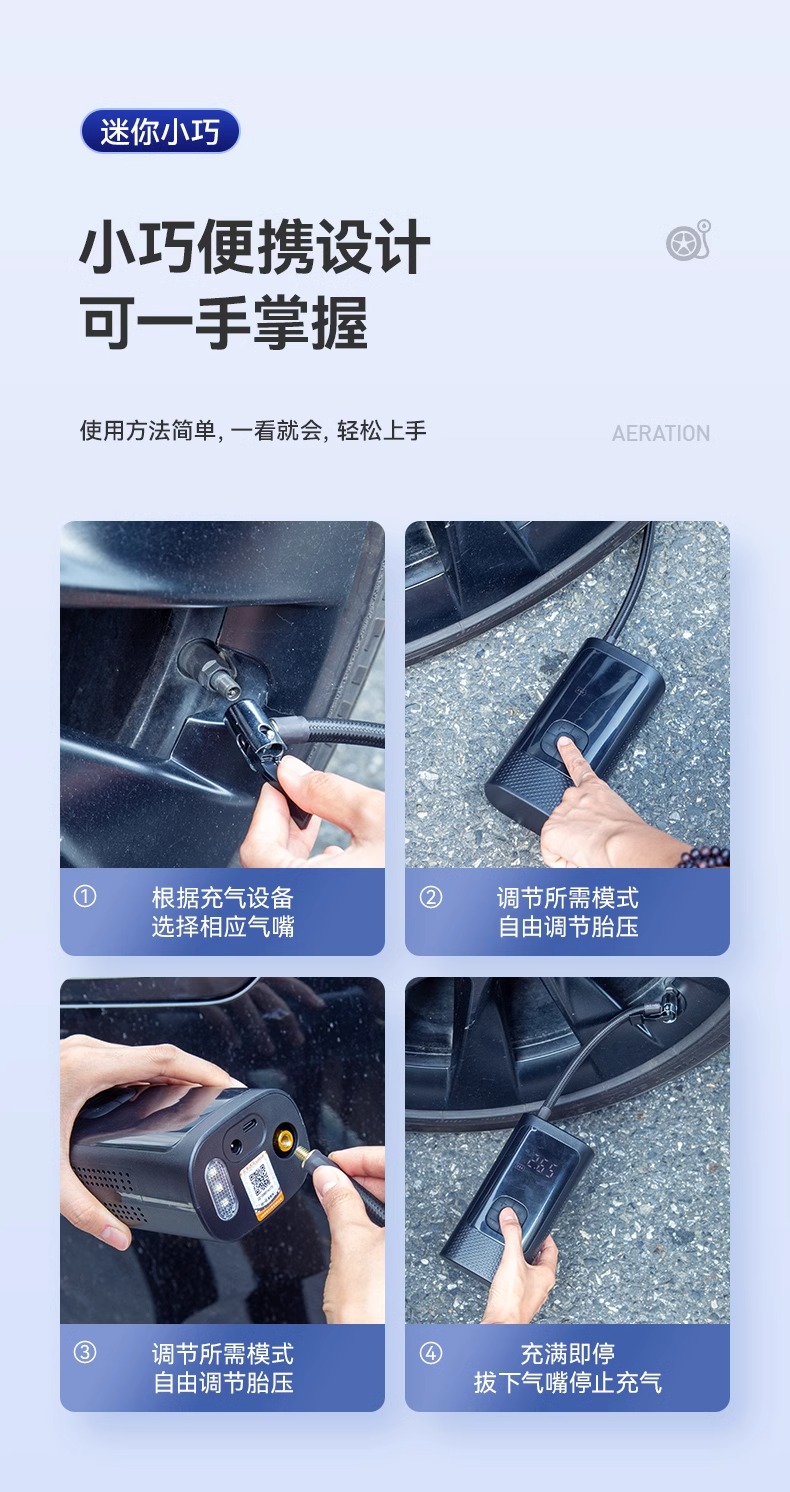 • 【초충전 폴리머 전압 리튬 배터리★유무선 이중 사용★보조 배터리로 사용 가능] + 질소 충전 타이어 보호 + 지능형 압력 측정 플래시 충전 + 타이어 수리 도구