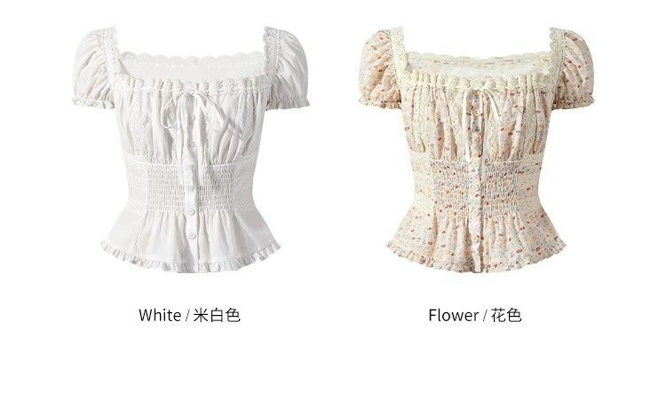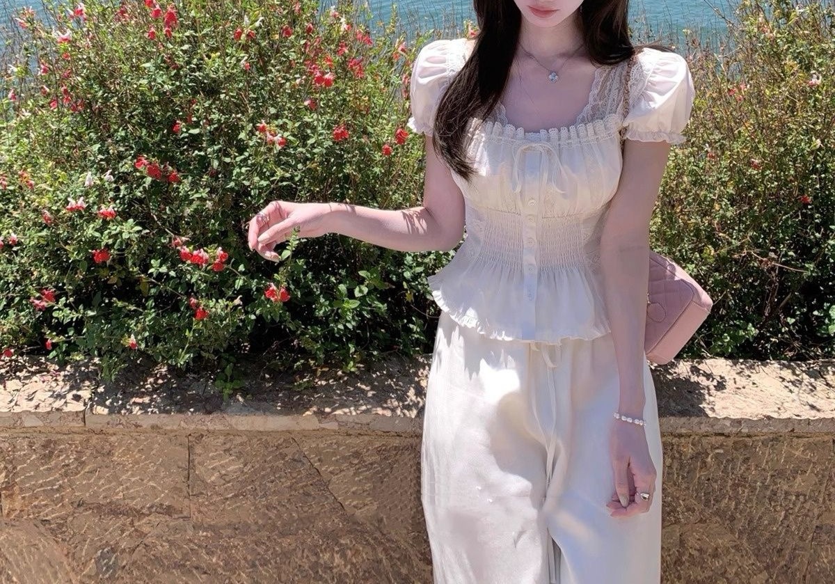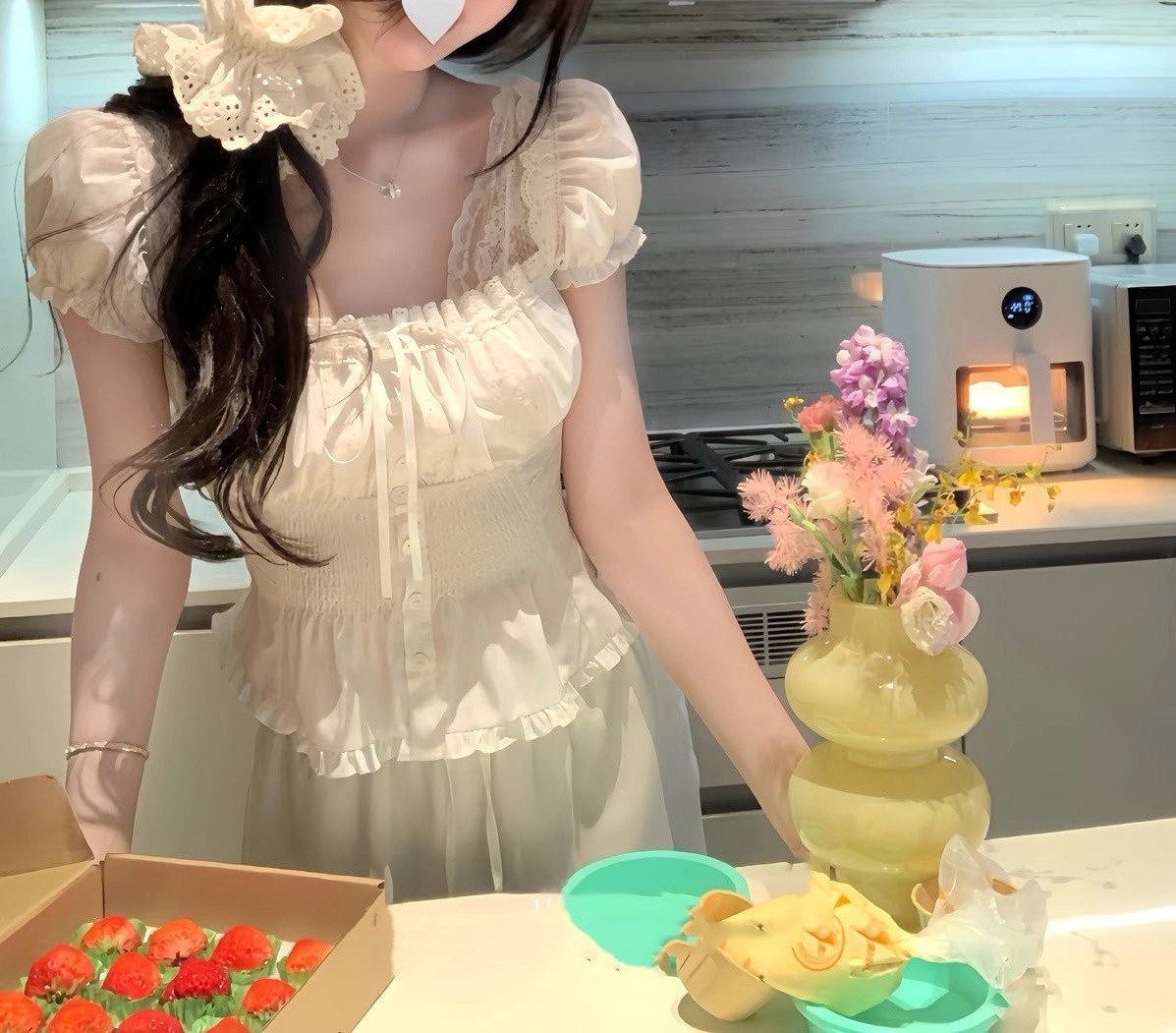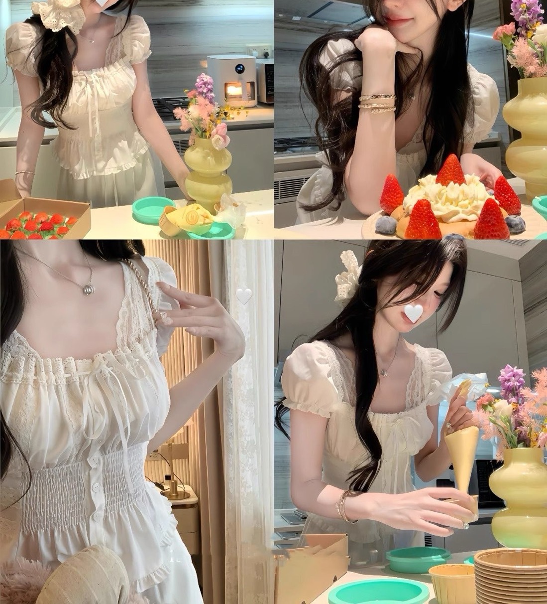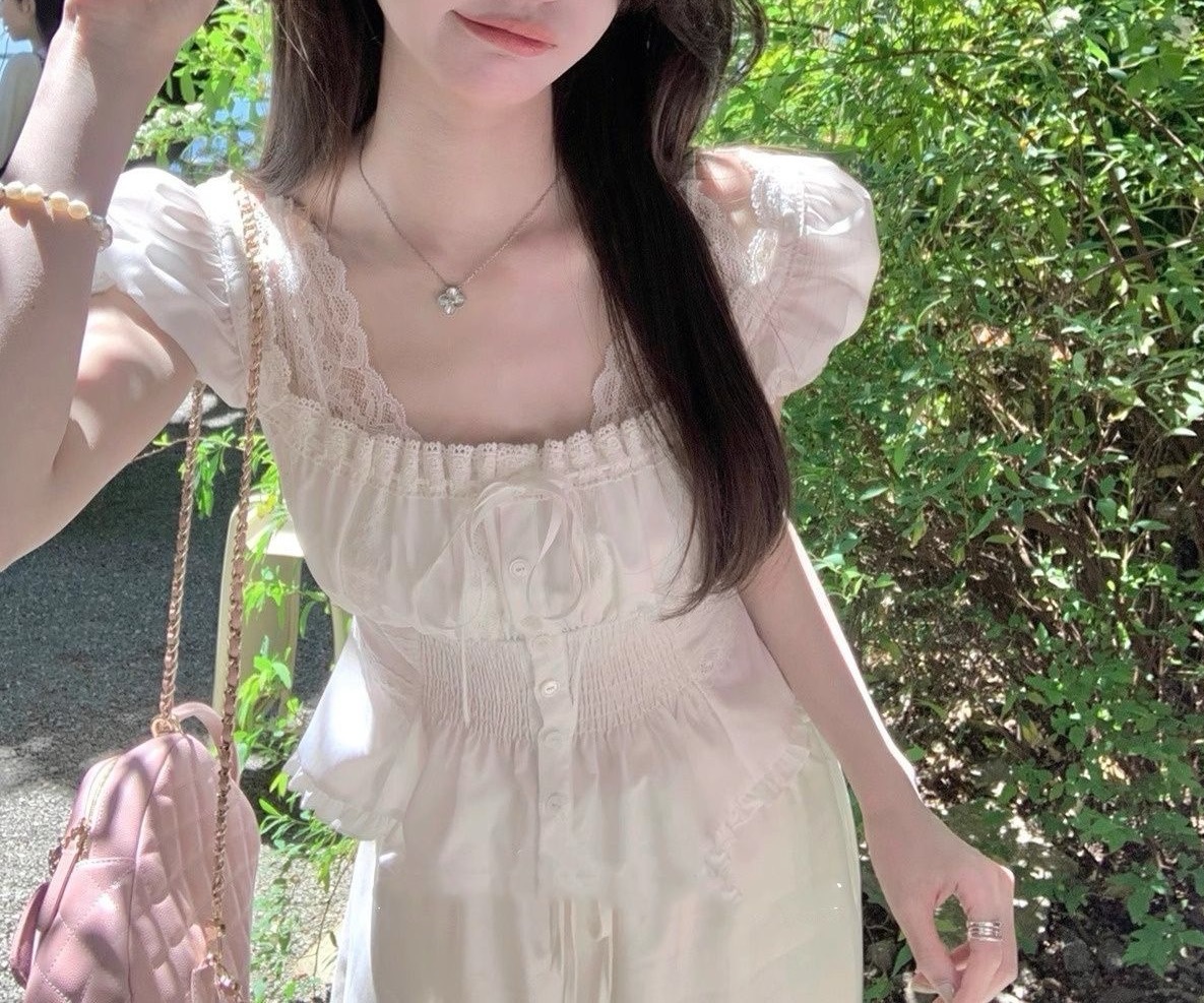 화이트 워터 여성의 화이트 로즈 밀크 퍼프 퍼프 슬리브 탑 여성의 순수한 욕망 분위기 센스 슬림 핏 슬리밍 아우터 웨어 쇼트 슬리브 탑