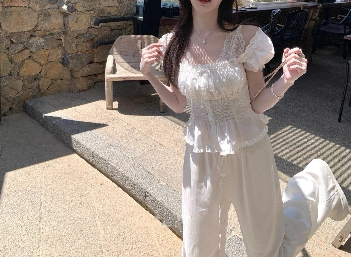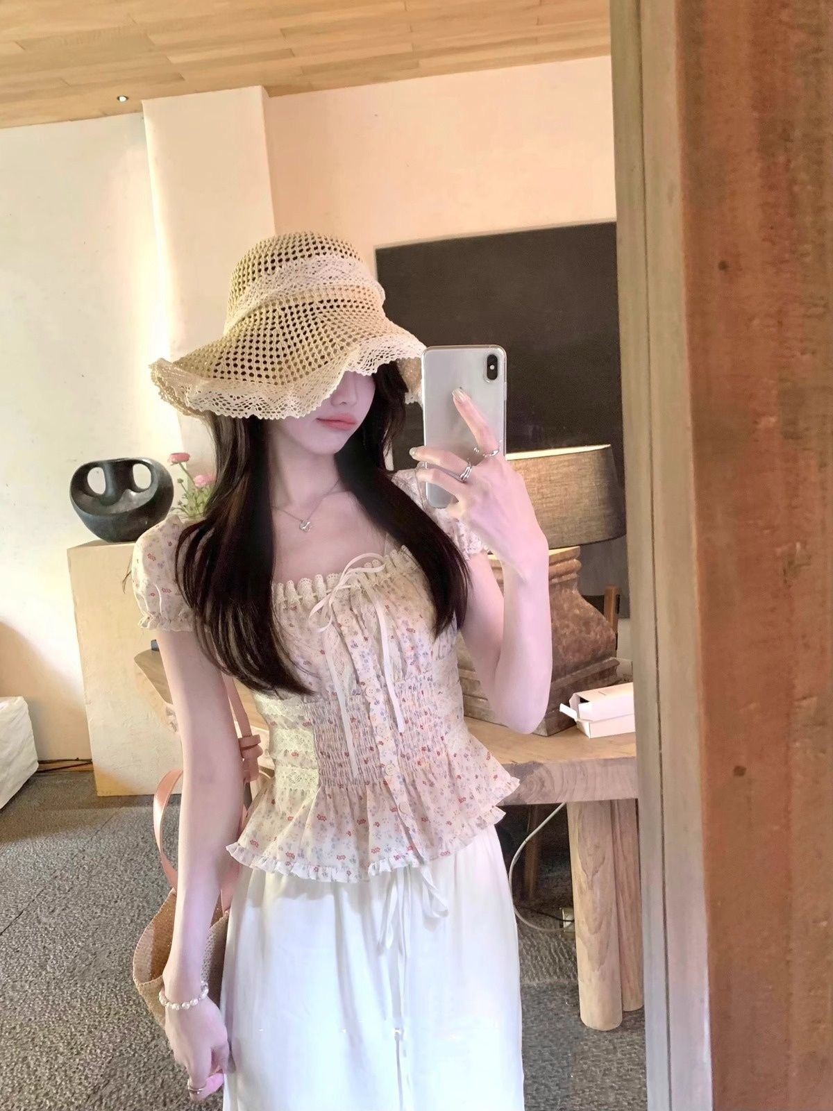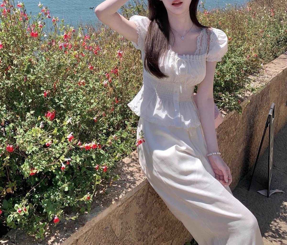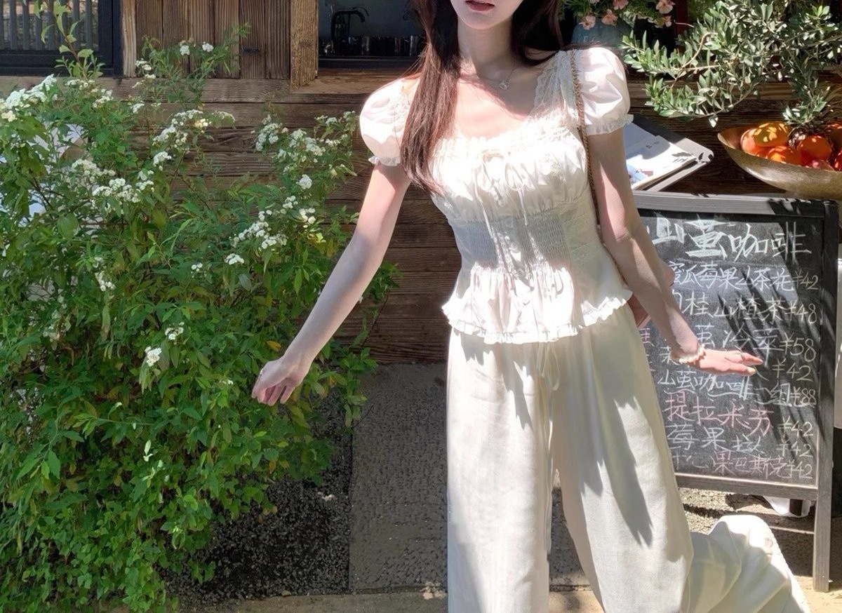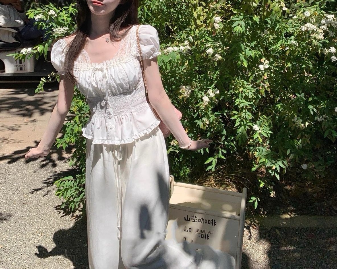 화이트 워터 여성의 화이트 로즈 밀크 퍼프 퍼프 슬리브 탑 여성의 순수한 욕망 분위기 센스 슬림 핏 슬리밍 아우터 웨어 쇼트 슬리브 탑