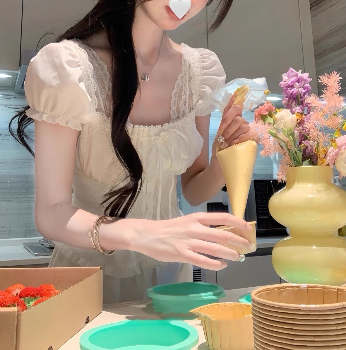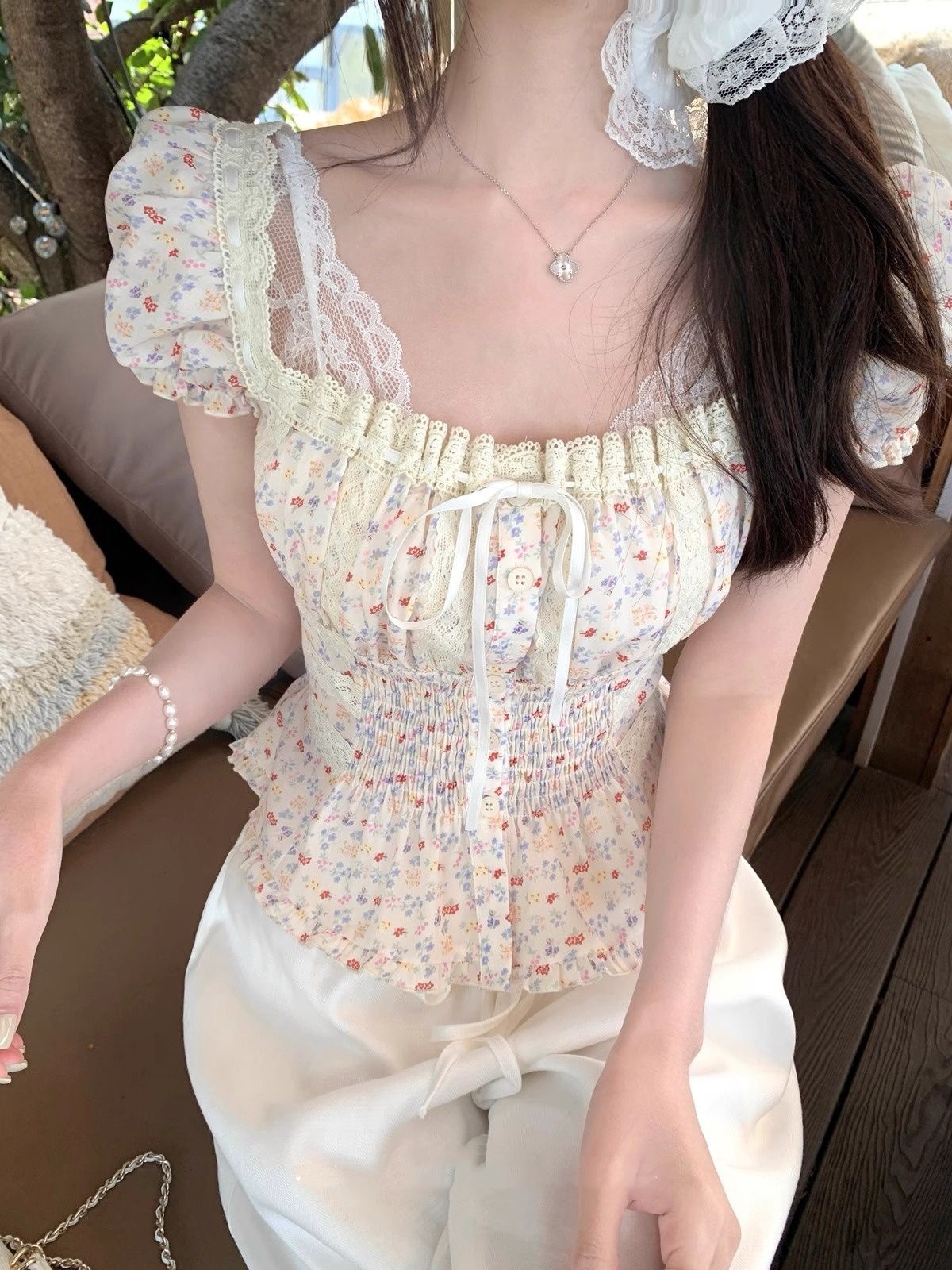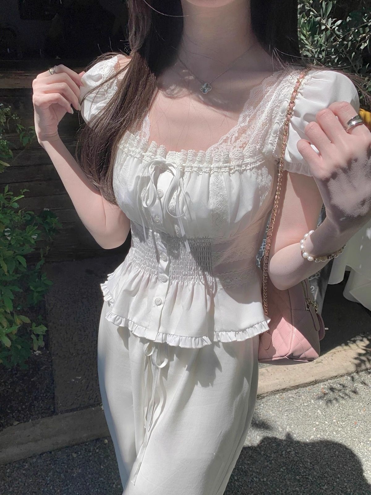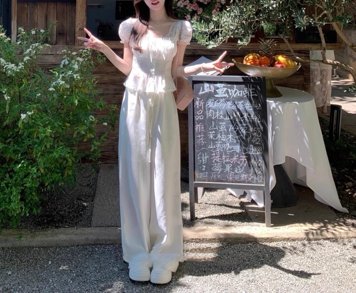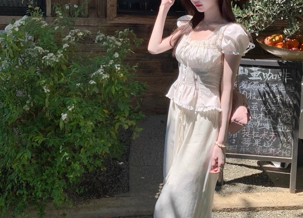 화이트 워터 여성의 화이트 로즈 밀크 퍼프 퍼프 슬리브 탑 여성의 순수한 욕망 분위기 센스 슬림 핏 슬리밍 아우터 웨어 쇼트 슬리브 탑