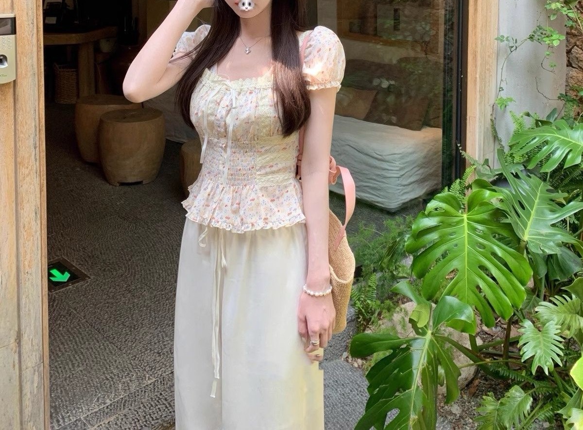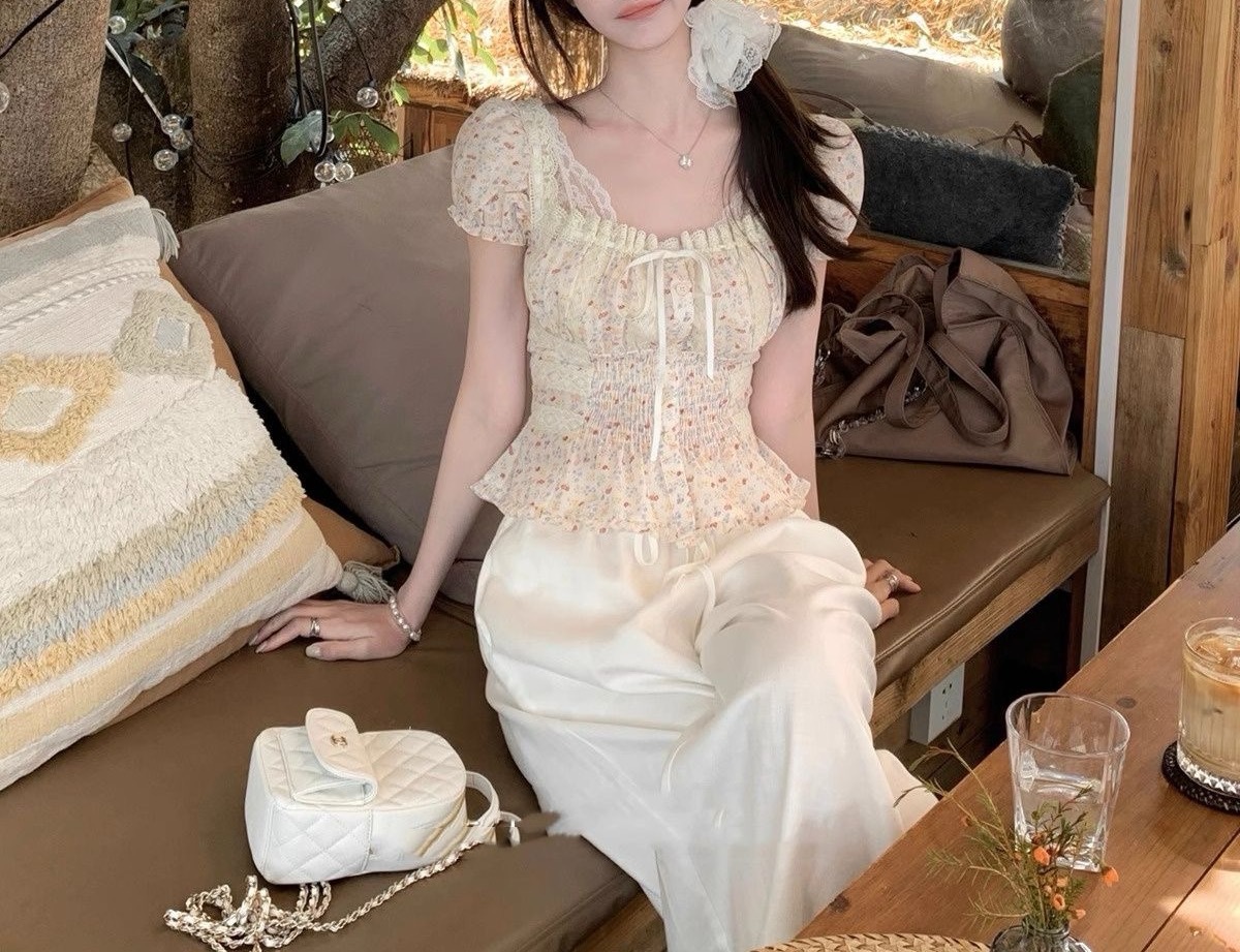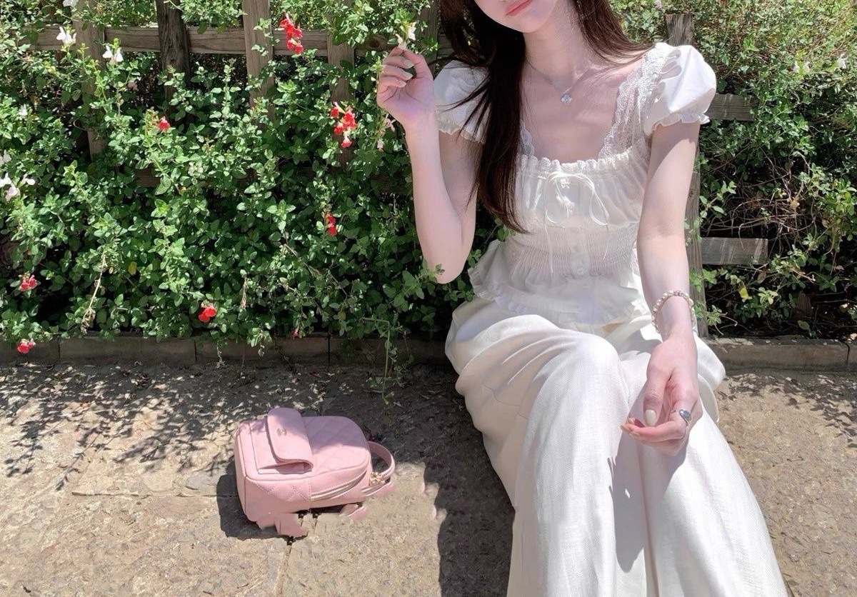 화이트 워터 여성의 화이트 로즈 밀크 퍼프 퍼프 슬리브 탑 여성의 순수한 욕망 분위기 센스 슬림 핏 슬리밍 아우터 웨어 쇼트 슬리브 탑스토어 가기
