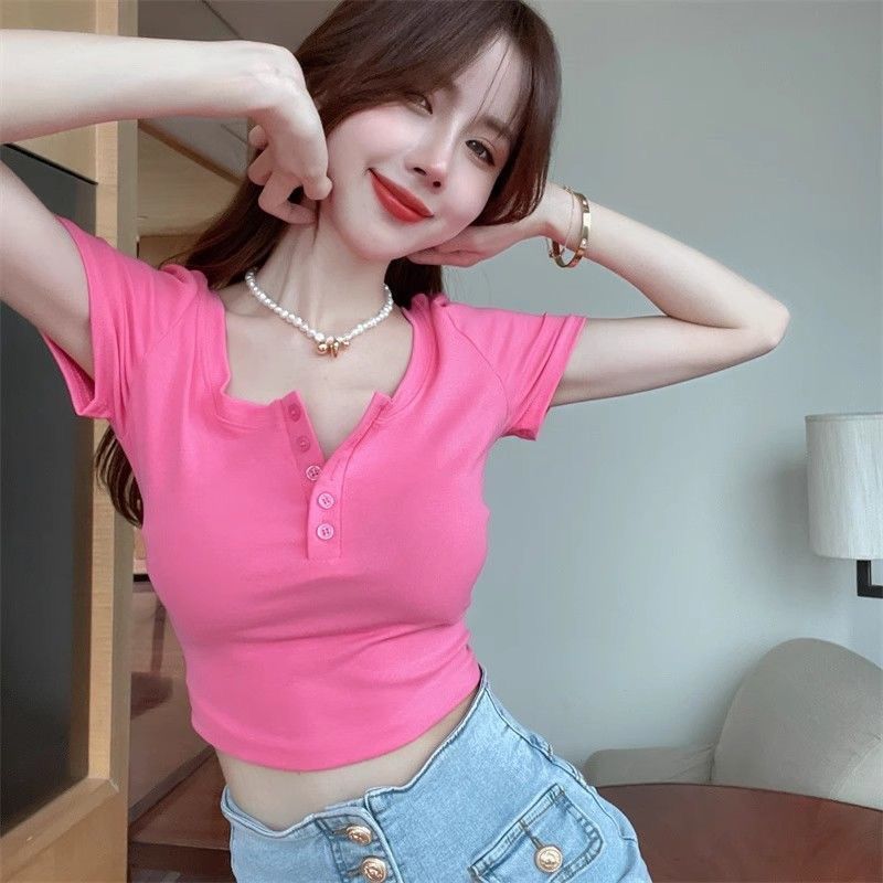 여름 여성을 위한 신축성 있는 타이트한 순수한 욕망 스타일 반팔 티셔츠, 슬림핏, 짧은 스타일, 하이웨이스트, 배꼽 노출, 패셔너블하고 연령을 줄여주는 핫걸 탑스토어 가기