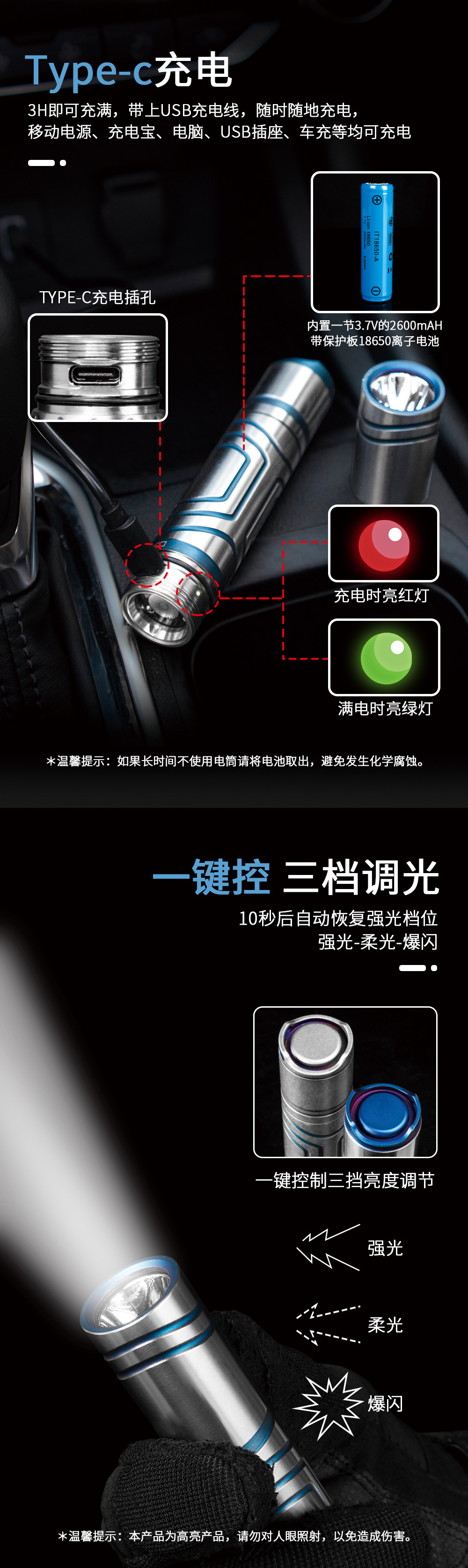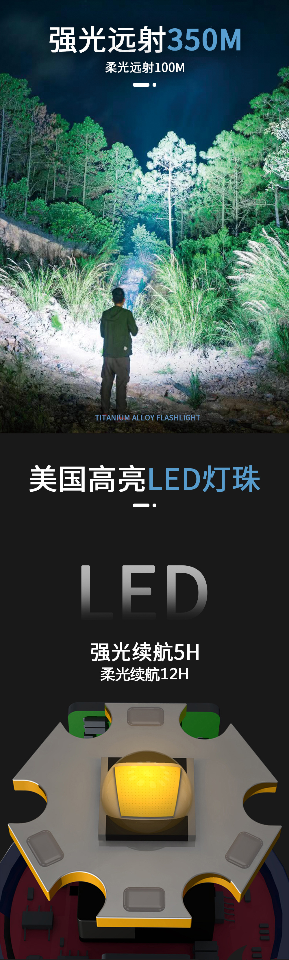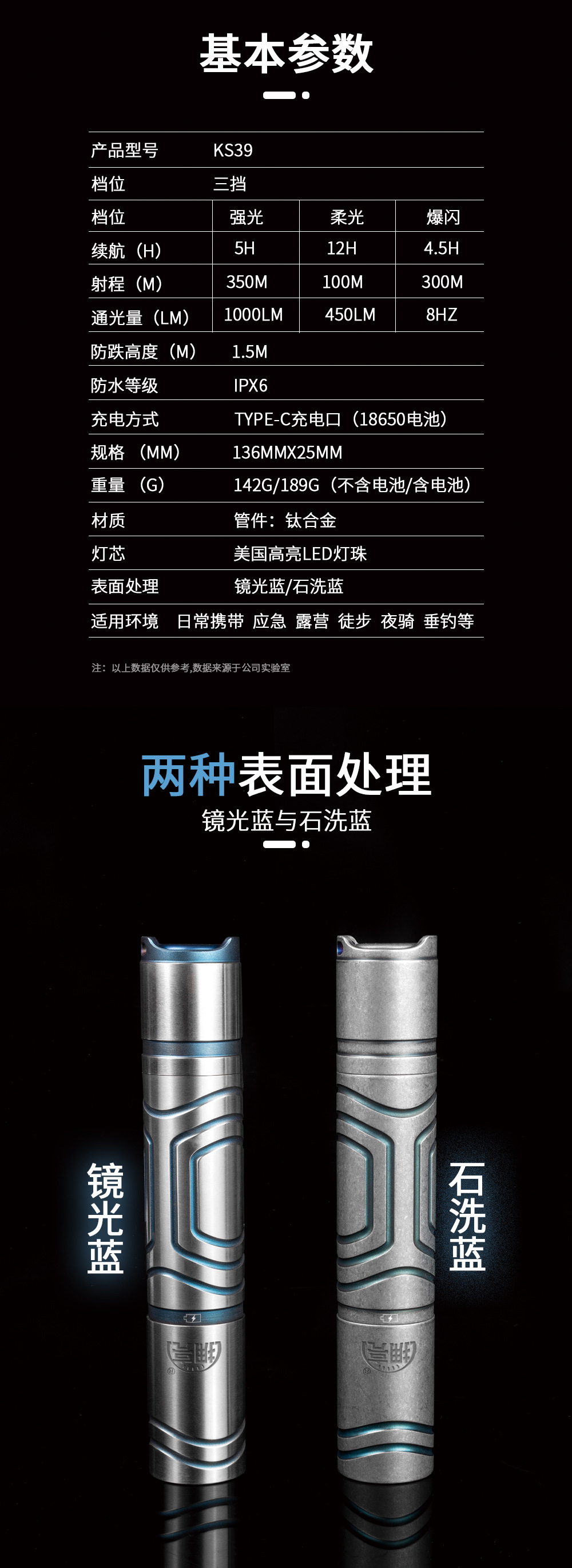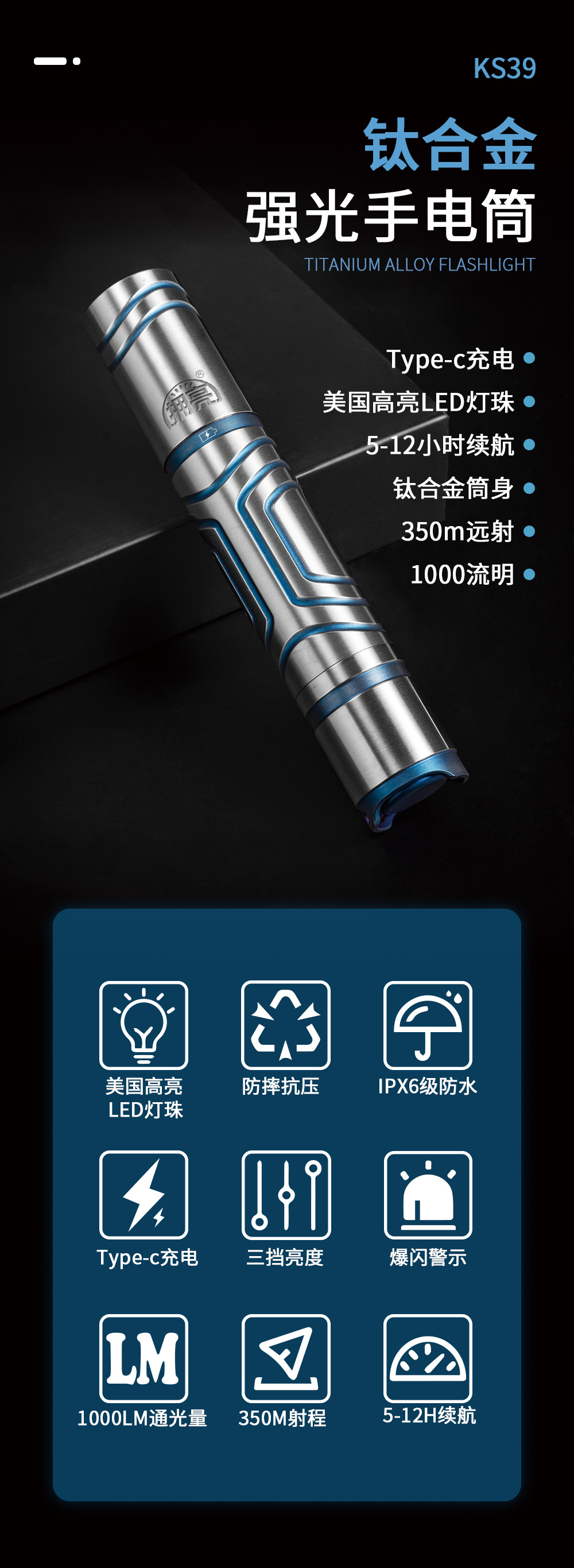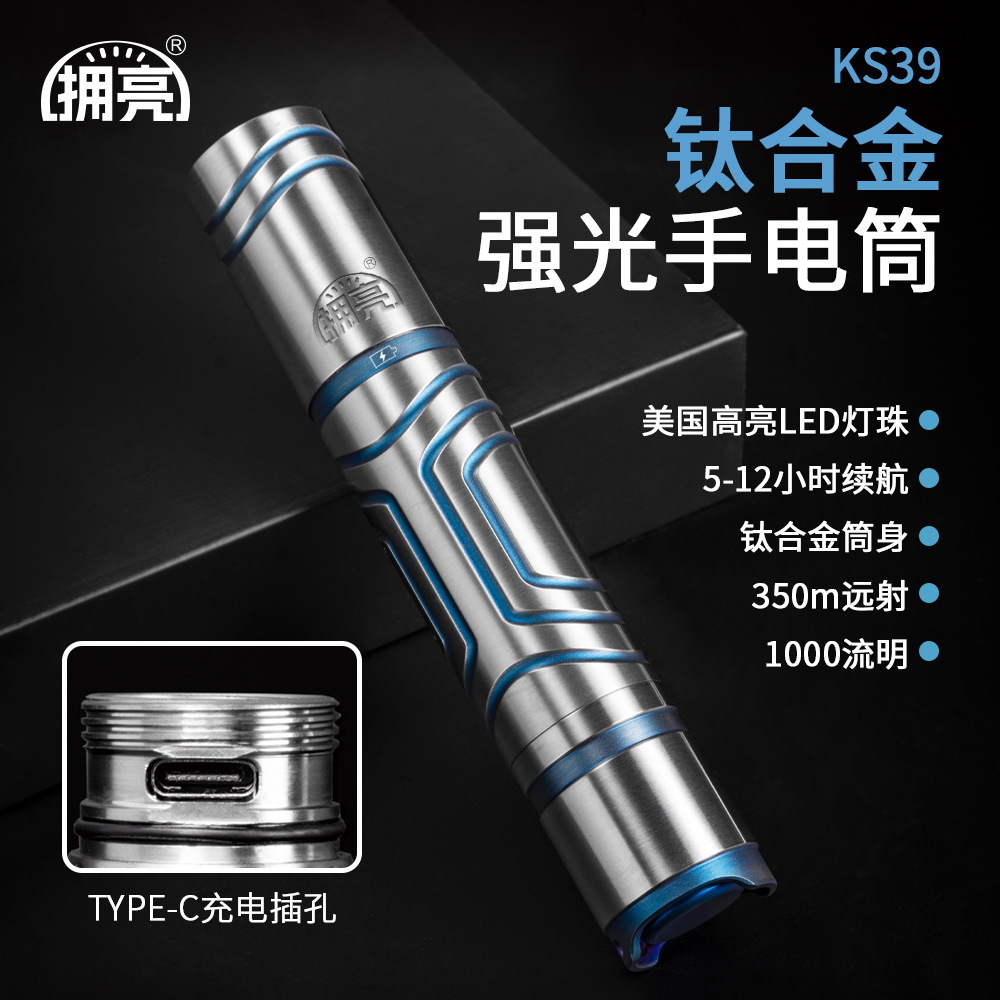 티타늄 합금 고휘도 LED 손전등 강한 빛 KS39 장거리 조명 Type-C 충전 휴대용 야외 비상