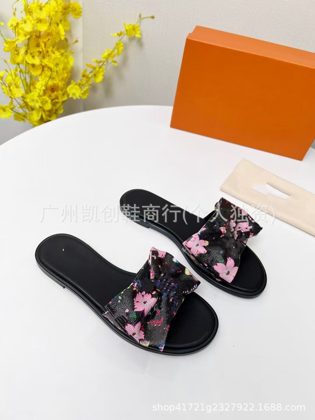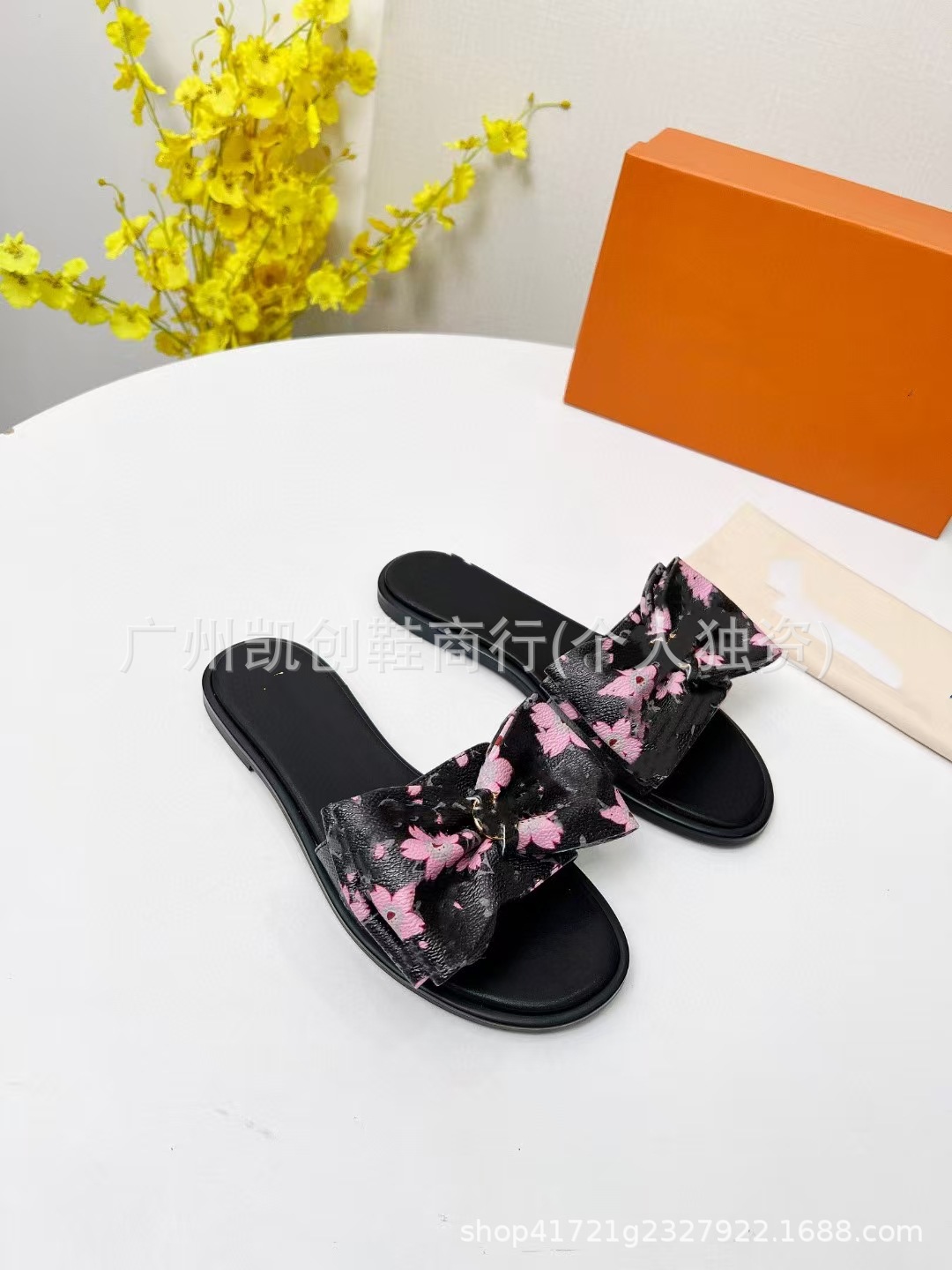 유럽과 미국의 2025 새로운 대형 플랫 슬리퍼 나비 매듭 패션 꽃 무늬 겉옷 프린트 원 스트랩 슬리퍼