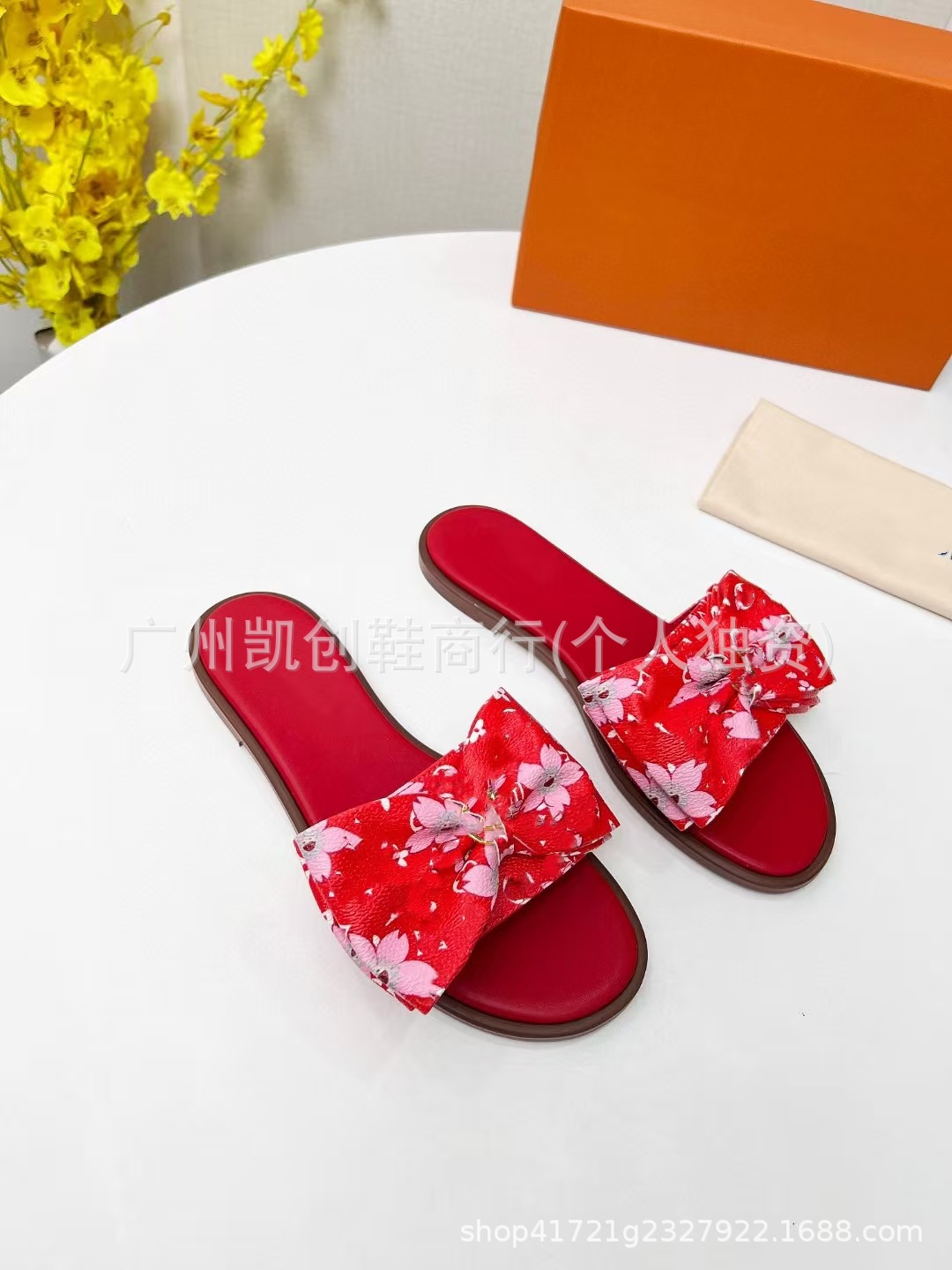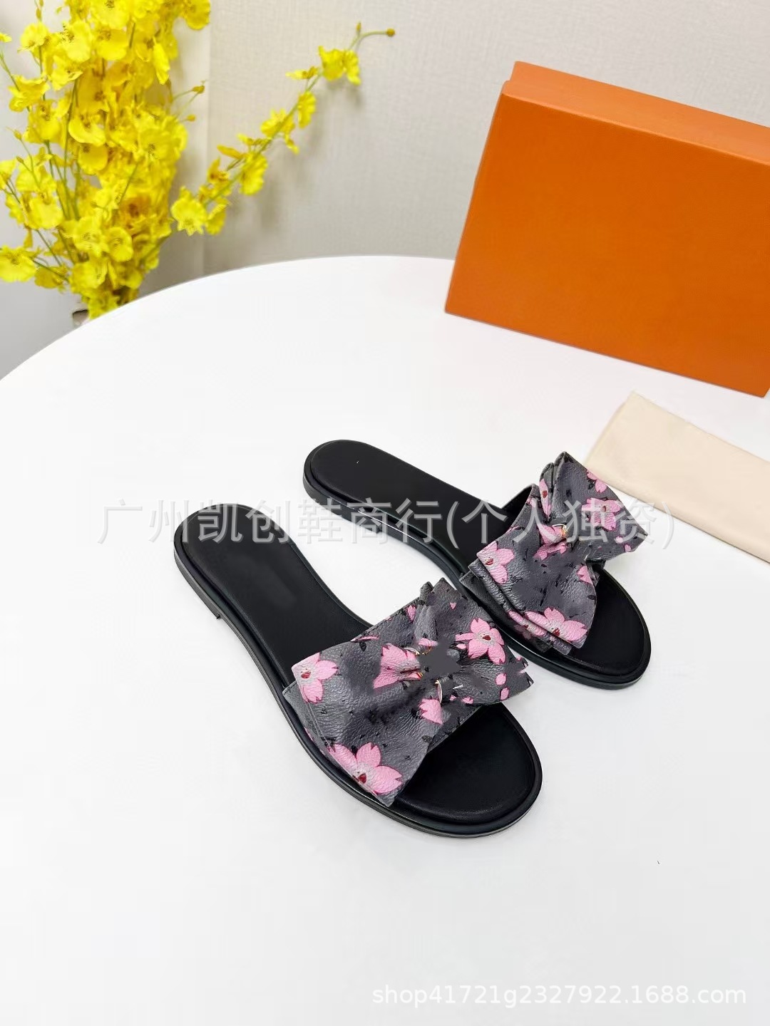유럽과 미국의 2025 새로운 대형 플랫 슬리퍼 나비 매듭 패션 꽃 무늬 겉옷 프린트 원 스트랩 슬리퍼스토어 가기