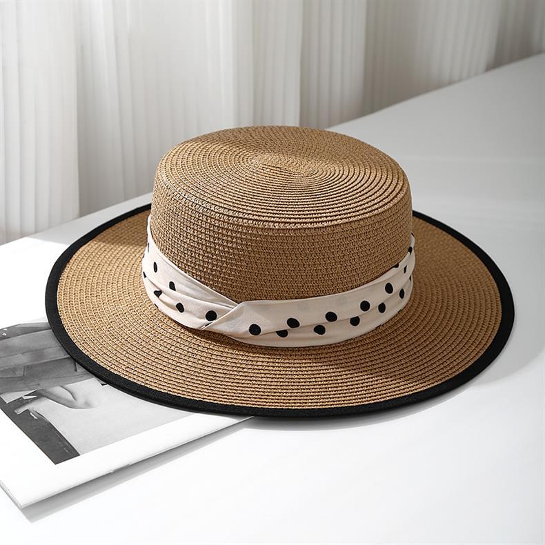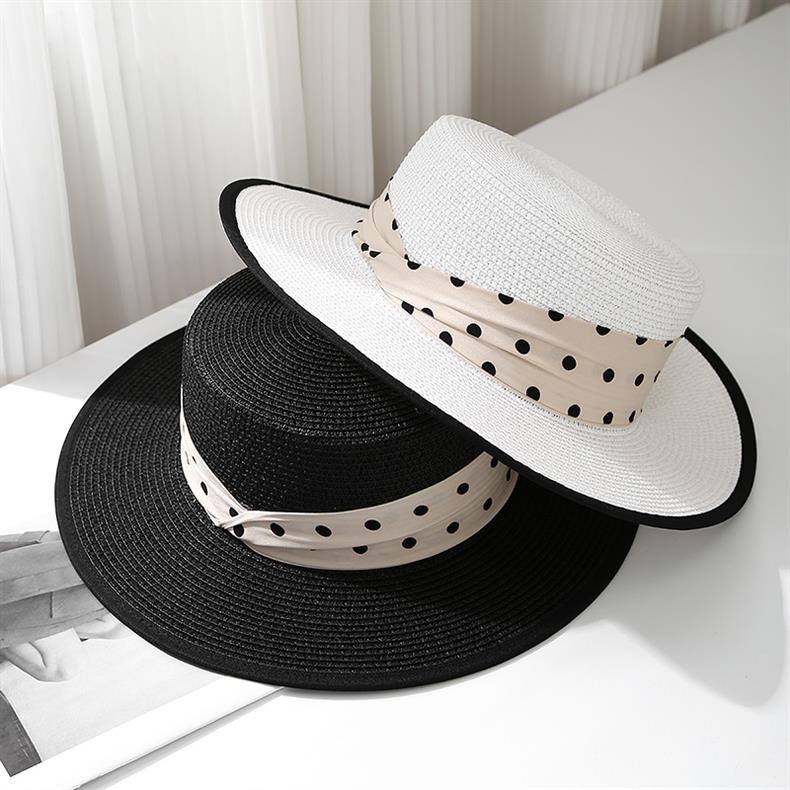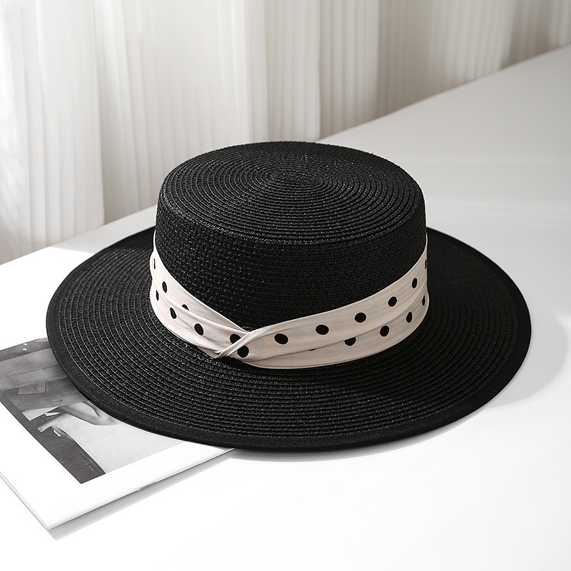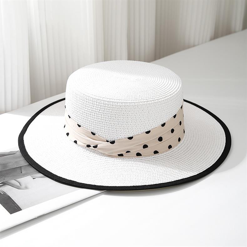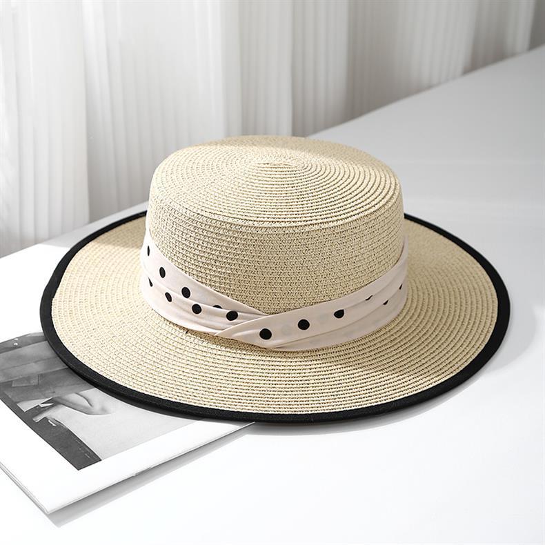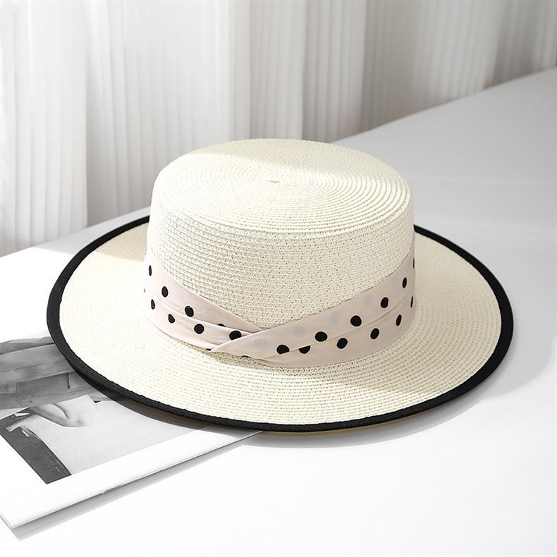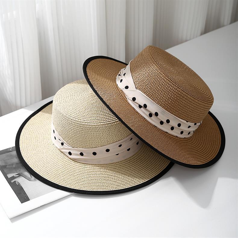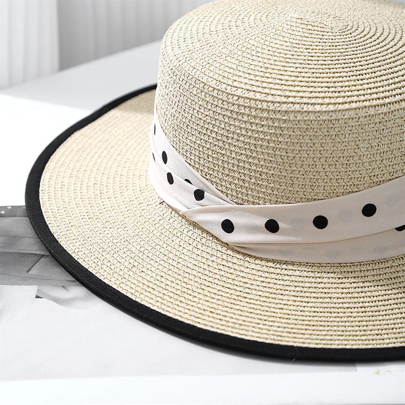 여름 프랑스 로맨틱 패션 폴카 도트 웨빙 플랫 탑 밀짚 모자 여성 해변 해변 사진 모자 유행스토어 가기