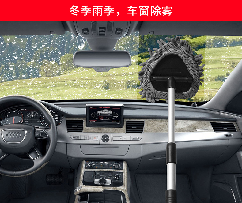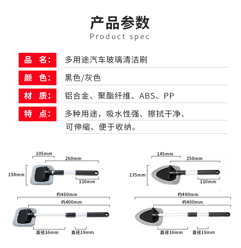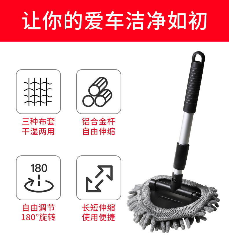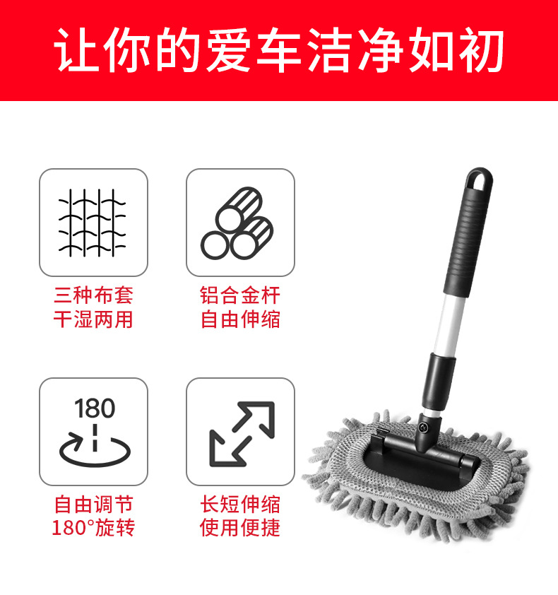 1、可伸缩铝合金杆,清洁范围大,可轻松擦洗车顶;